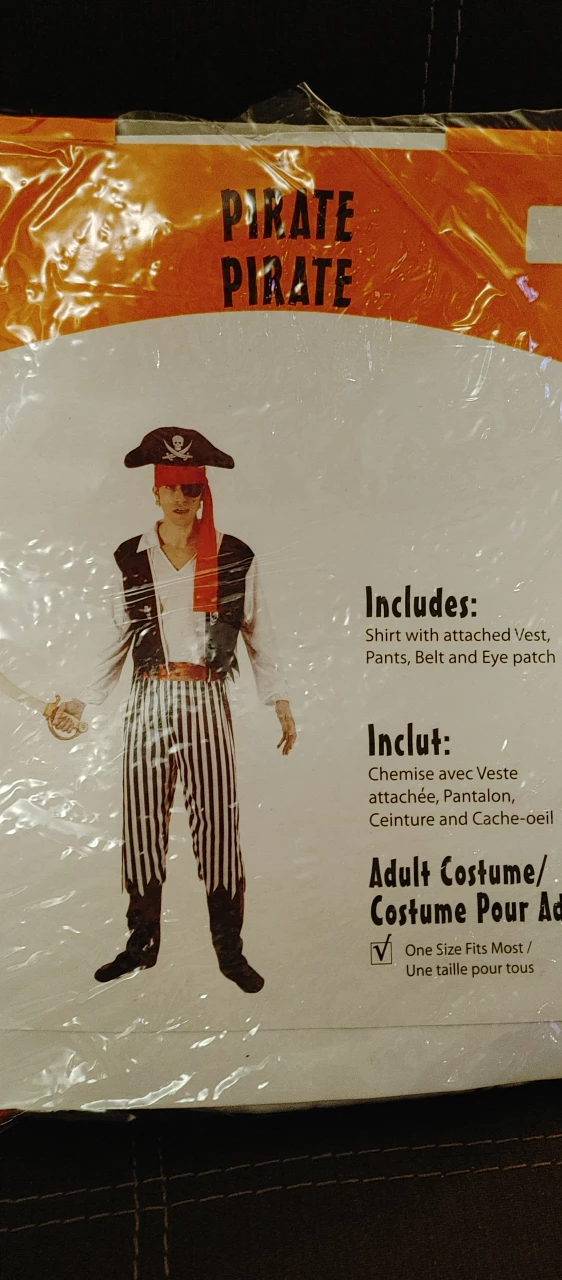 Adult man's Pirate costume for sale. Used once. Size adult one size. Includes: Shirt with attached vest, pants, red belt, and eye patch. New black bandana hat and red head band added for free. Pickup location Bathurst and Wilson.