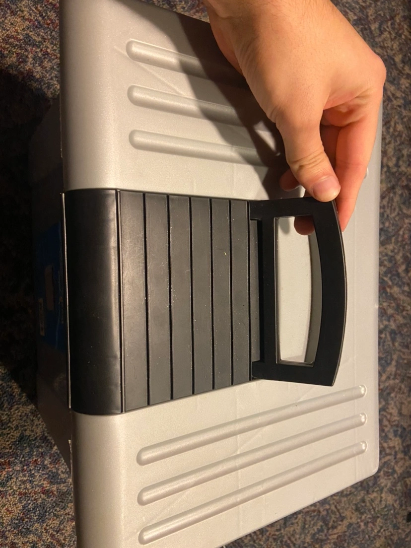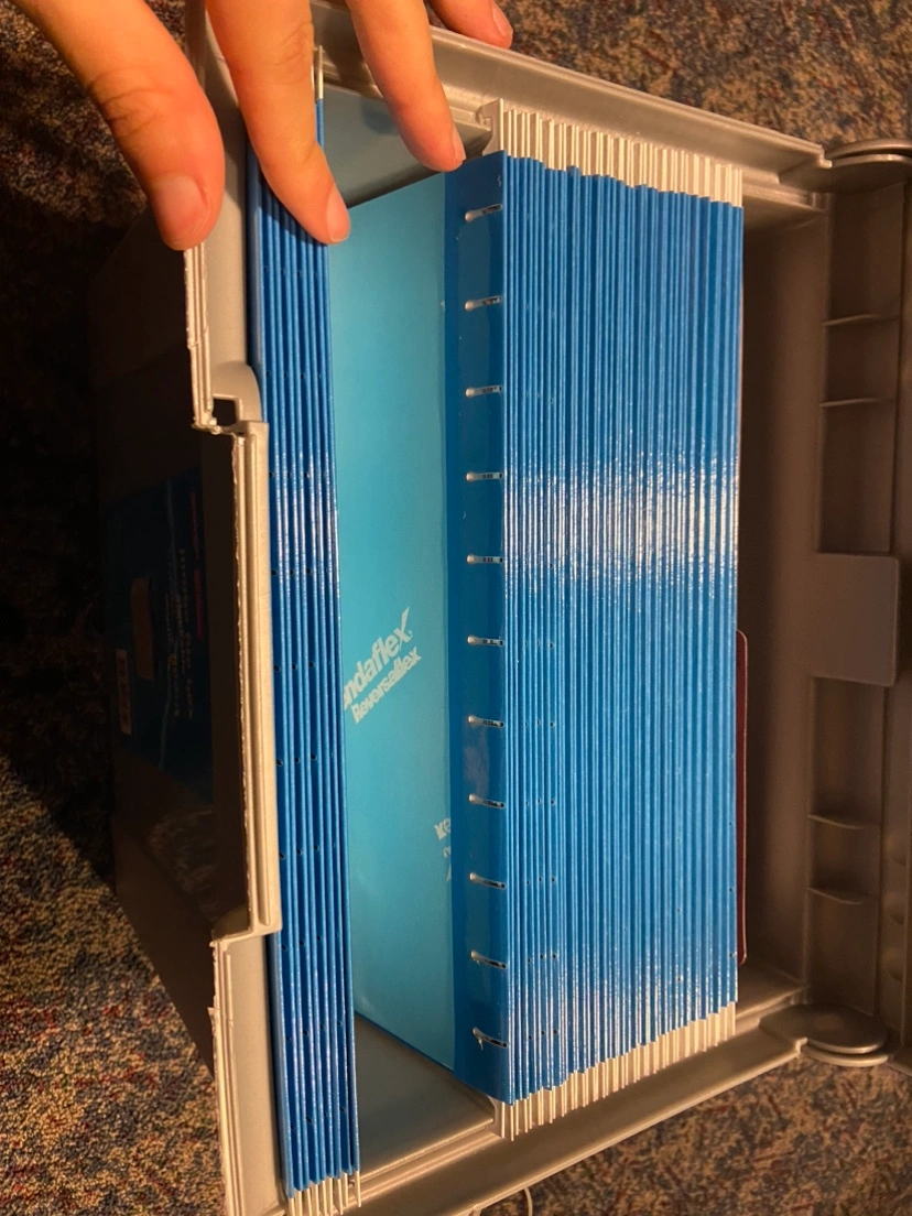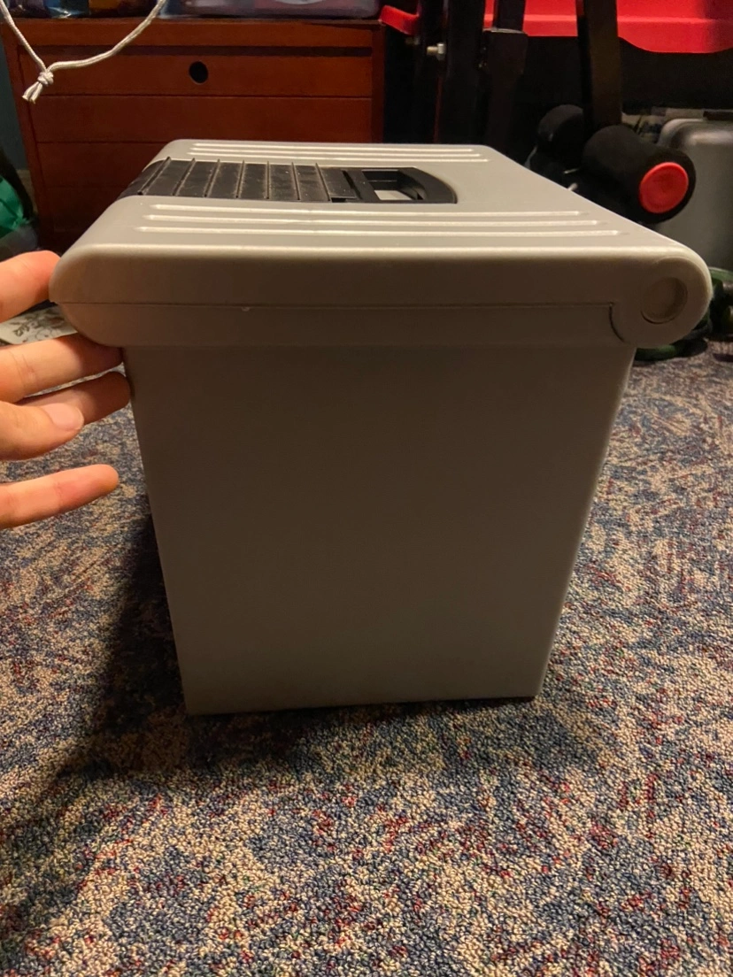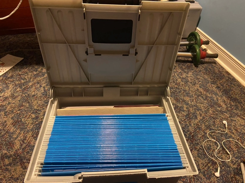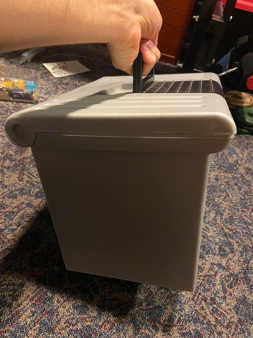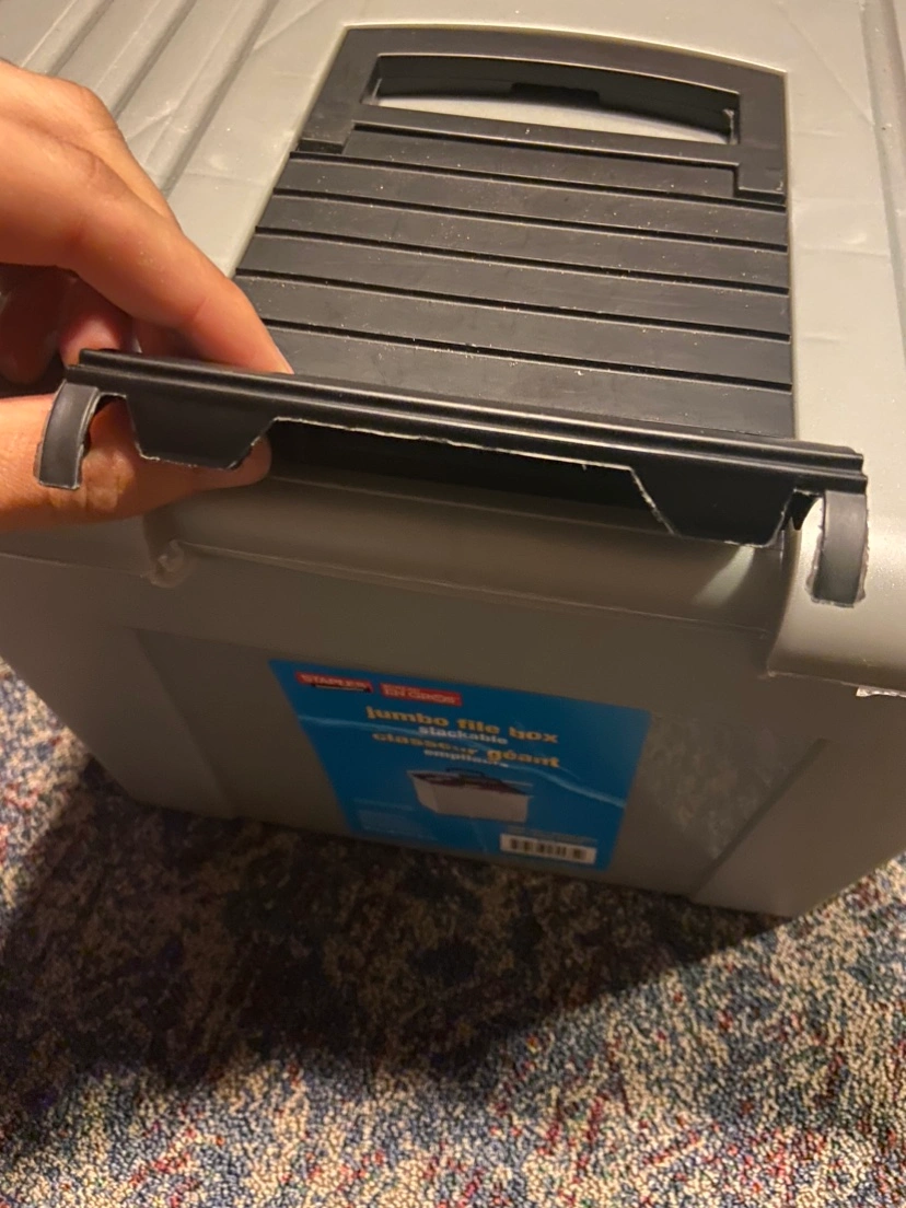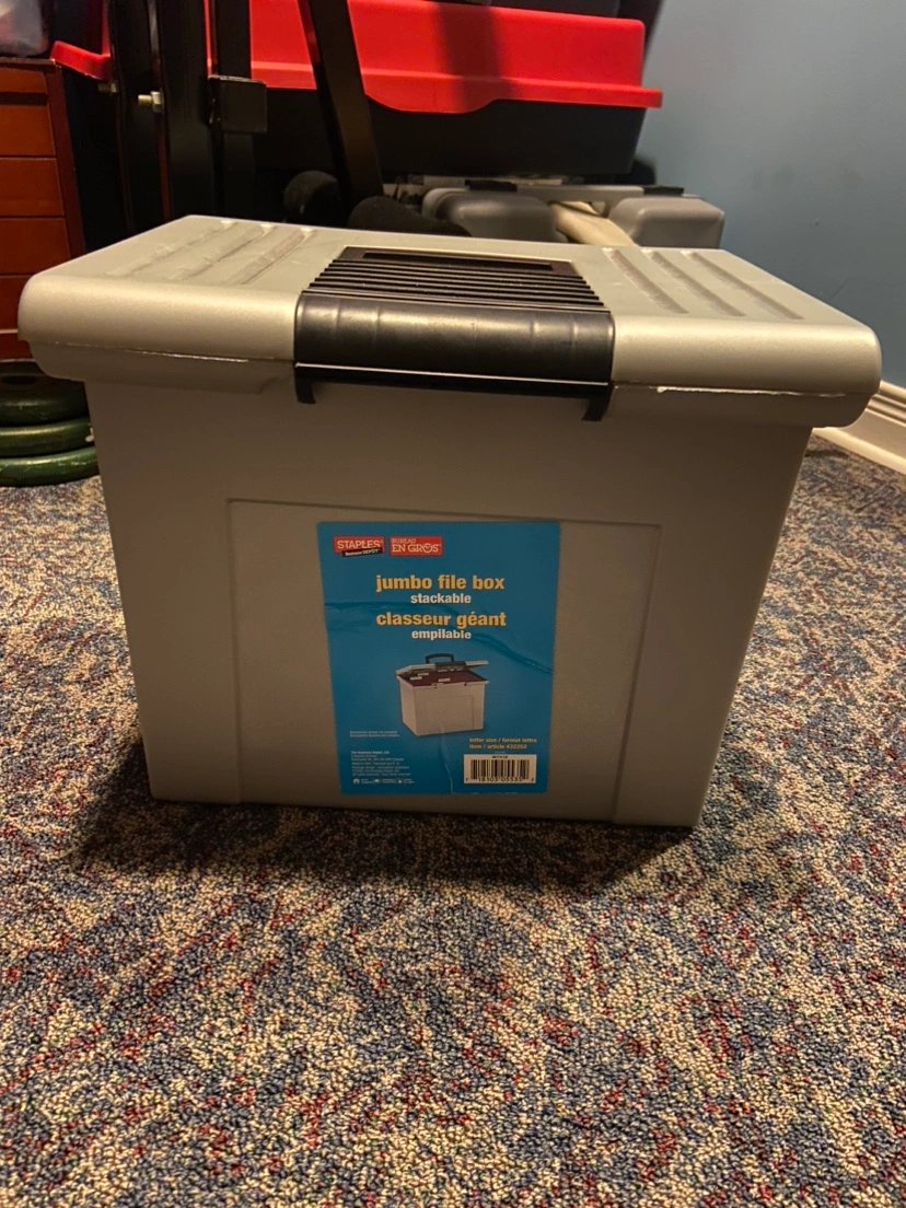 99Stackable file box with handle. Grey and black. Great for storing files, documents, and other items.some blank papers and a notebook thrown in there too Major intersections are burnhamthorpe and confederation parkway Mississauga