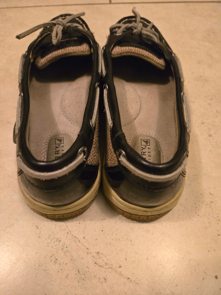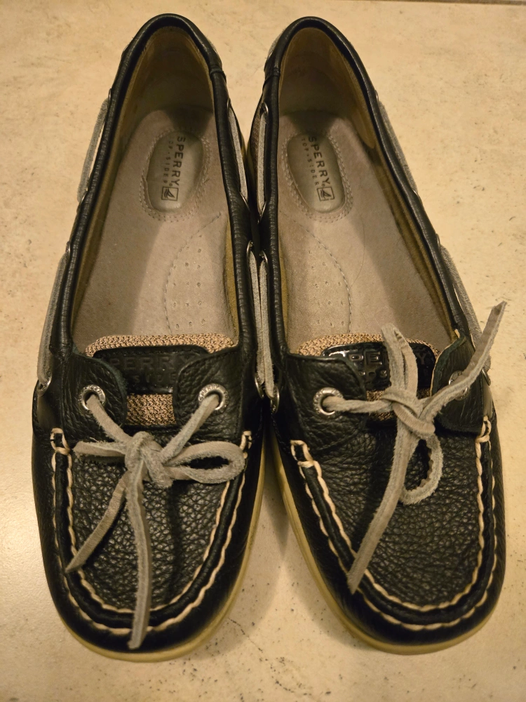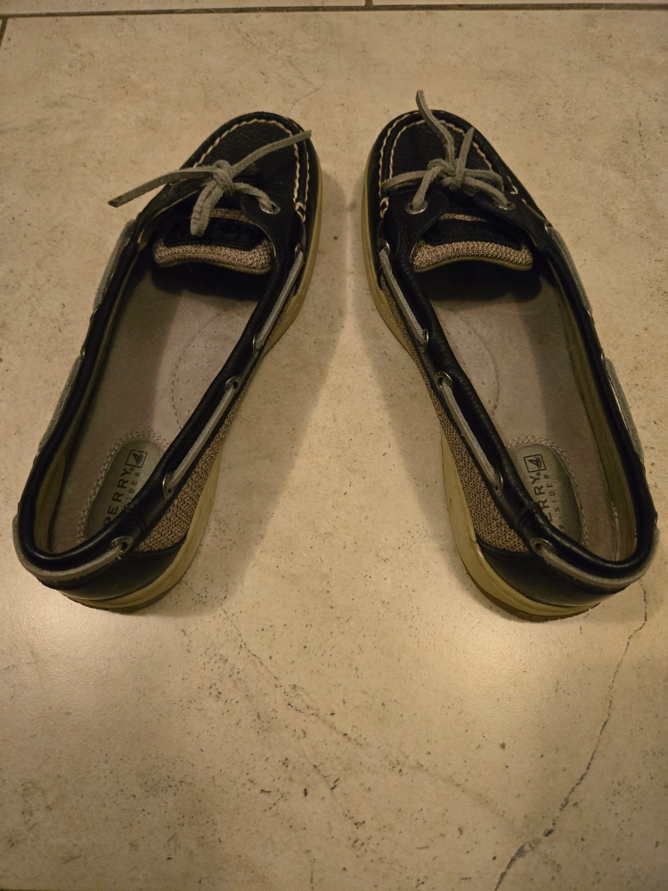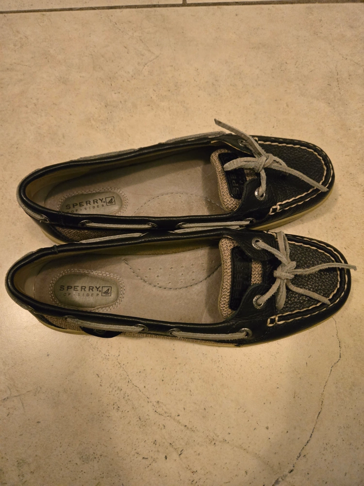 Near-new dark blue leather boat shoes with grey laces. Too big for me, even with an insole (size 6.5M). Happy to trade for size 5.5 or 6 Sperry's or something else I want/ need!
