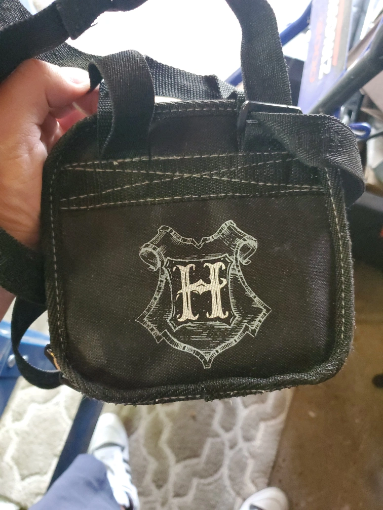 Small black bag with a zipper closure. Features Norbert the Dragon on the front. The bag is about the size of a lunch bag. It can be worn as a shoulder bag. pick up in markham