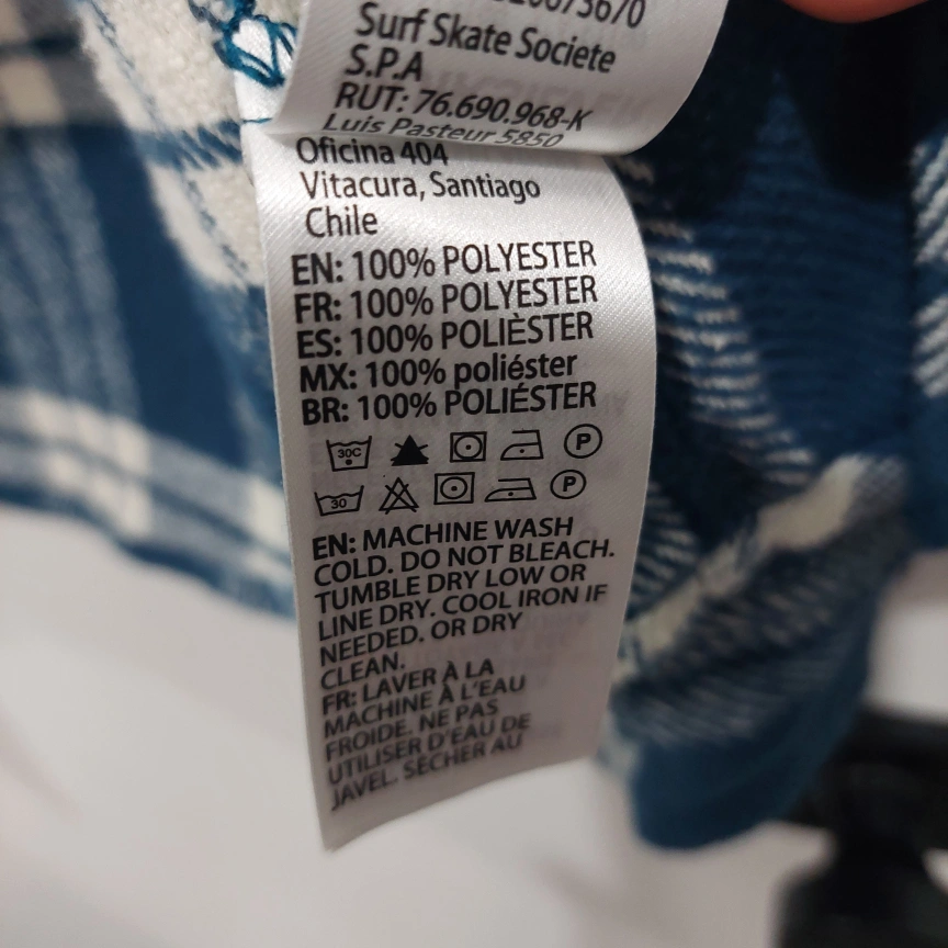 A Long-sleeved blue and white plaid flannel shirt is a regular comfort fit anti-wrinkle lightweight poloynosic polyester with a slub texture .