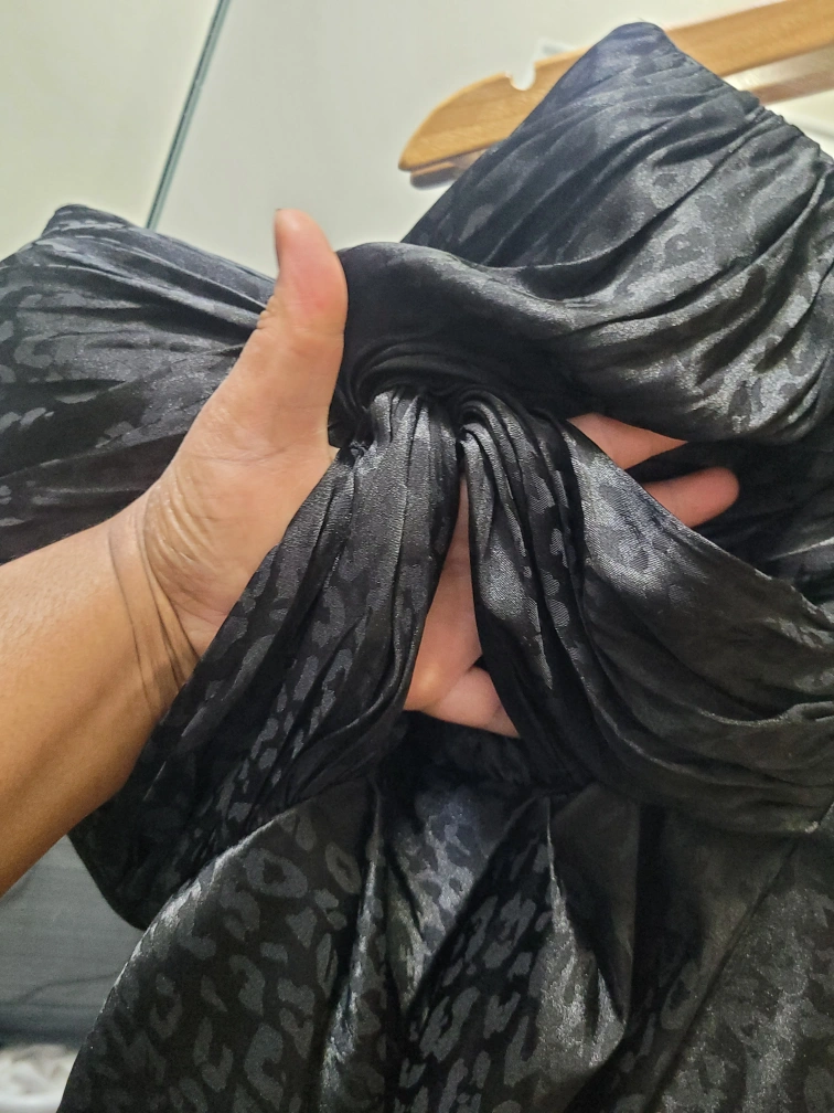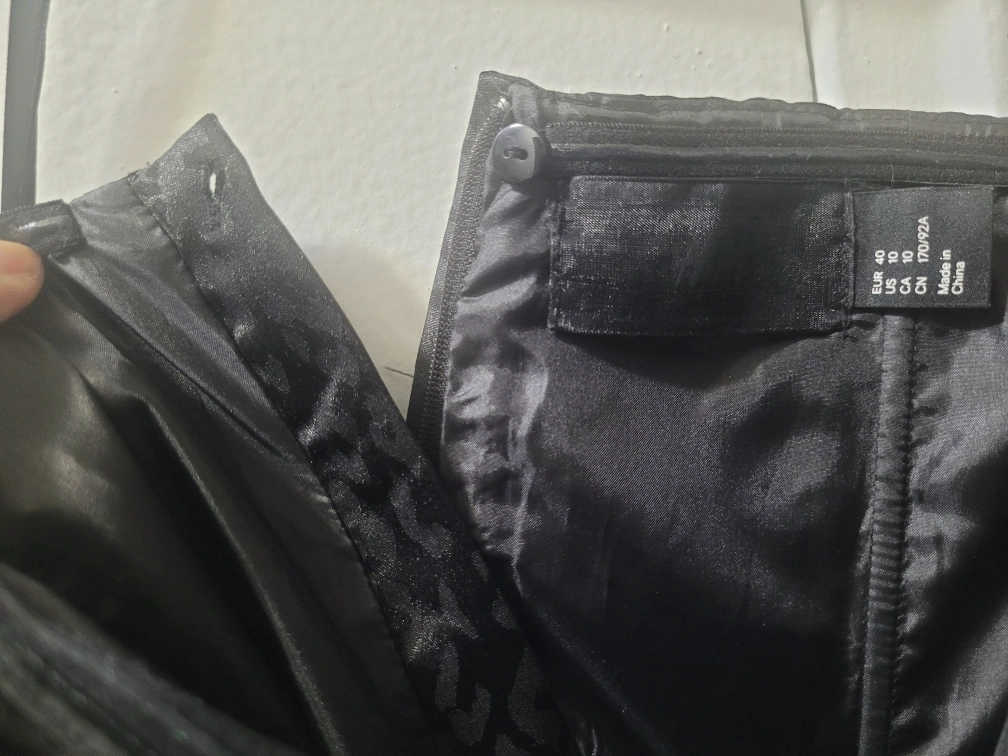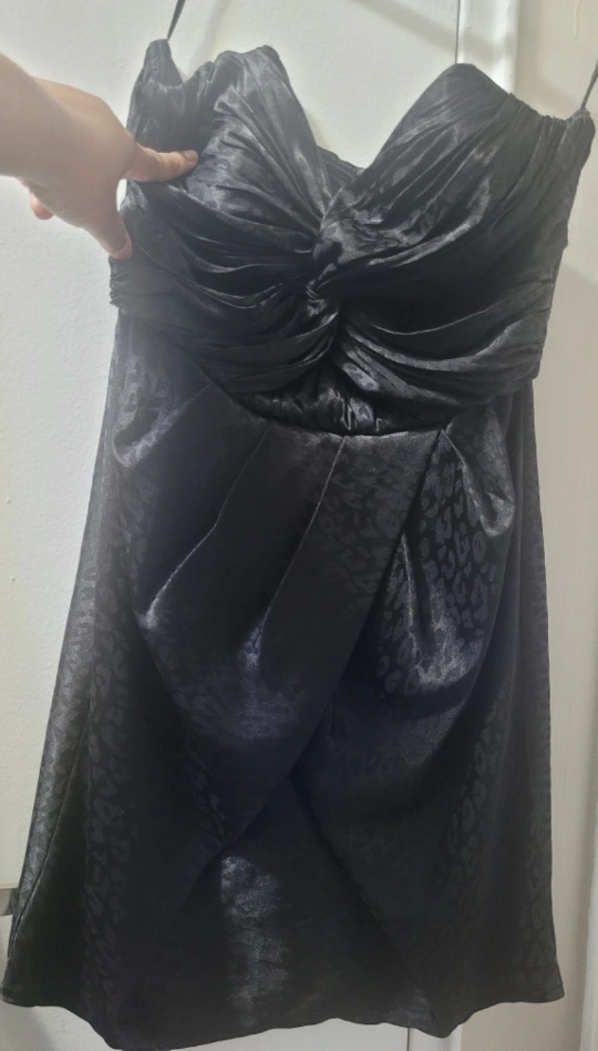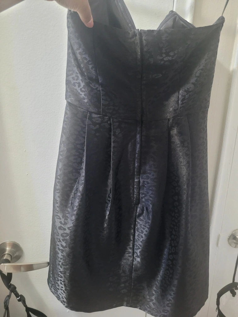Strapless black dress with a leopard print pattern. The dress is fitted in the bodice and flows out at the bottom. The fabric is a silky satin. Zipper closure at the back.