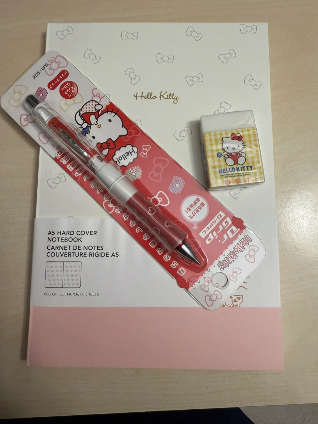 Cute Hello Kitty notebook, 80 sheetsz Perfect for bullet journaling or just for notes. Includes Hello Kitty mechanical pencil and eraser. Available to meet along Canada line