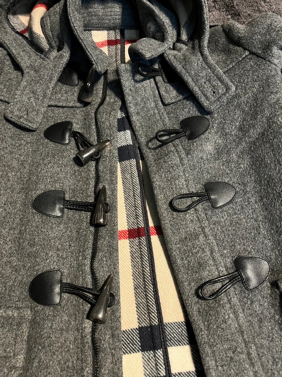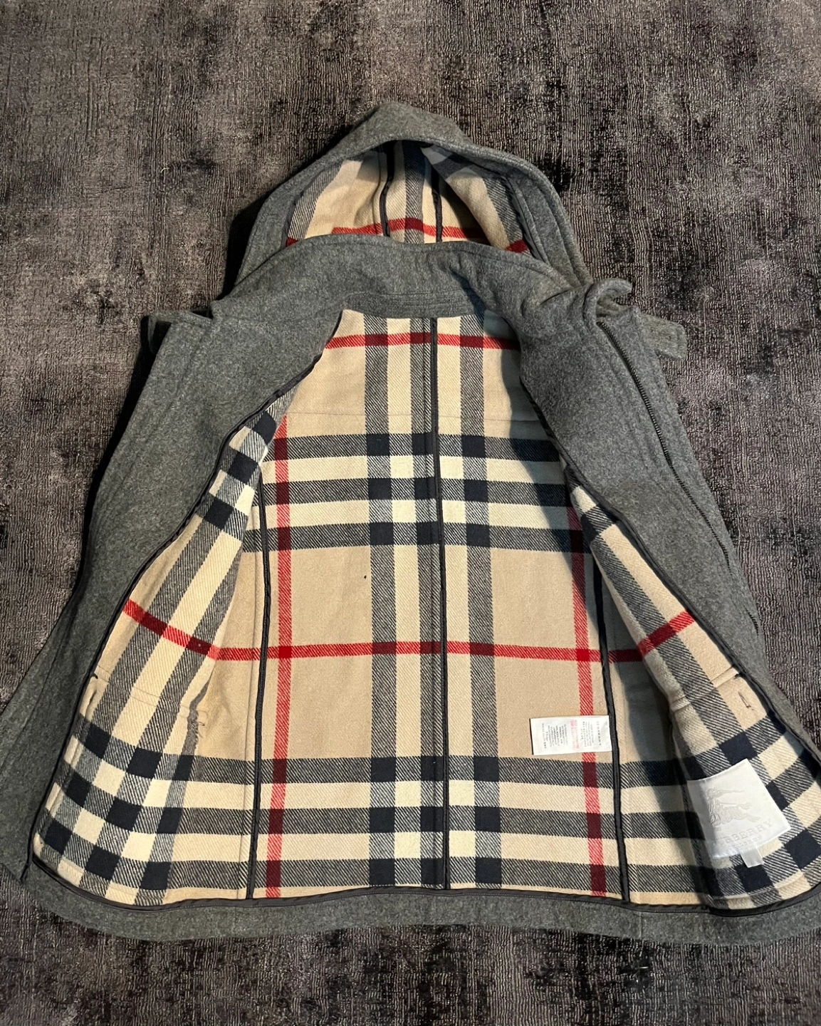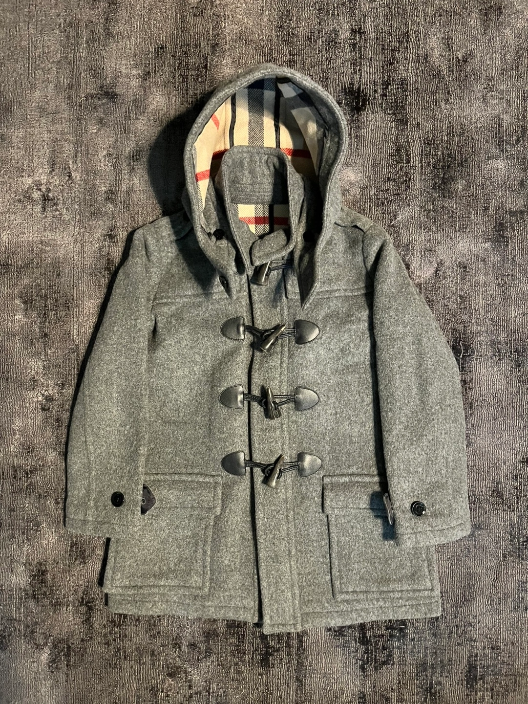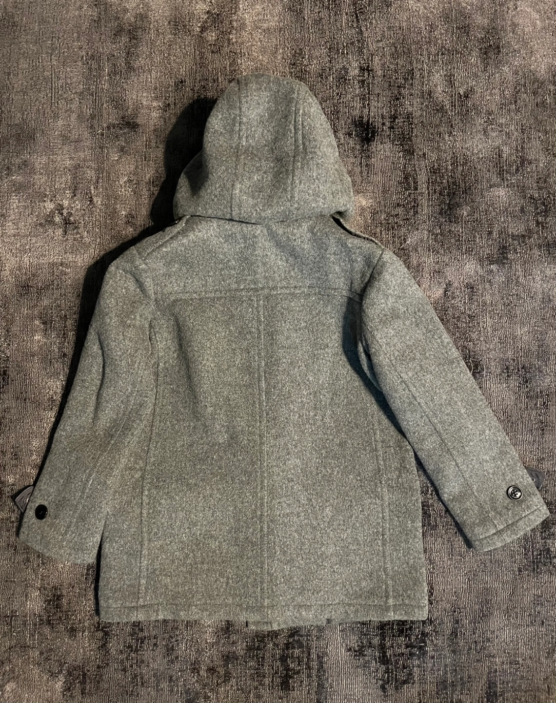 Classic grey duffle coat in size 8. Perfect fit for 7-8 year olds. In excellent condition, except there’s a tiny hole in the interior (as shown in the last picture).