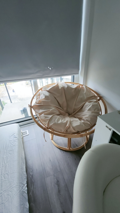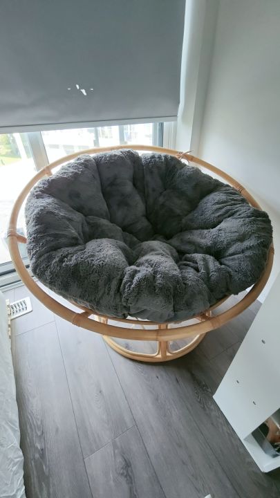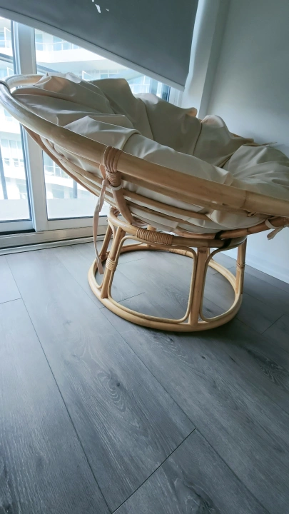 Round papasan bamboo chair with a beige cushion. The chair and cushion and WP cover are in good condition. Comes with cushion and water proof cushion cover