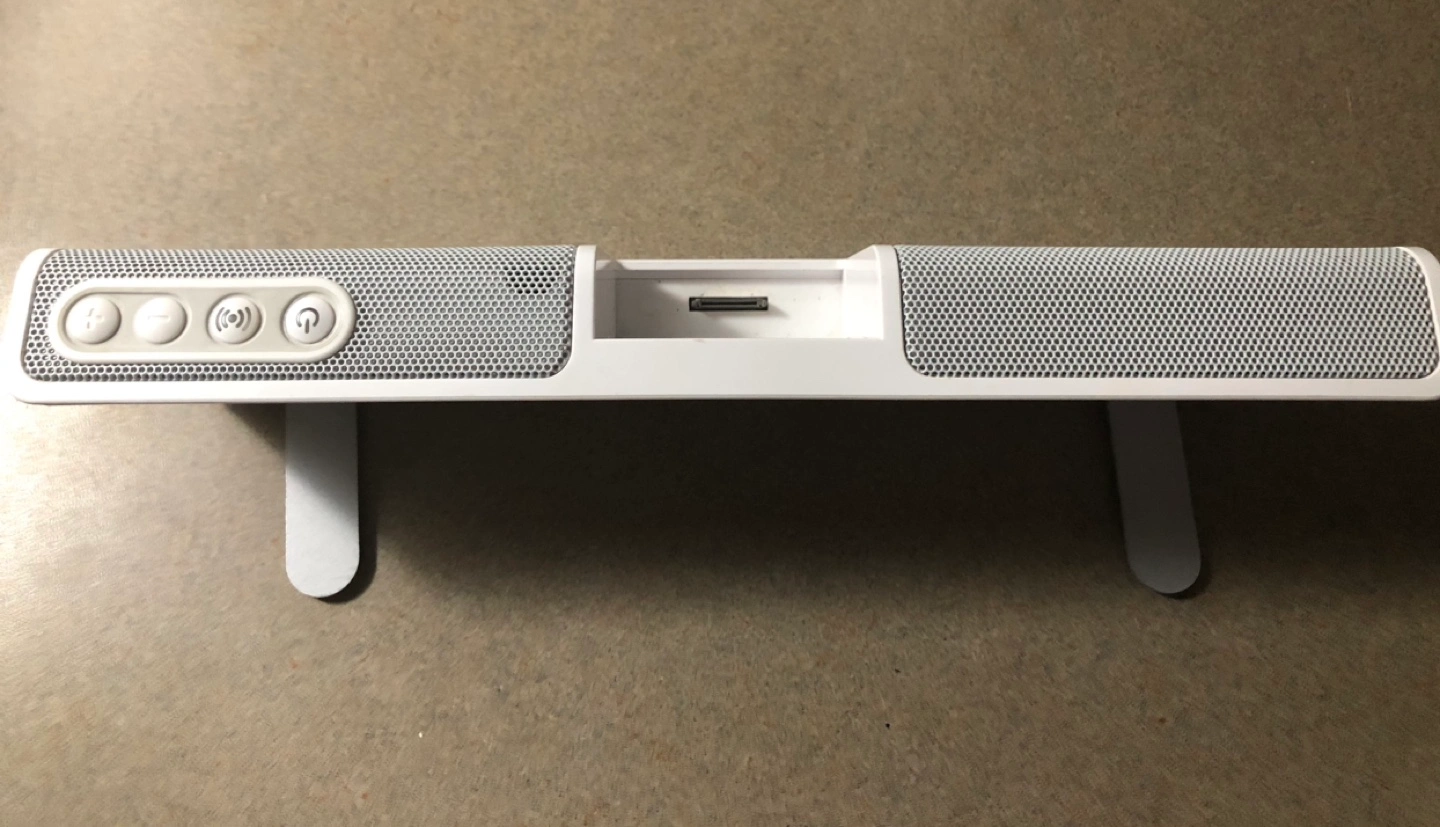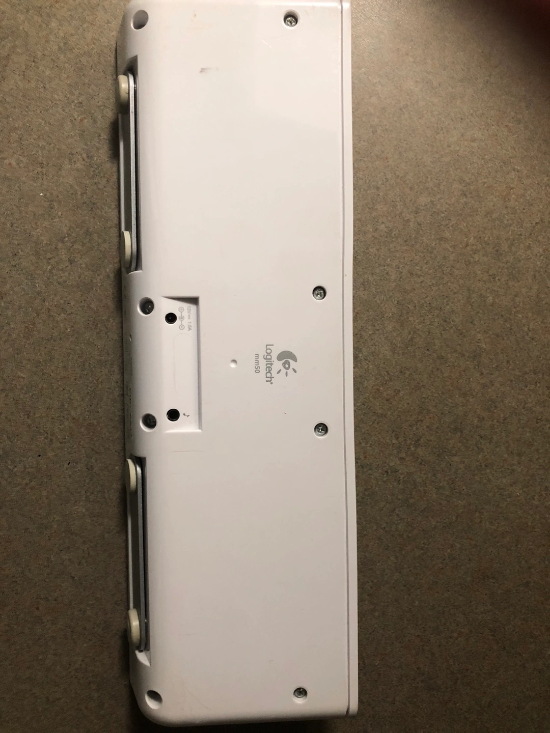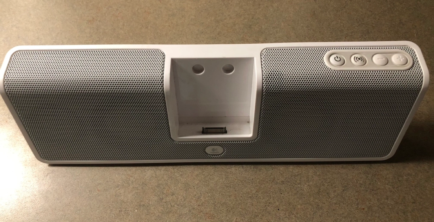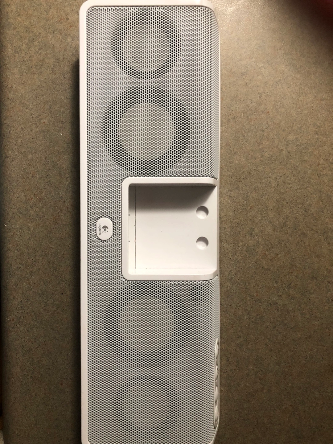 White Logitech mm50 charger and speaker for iPod. Includes carrying case.