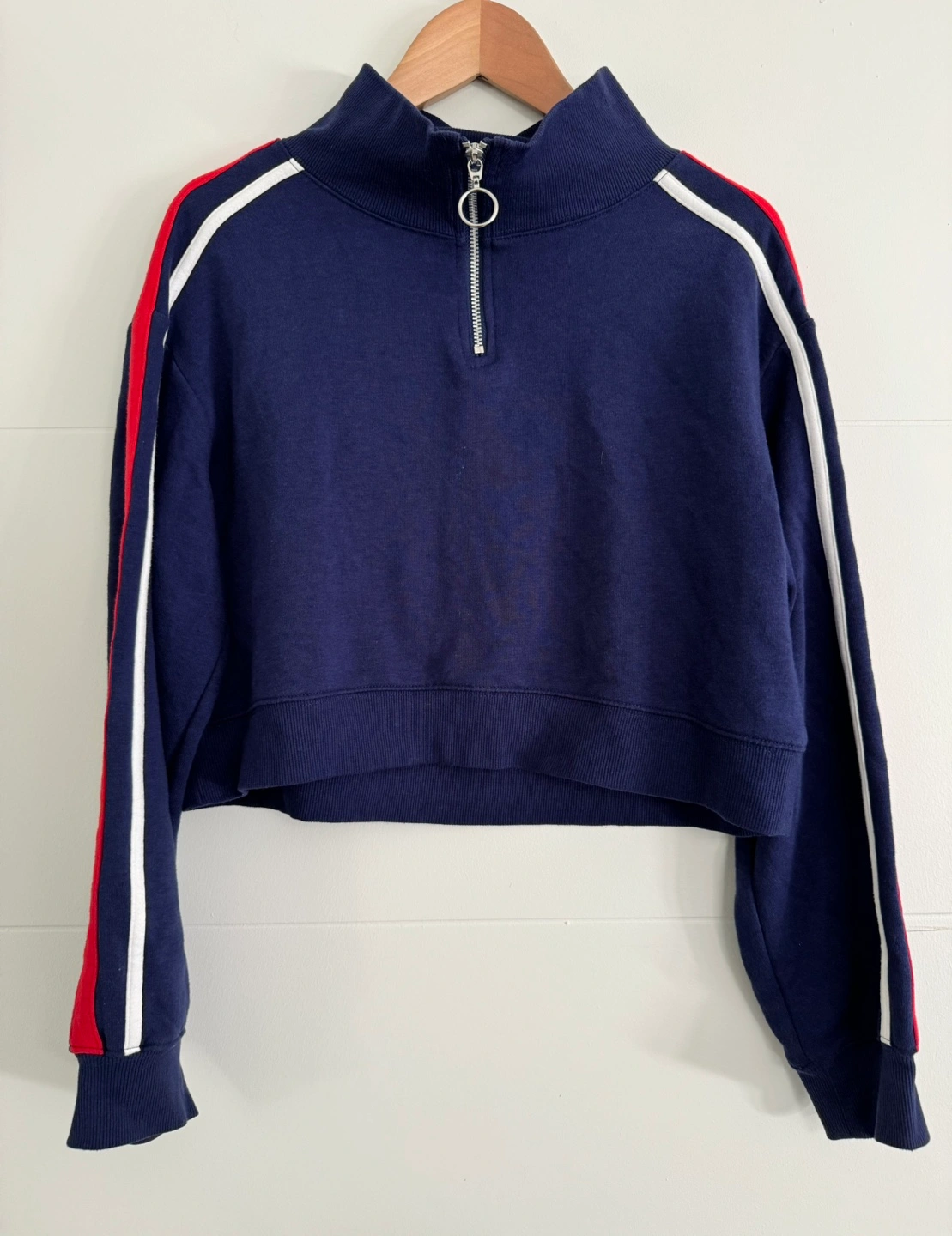 Soft, comfortable quarter zip sweater with red and white stripes along the arm. Hardly worn, just been sitting in my closet. Slightly oversized fit, hits at the waist.