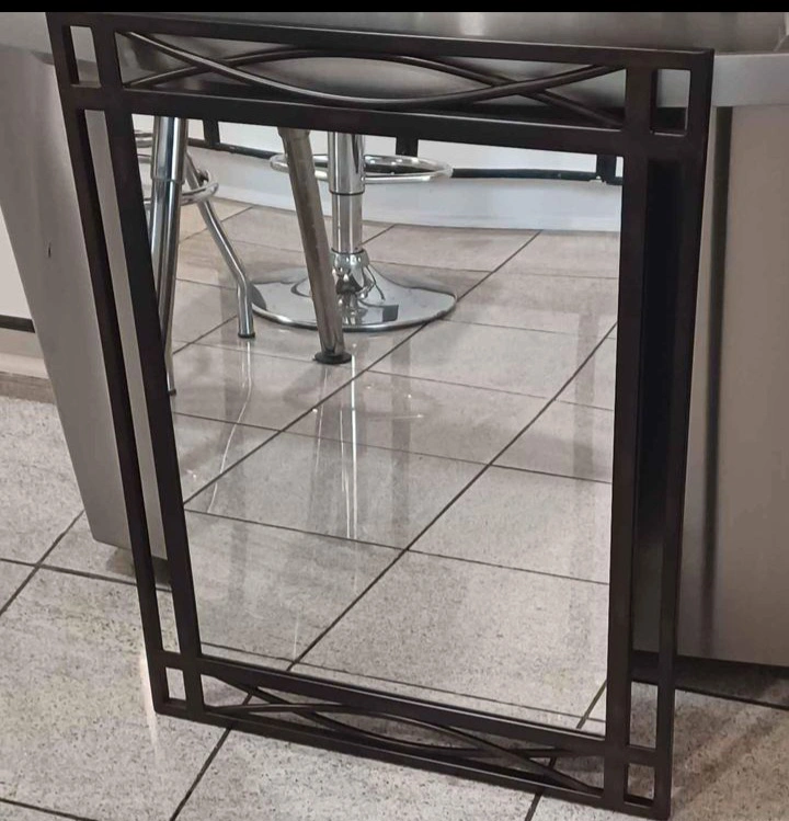 Large black metal framed mirror. Features a decorative wave design around the frame. Hangs with D-rings .