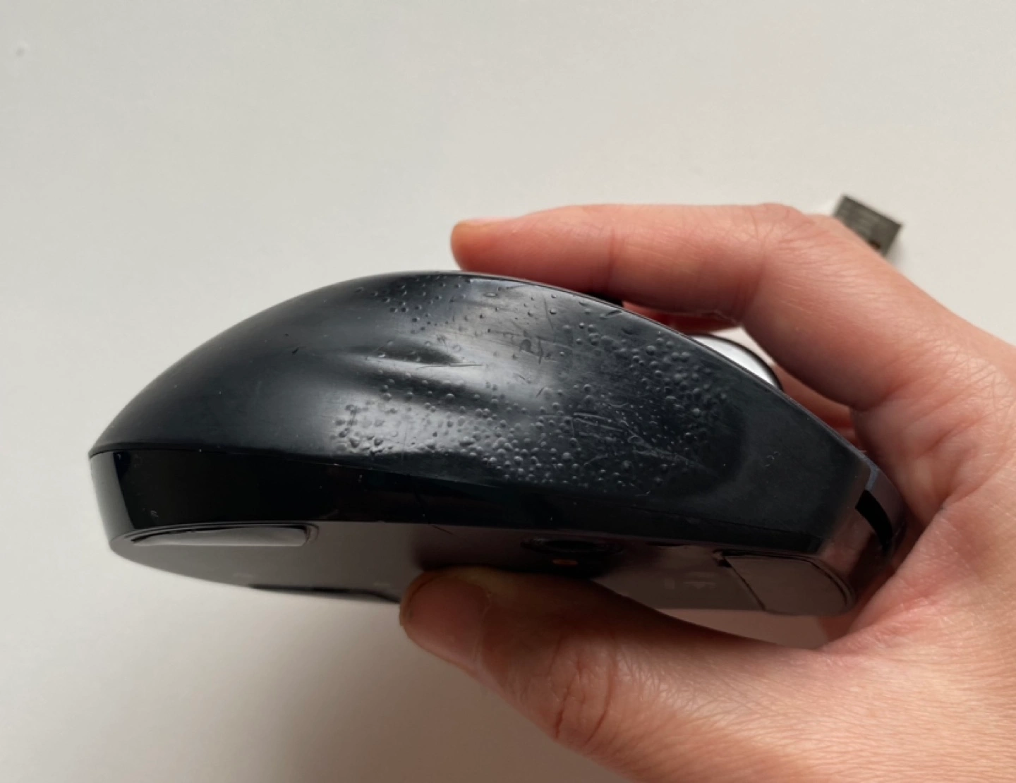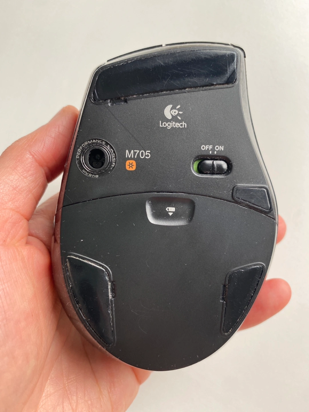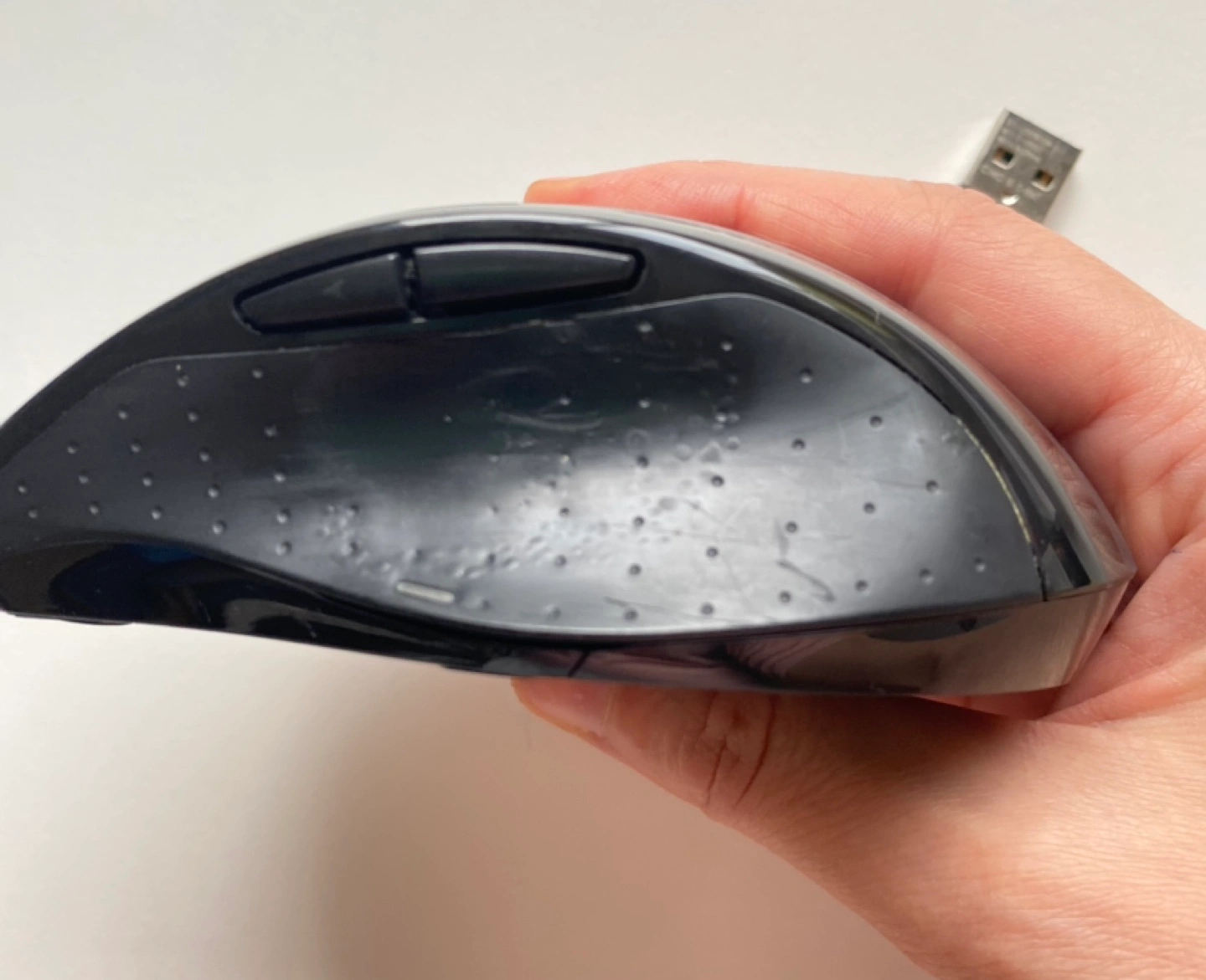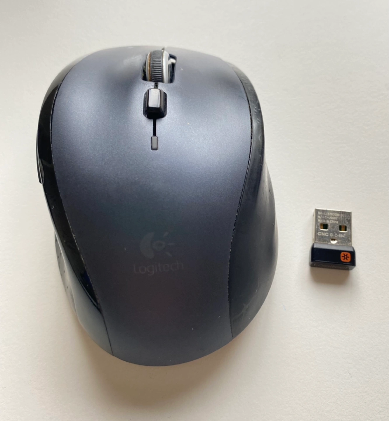 Wireless mouse with USB receiver. Has some wear and tear, but it’s working perfectly.