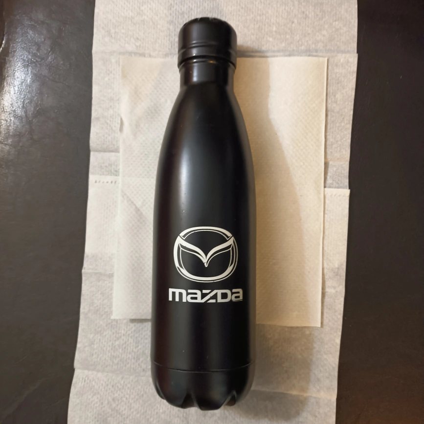1000+Black water bottle with Mazda logo.