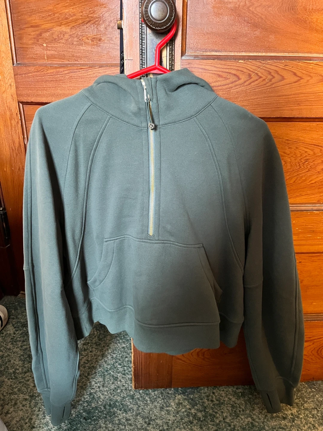 This is a Lululemon half zip hoodie in a dark green colour. It's a cropped style with a kangaroo pocket. It's made from a soft cotton blend.