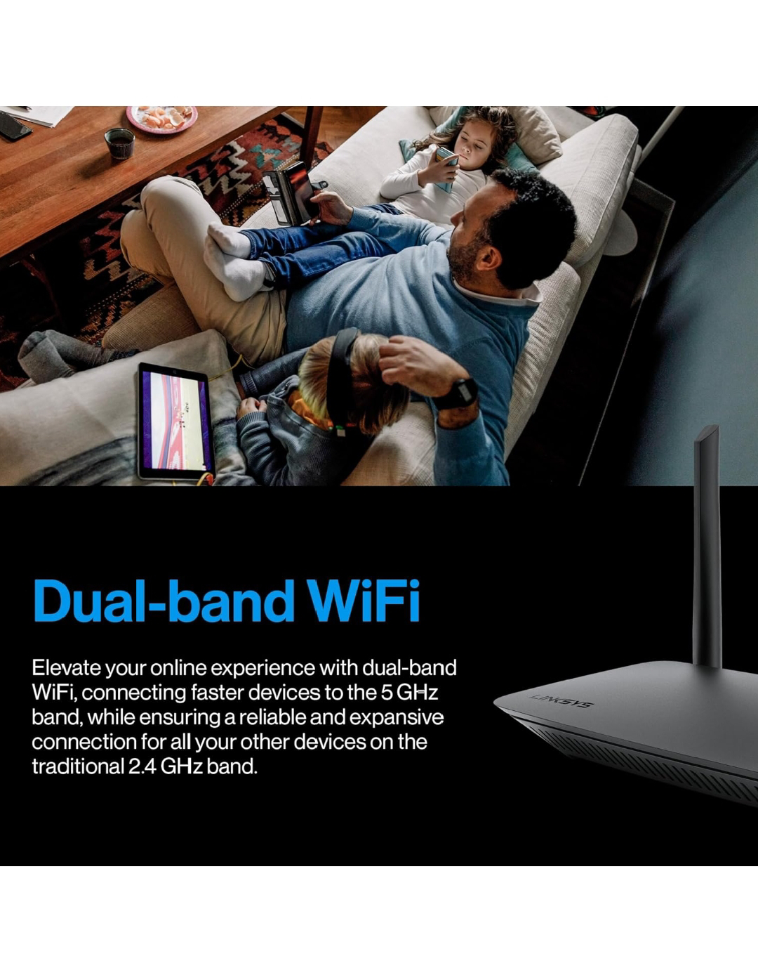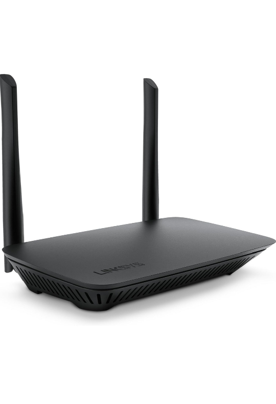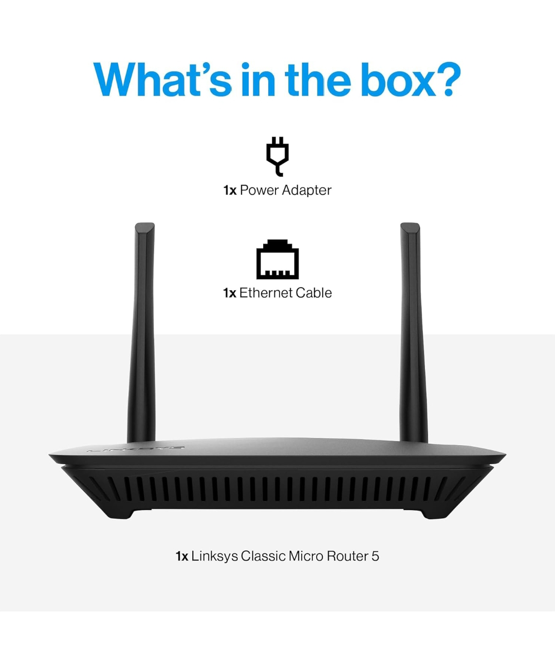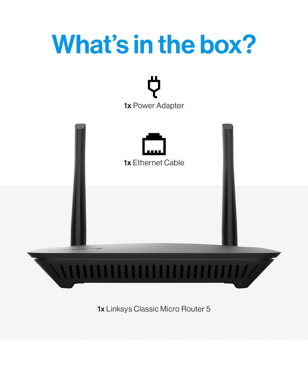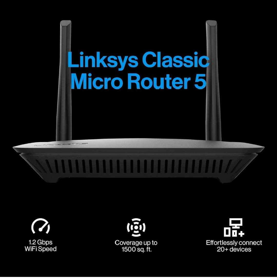 Black router with dual band WiFi, adjustable external antennas and Beamforming technology. Easy setup and parental controls. Linksys Classic Micro Router 5 | WiFi 5 | Dual Band | 1500 sq.ft. | 10+ Devices | 1.2 gbps.