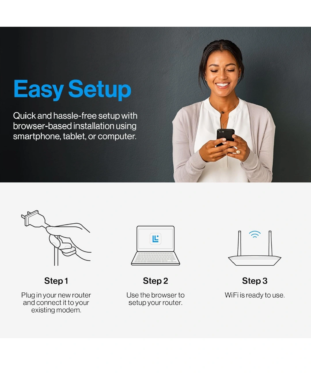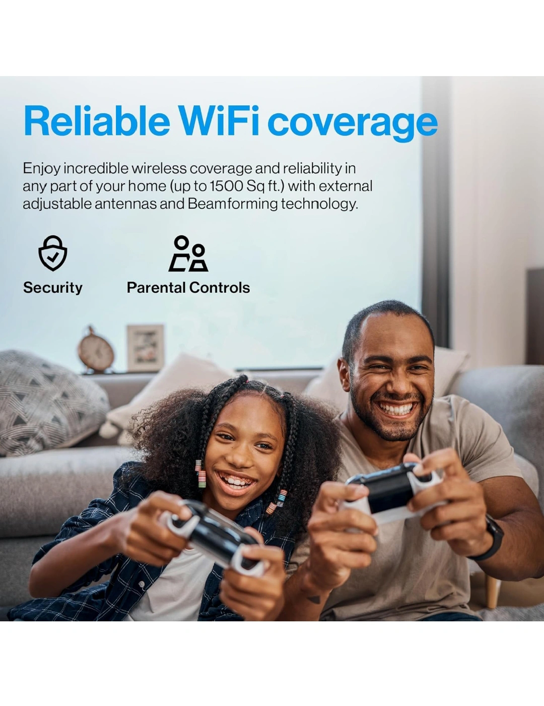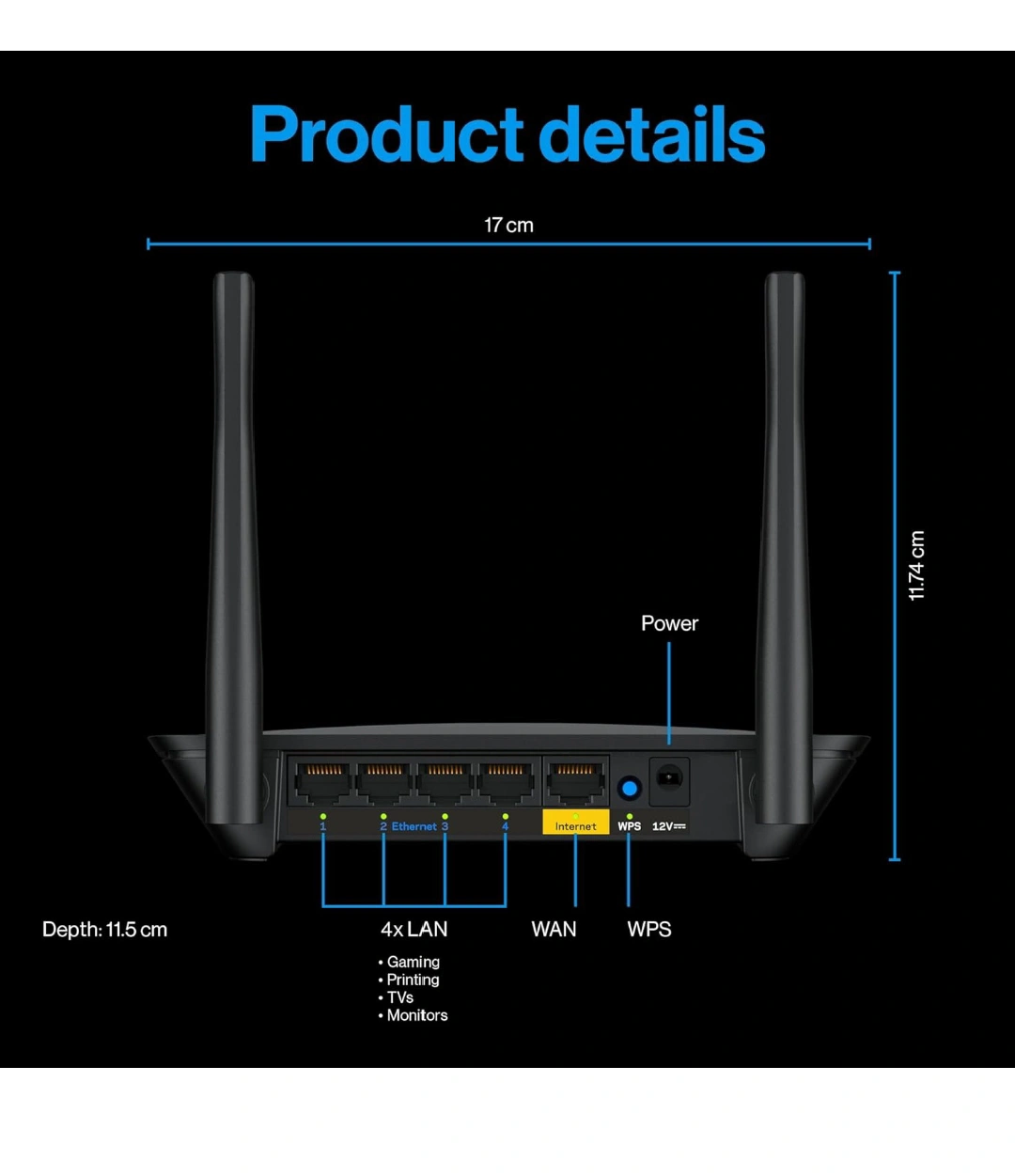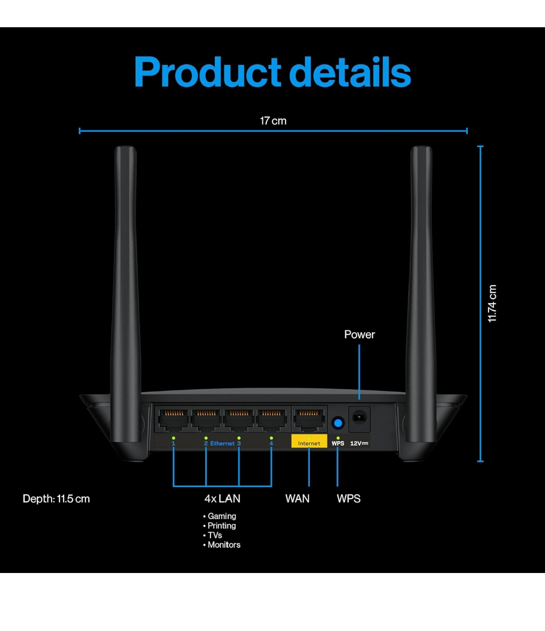 Black router with dual band WiFi, adjustable external antennas and Beamforming technology. Easy setup and parental controls. Linksys Classic Micro Router 5 | WiFi 5 | Dual Band | 1500 sq.ft. | 10+ Devices | 1.2 gbps.