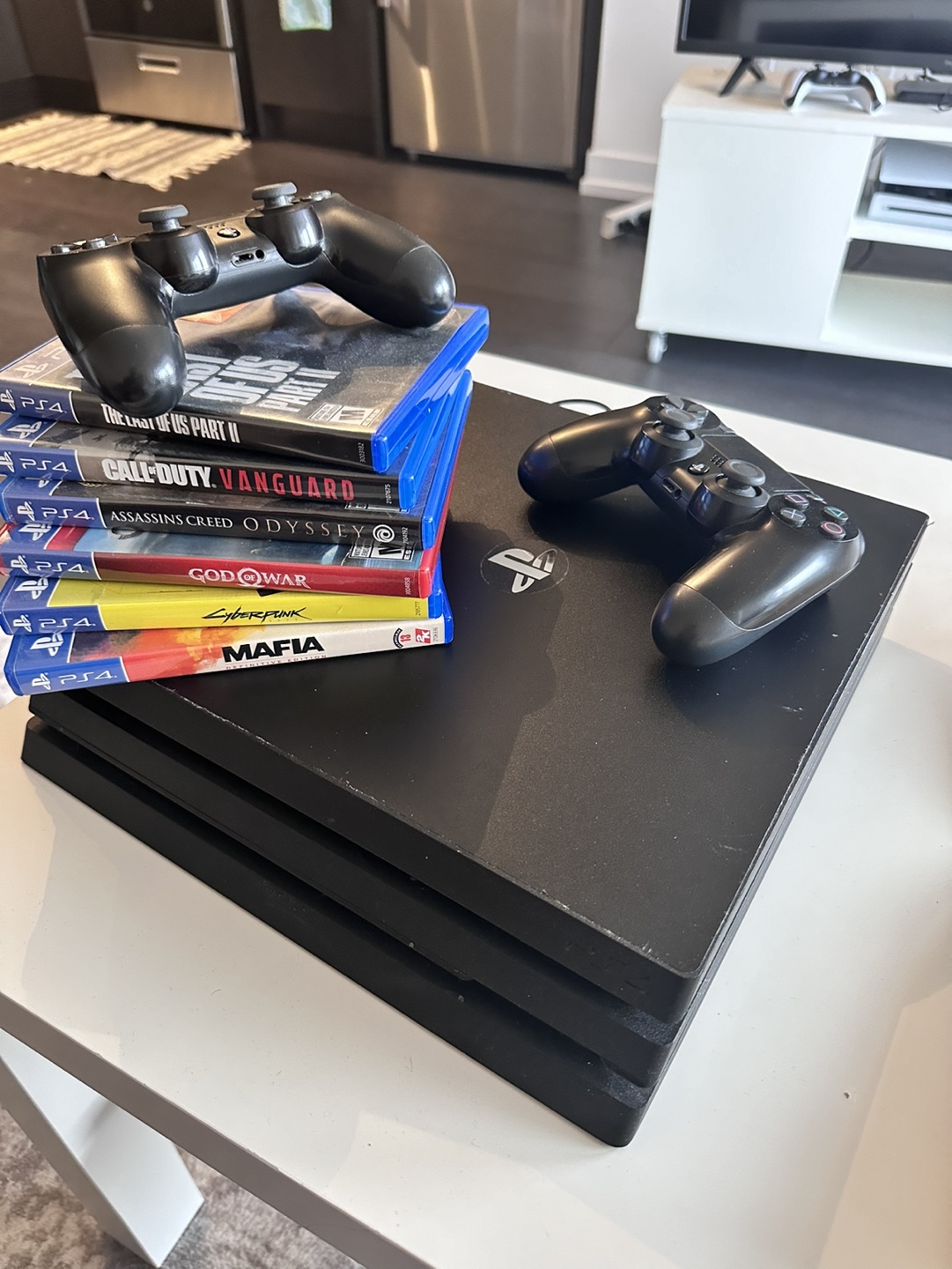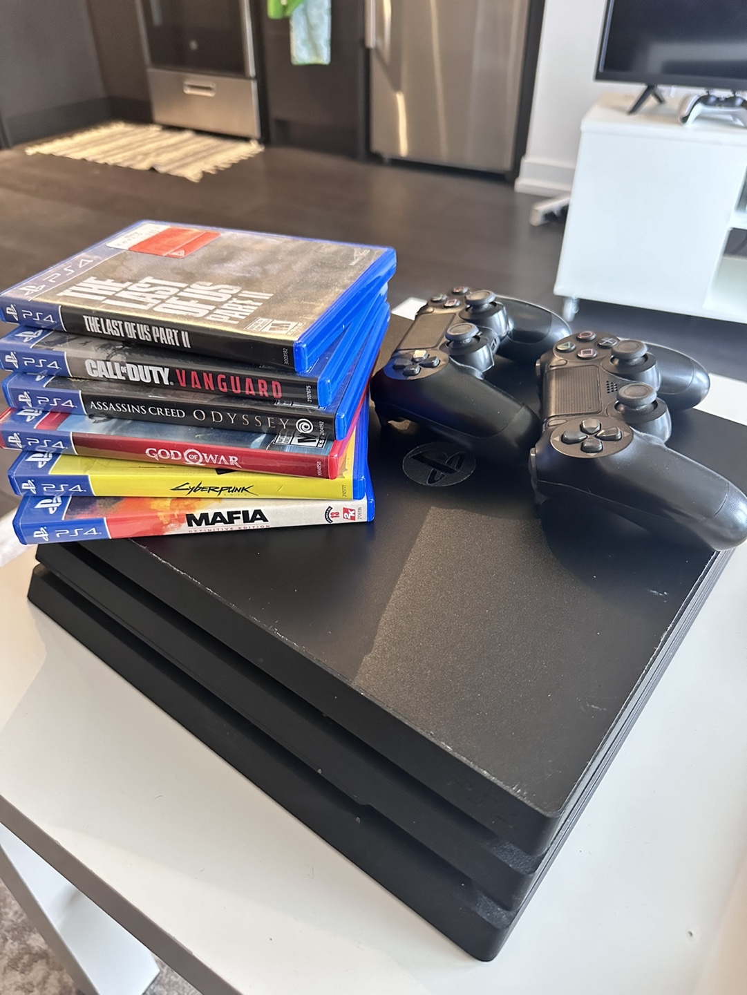 PS4 Pro console with 2 controllers. (1Tb) Includes 6 games: The Last of Us Part II, Call of Duty Vanguard, Assassin's Creed Odyssey, God of War, Cyberpunk, Mafia 2 In good condition, some games are still brand new never used before. Comes with all cables (Power,HDMI,charging..) Pick up downtown area *NOTE* These are not scratches, it’s just dust on a sticker. *UPDATE* Cyberpunk & Last of Us 2 have been sold separately
