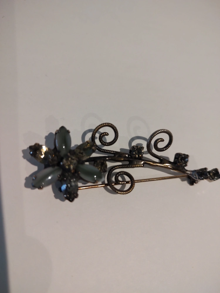 A beautiful vintage brooch featuring a flower design with clear and grey stones. Hand made