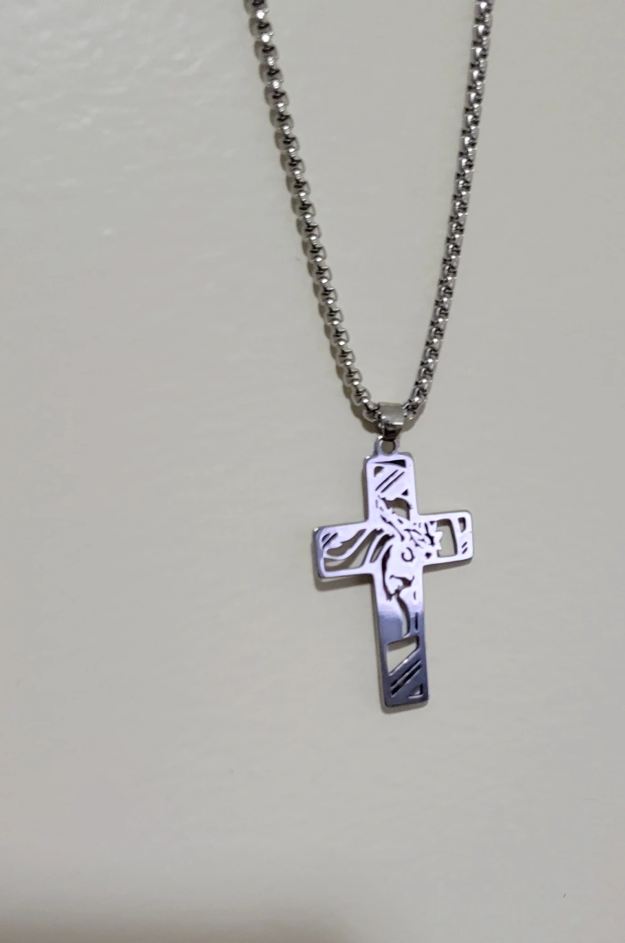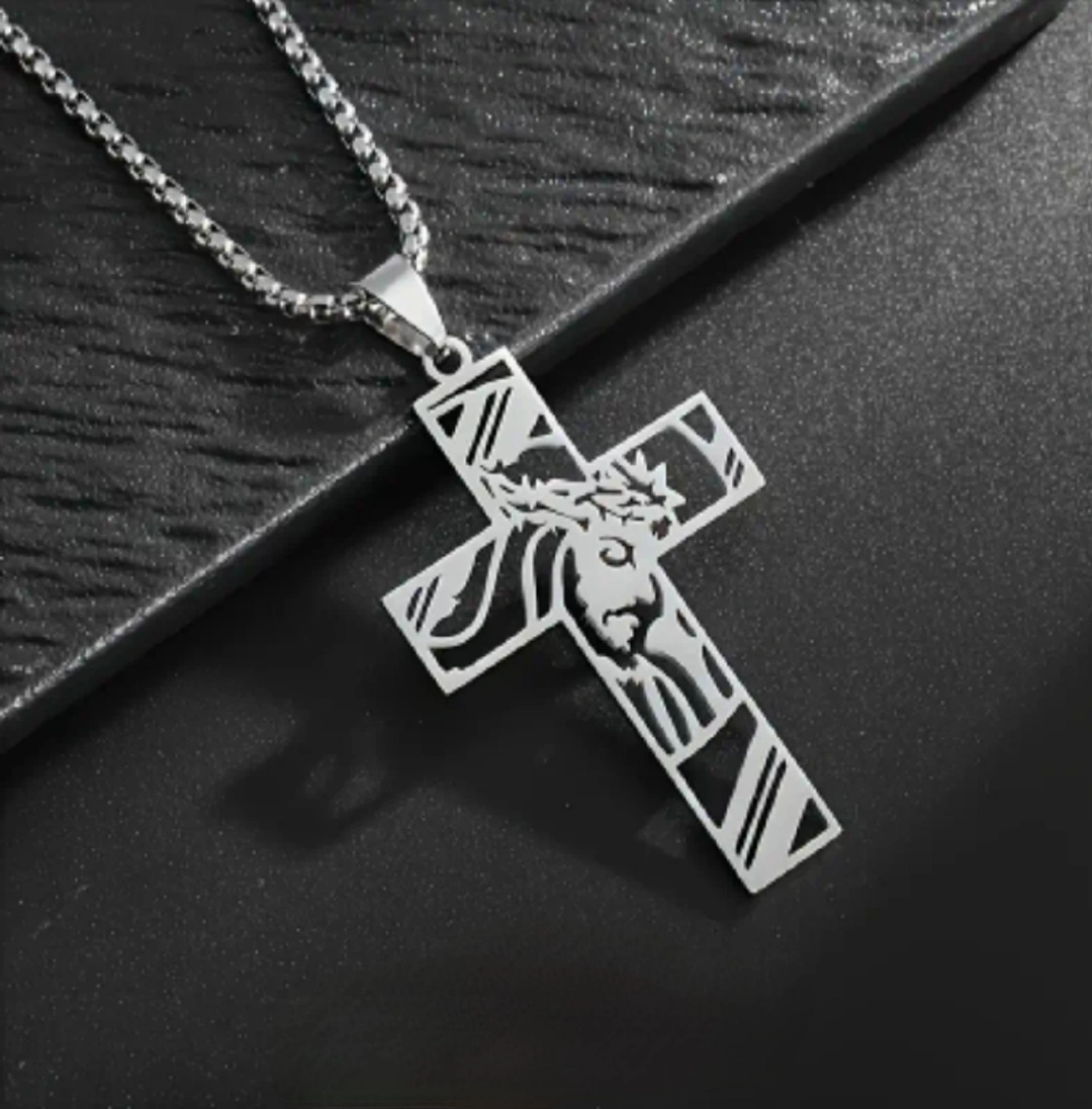 Silver stainless steel necklace with a cross pendant featuring Jesus's face. The chain is a fine, delicate curb chain.