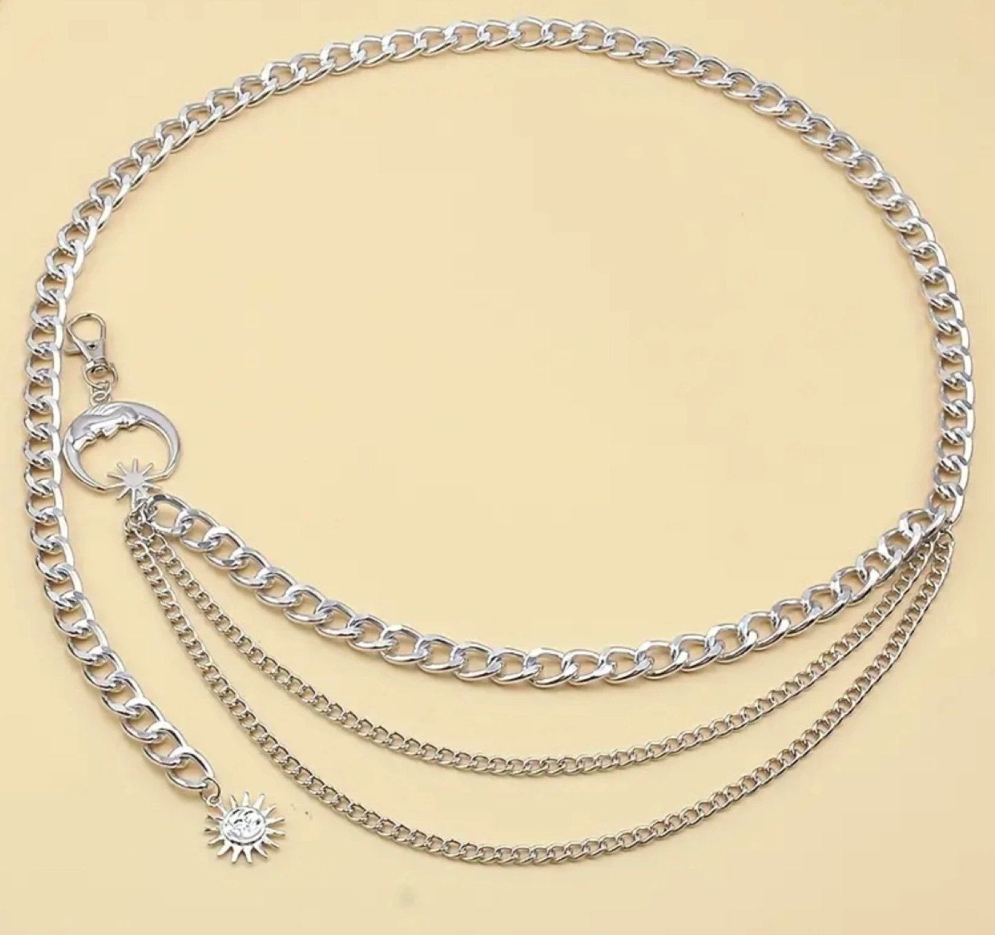 Silver chain belt with a moon and a sun charm. Features a thick chain with three delicate chains hanging from it.