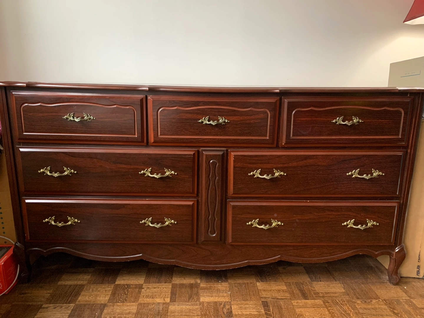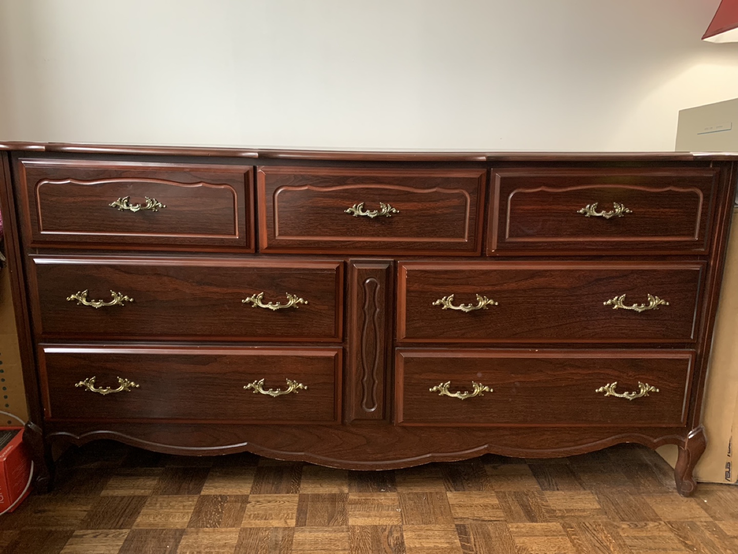Large wooden dresser with 7 drawers. Features ornate gold handles.