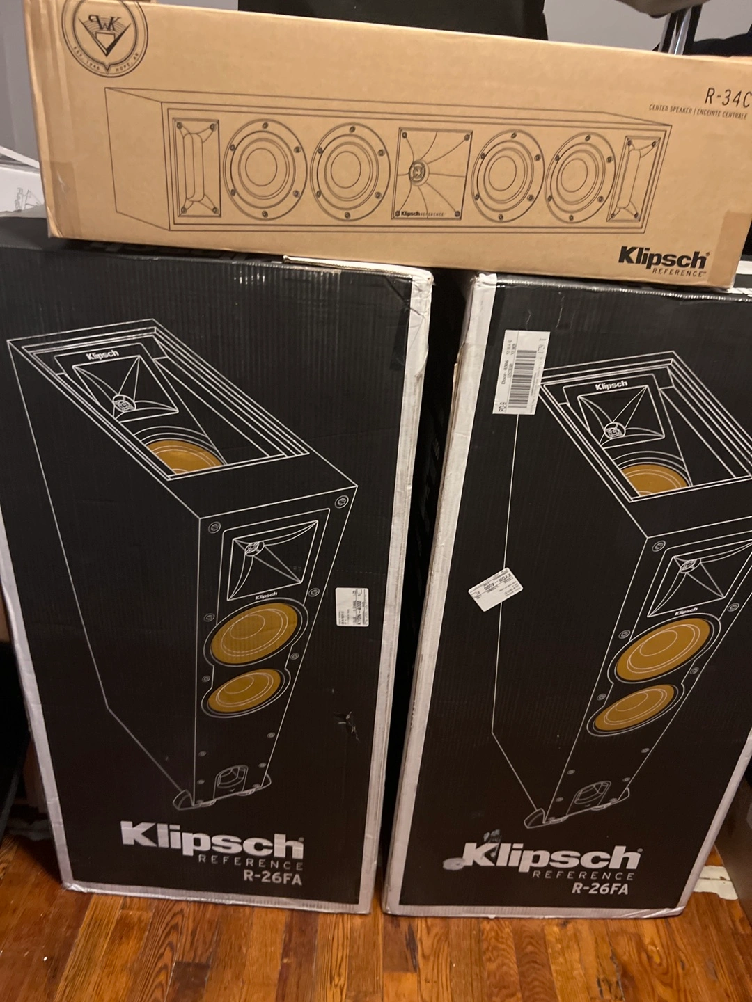 2 klipsch R-26FA reference home theater speakers - 1 R34c Center channel speakers brand new in box value at $950 will let go for $700 firm no negotiation please
