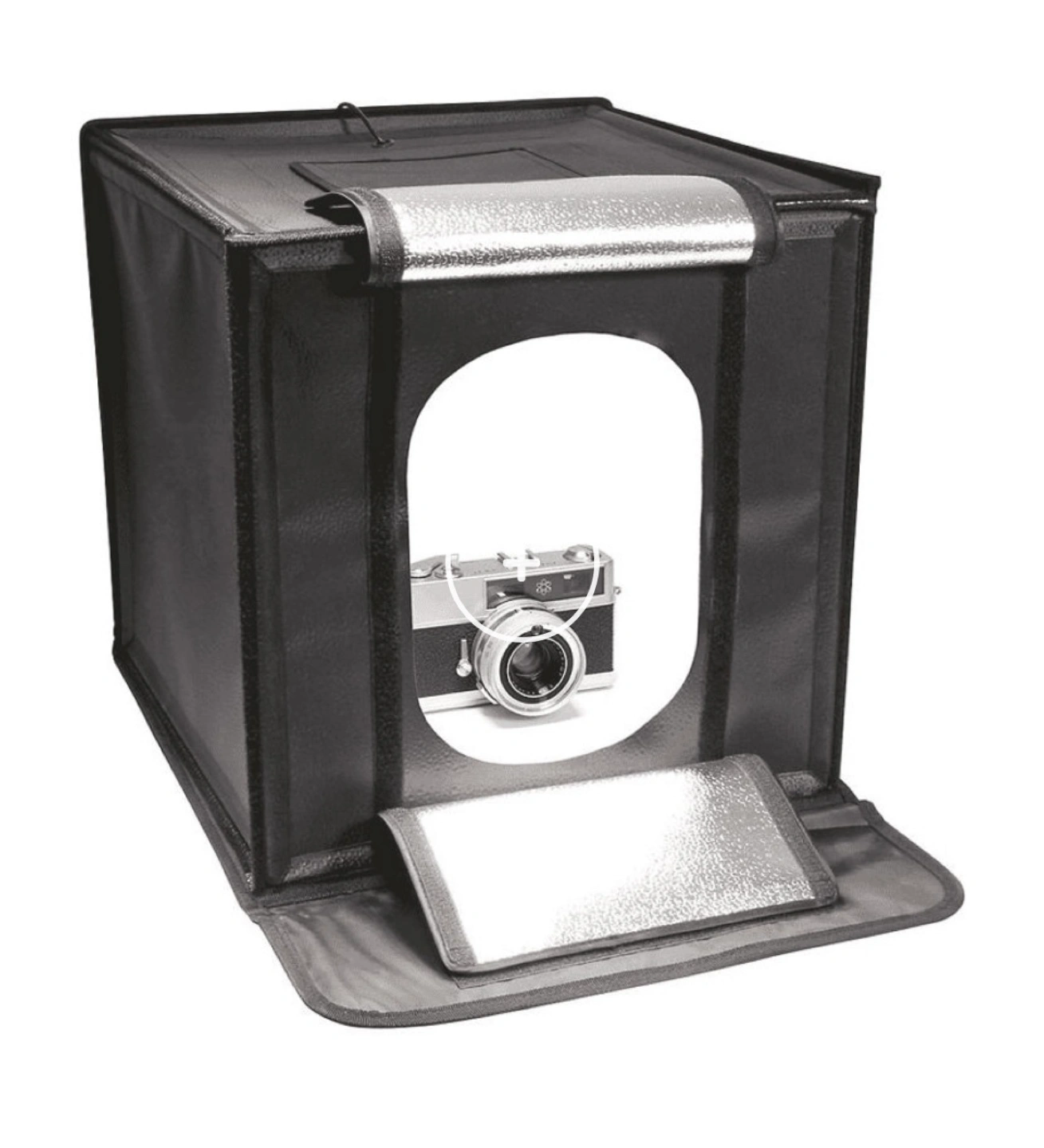 Portable photo light box to take photos of products. Perfect for taking photos of small items. Includes white backdrop, light, and silver reflector and a black pouch.