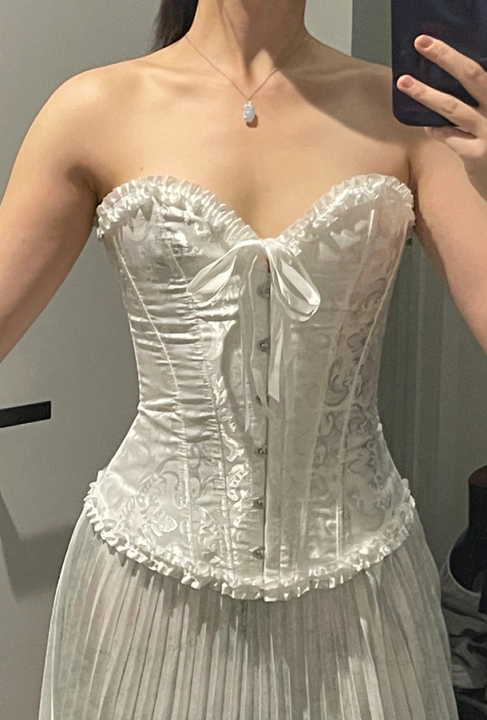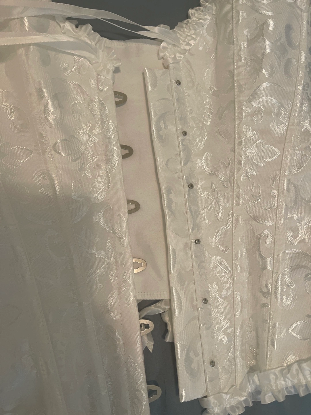 White satin corset with a lace trim, a bow at the top and a matching g-string. Laces up in the back with hook and eye closure in the front. Can be easily adjusted. Embroidered design throughout.