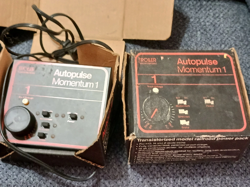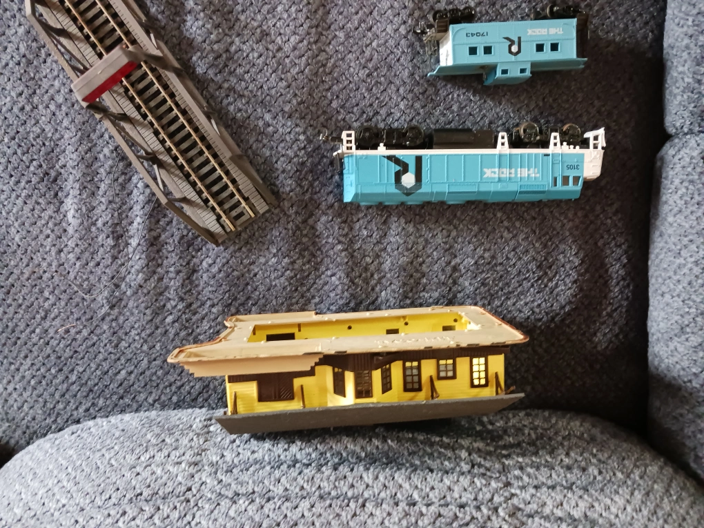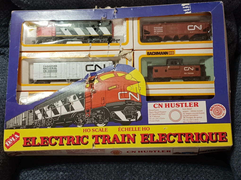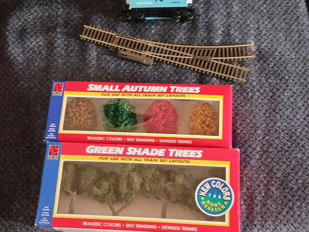 HO electric train set. Includes extra tracks, two extra power packs, a building, another engine and a caboose, and 4 boxes of tree decorations.