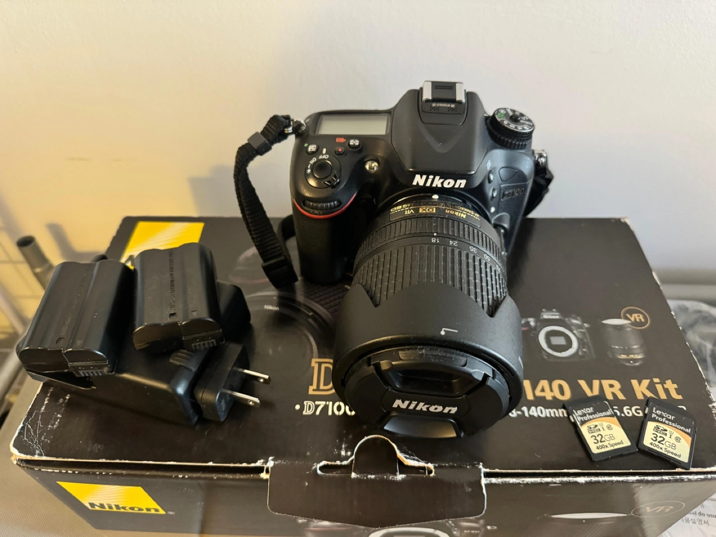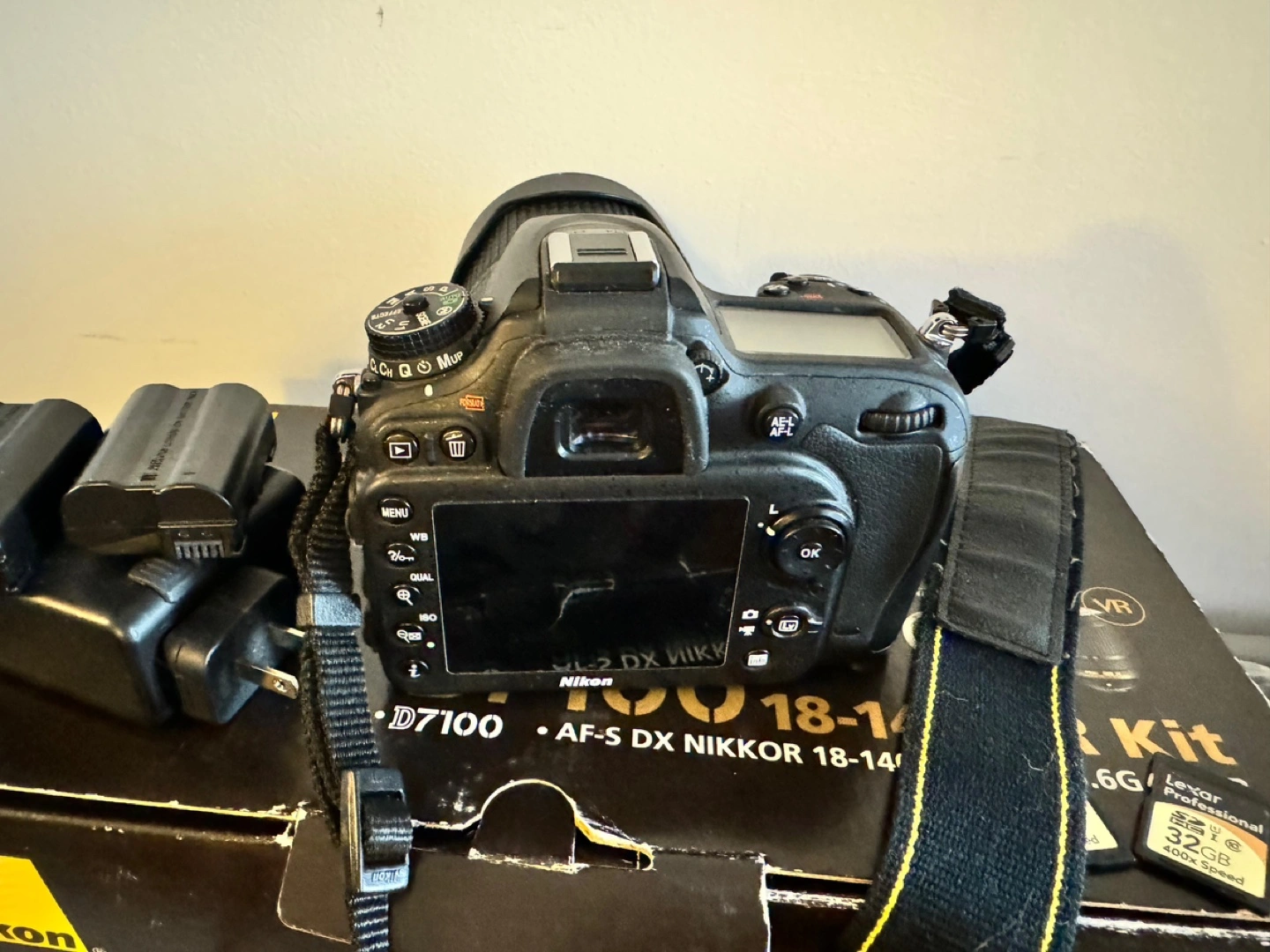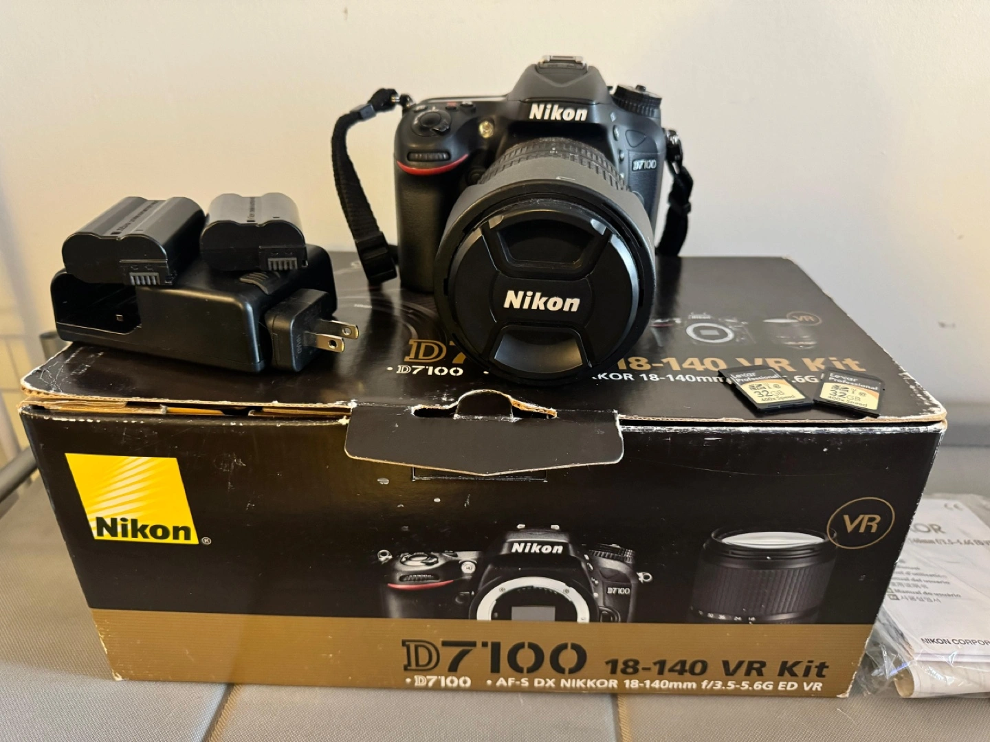 90DSLR camera with lens, charger and two batteries. Comes in original box.