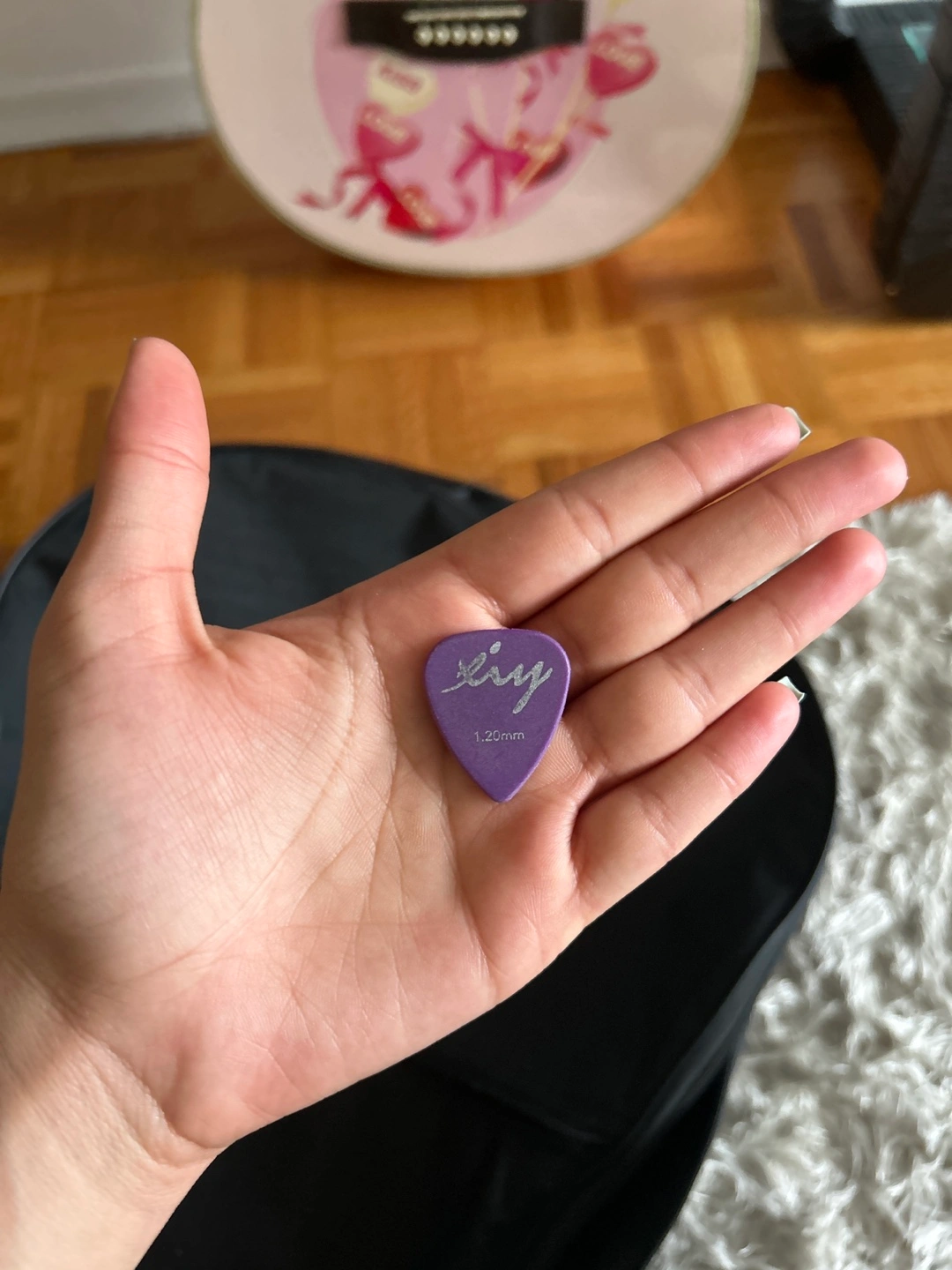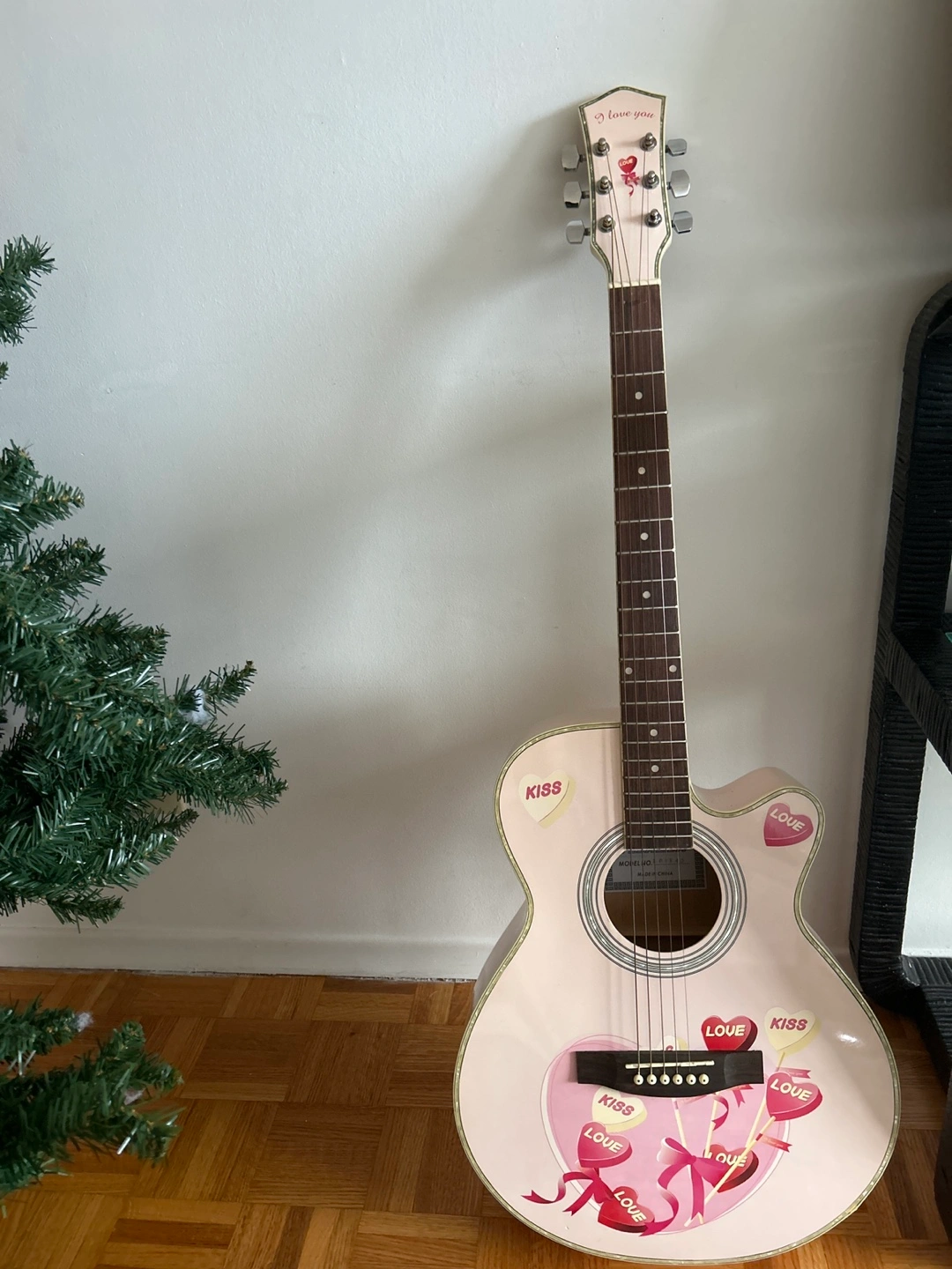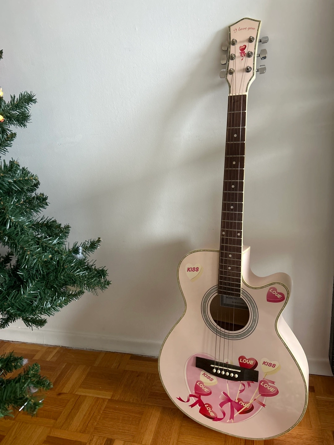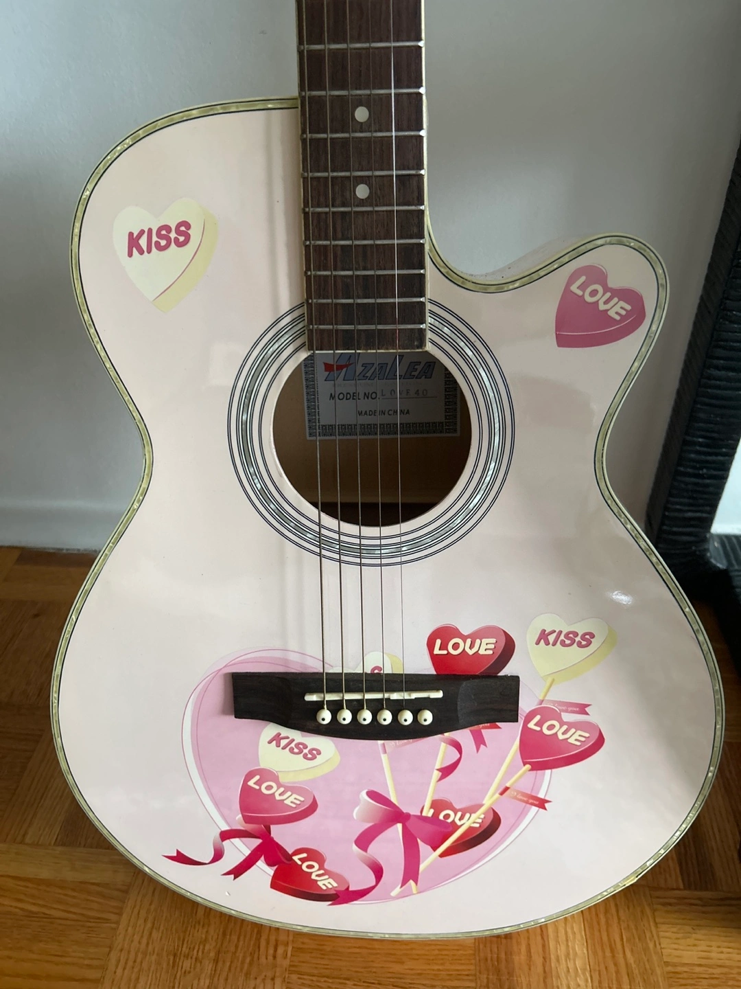 Acoustic guitar with a pink finish, featuring a candy/heart-themed design (Valentine’s Day Guitar) and a black carrying case. Guitar Pick Included.