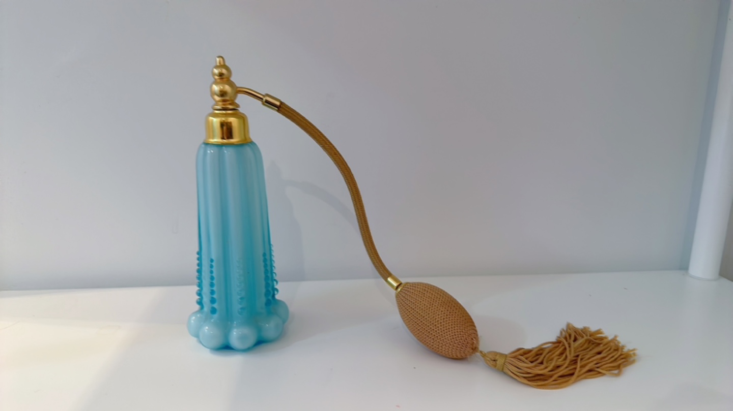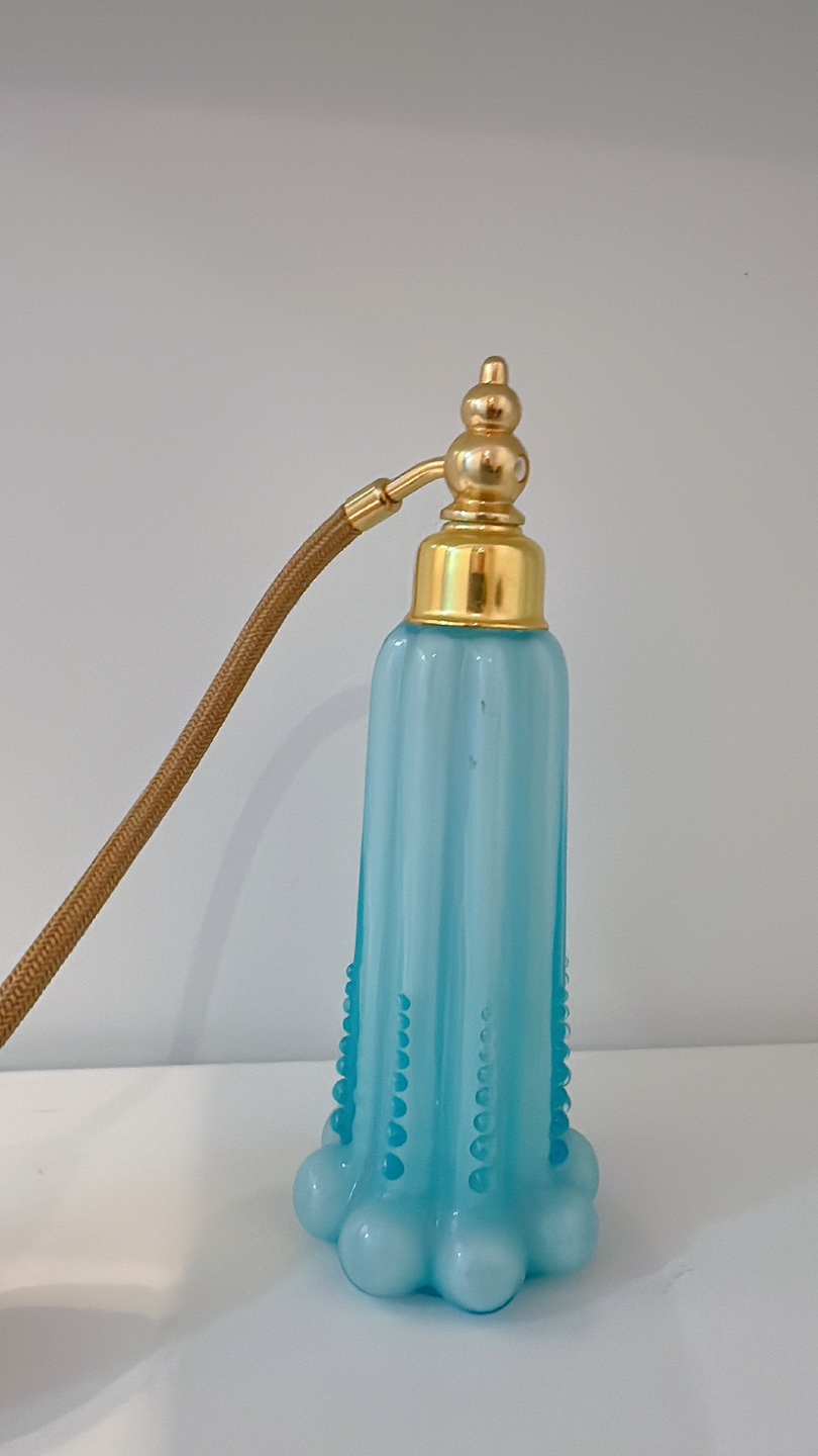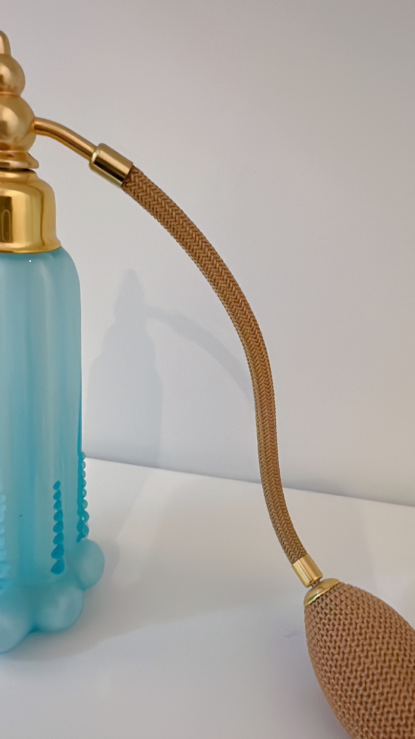 Blue glass perfume atomizer with gold accents and a long brown cord with a bulb at the end.