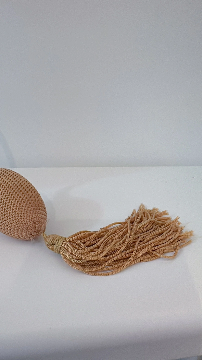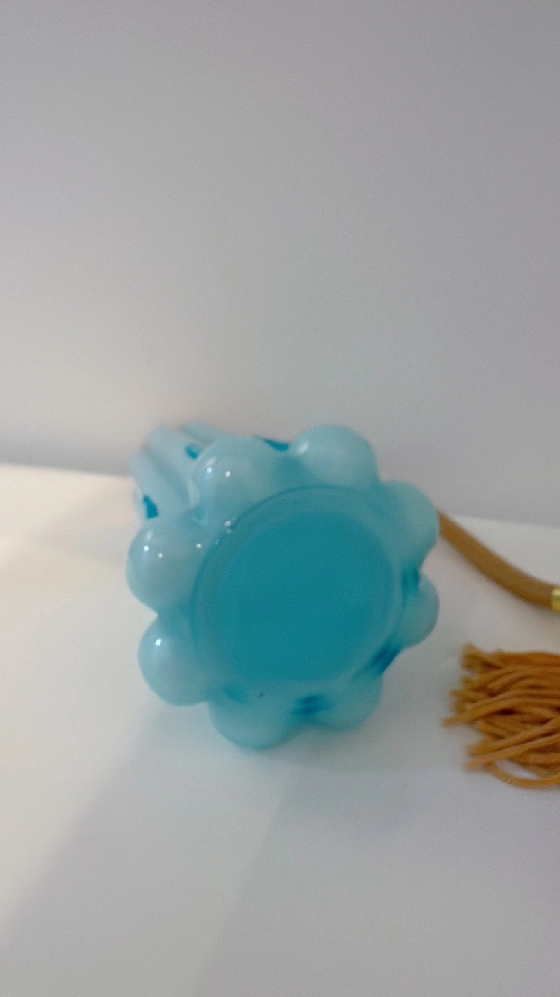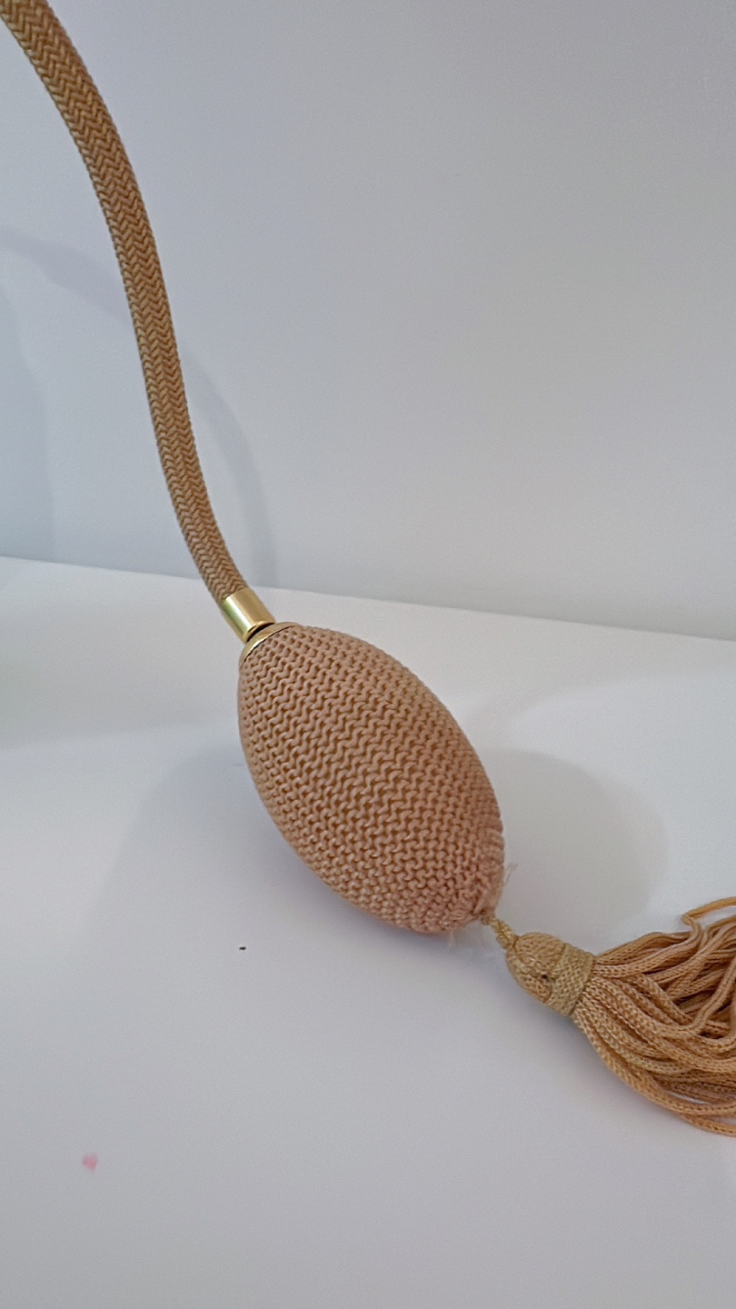 Blue glass perfume atomizer with gold accents and a long brown cord with a bulb at the end.