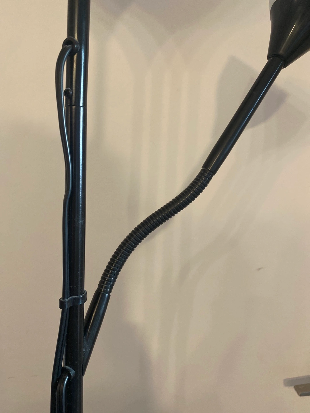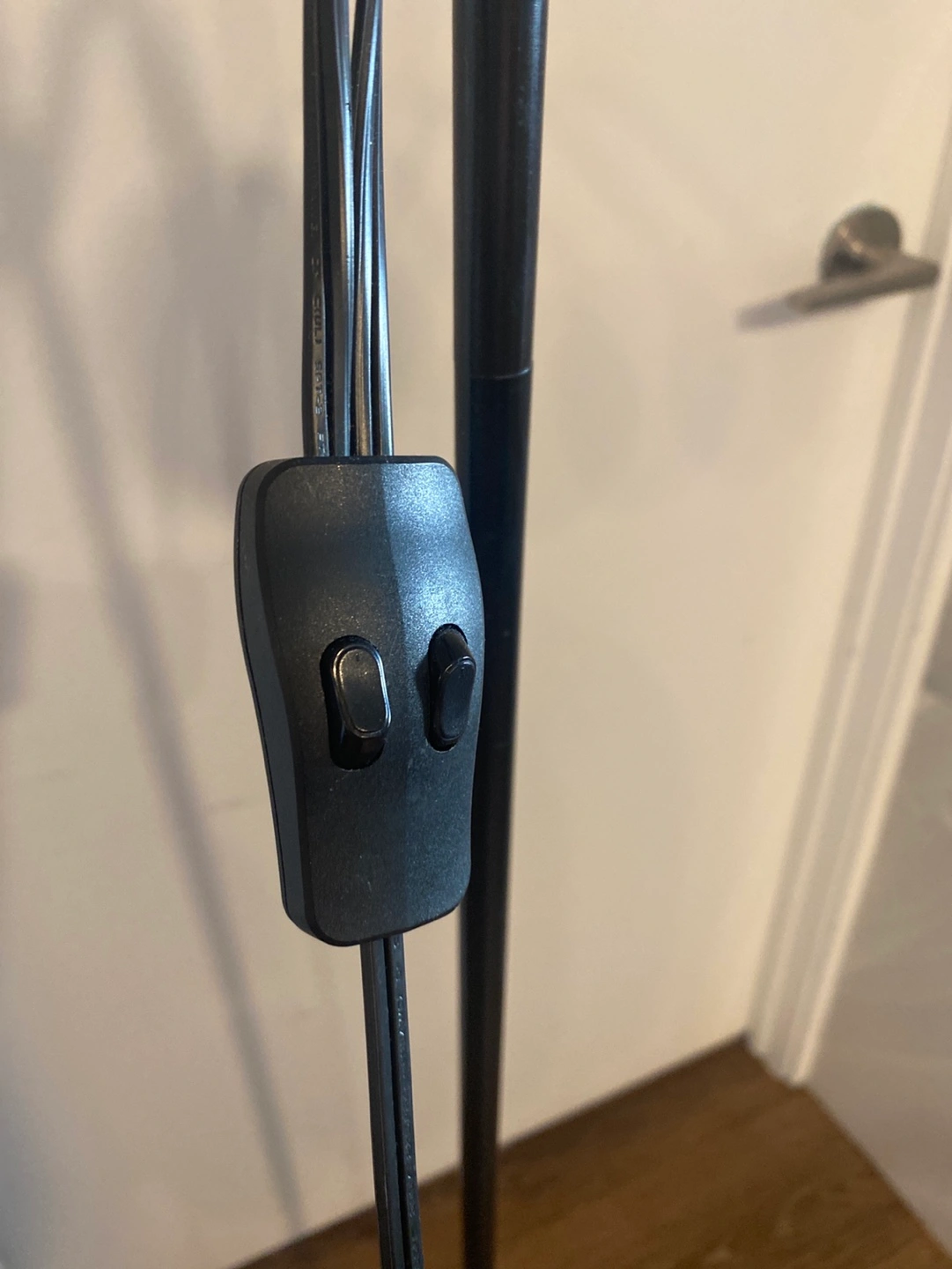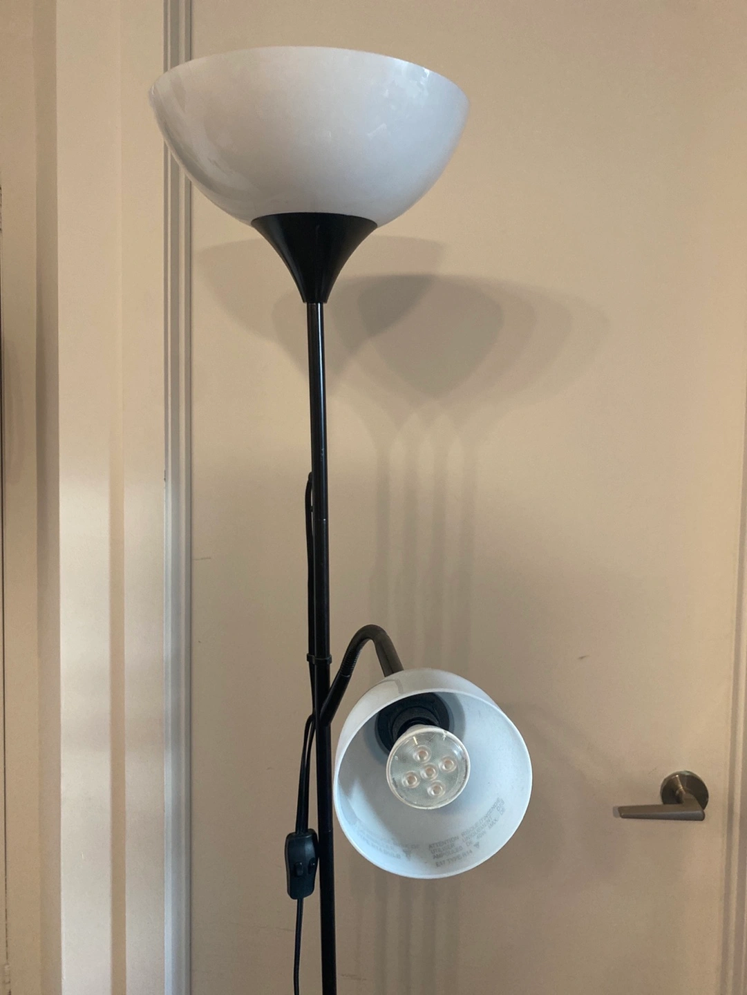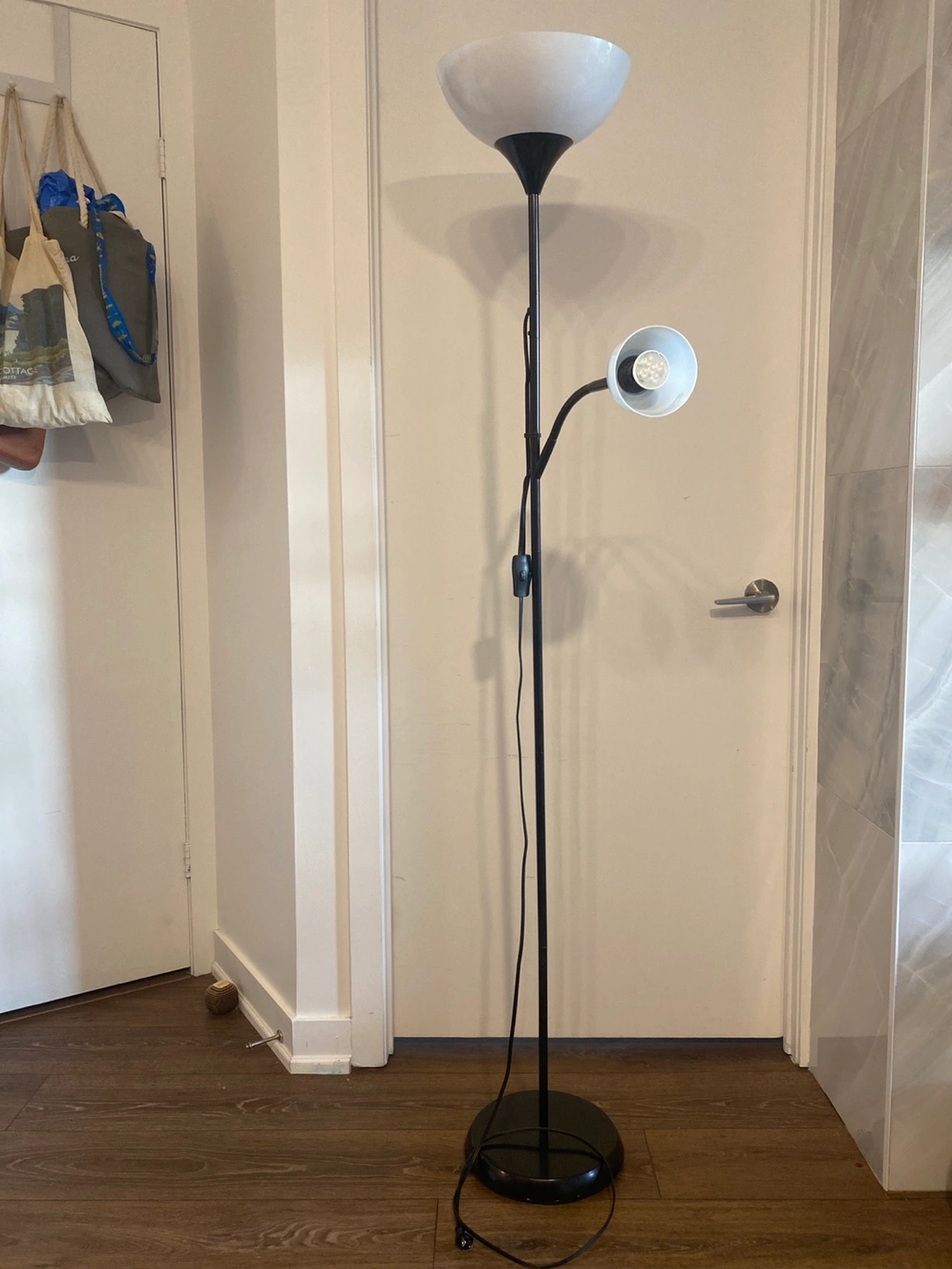 Lamp has two lights; a fixed that points up at the ceiling and one that bends downwards (for reading and other activities). Each light comes with its own shade. Double on/off switch so you can turn each lamp on and off individually. Plugs directly into the wall.