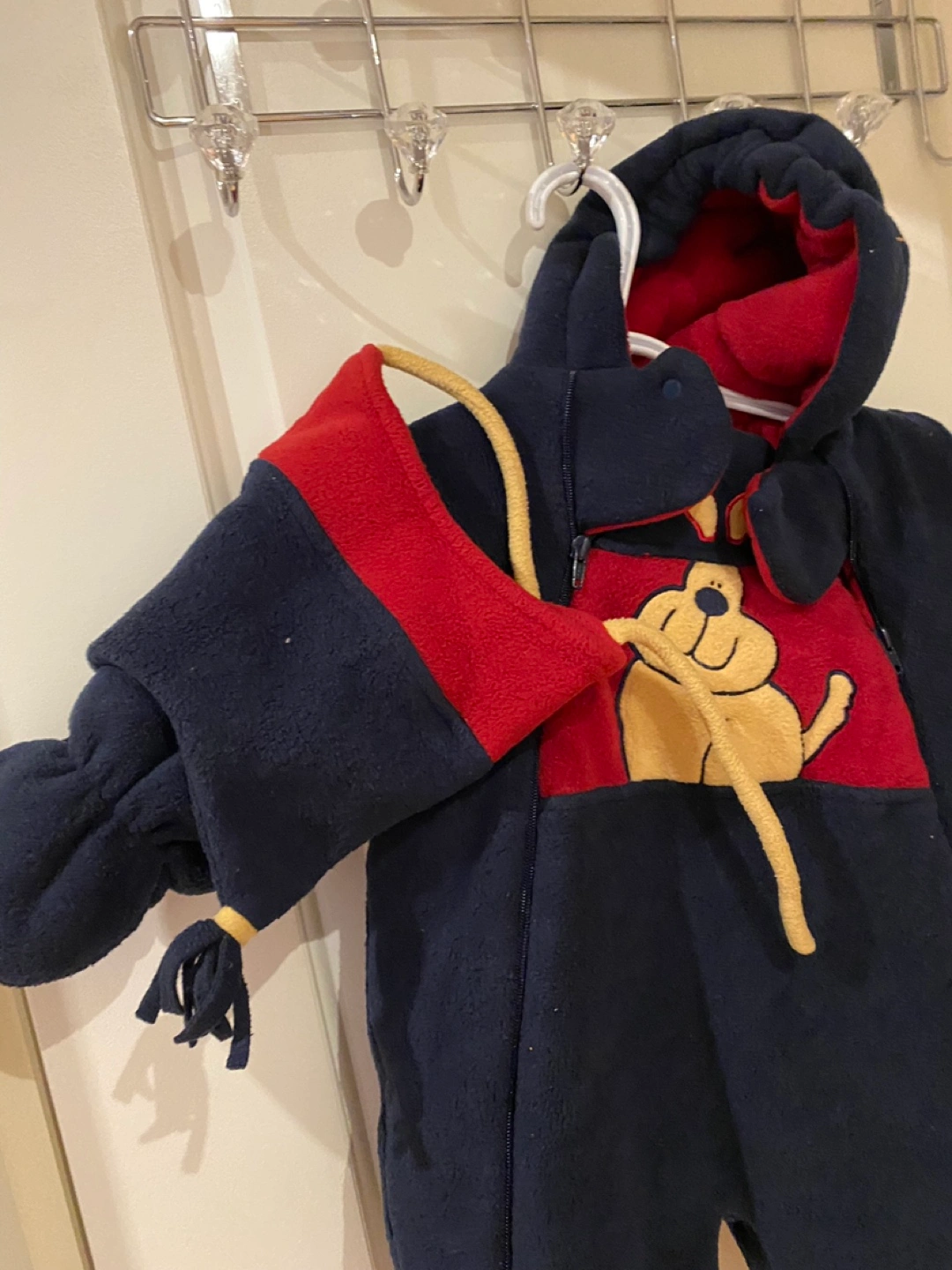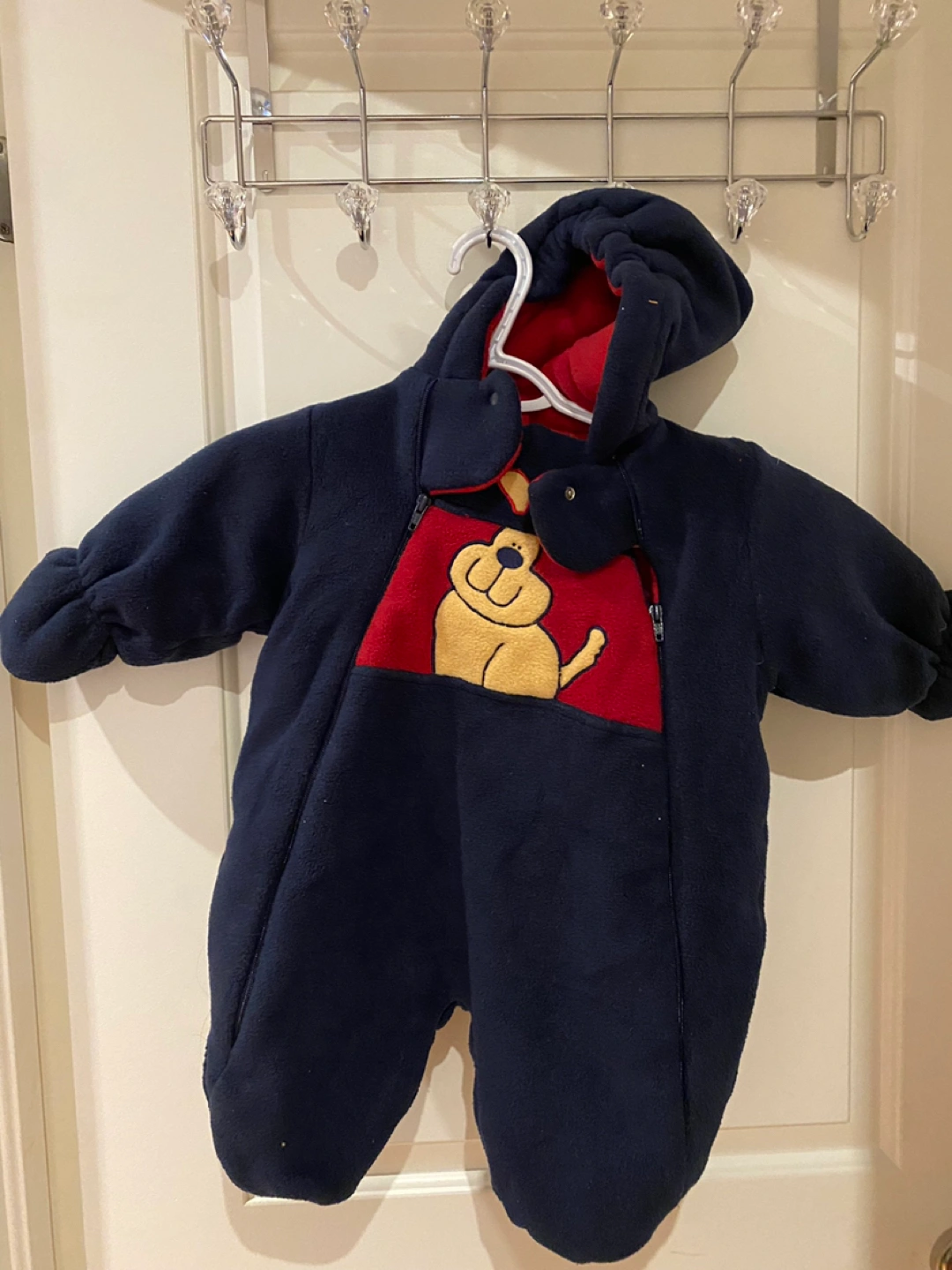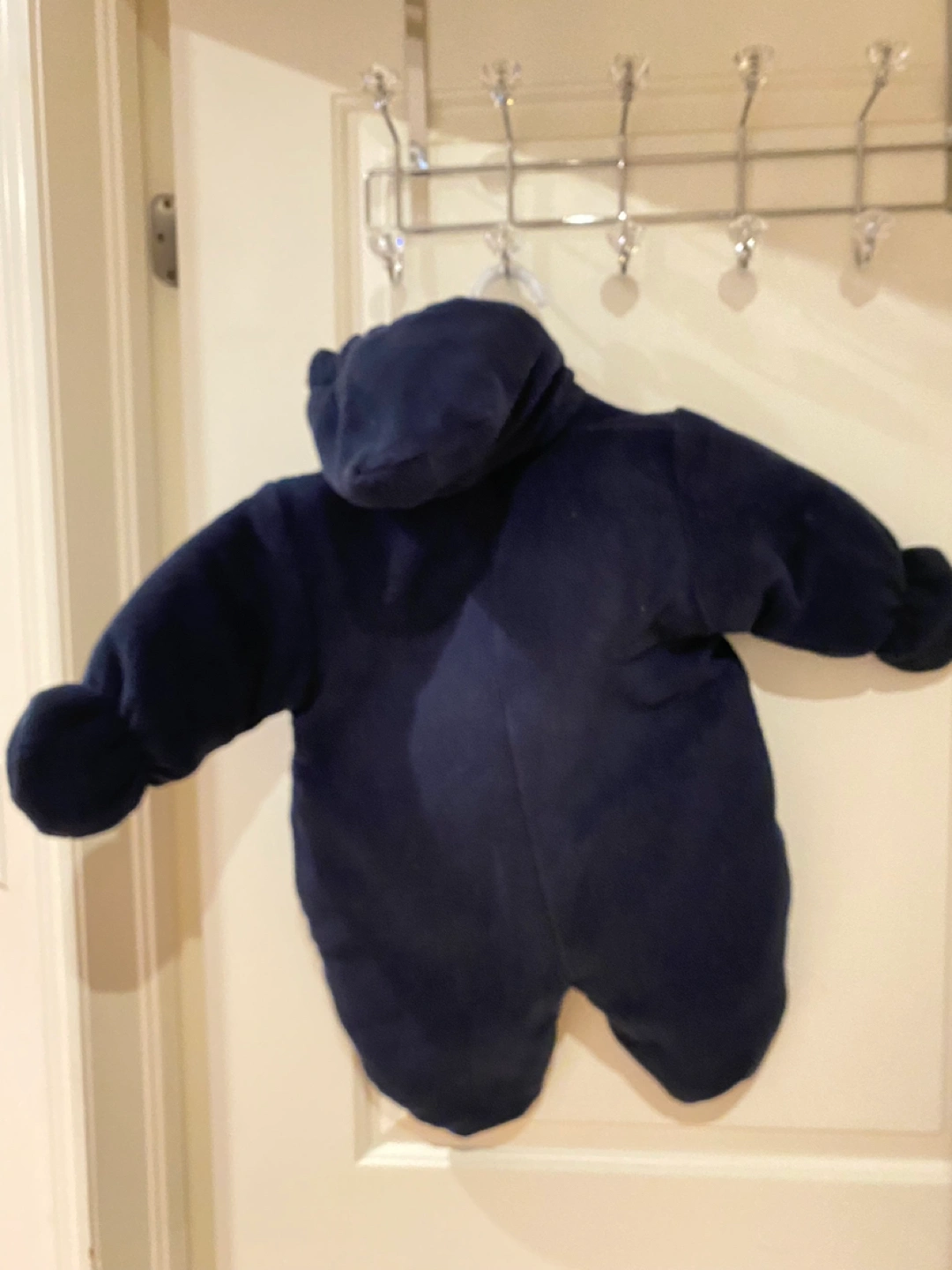Baby winter snow suit. Warm with matching hat. 3-6 months navy and red. Easy to wear with zippers on each side Excellent condition.