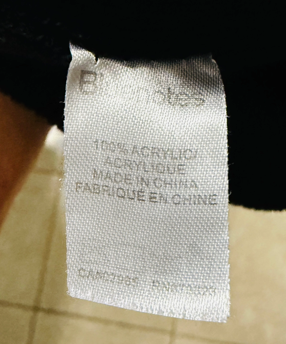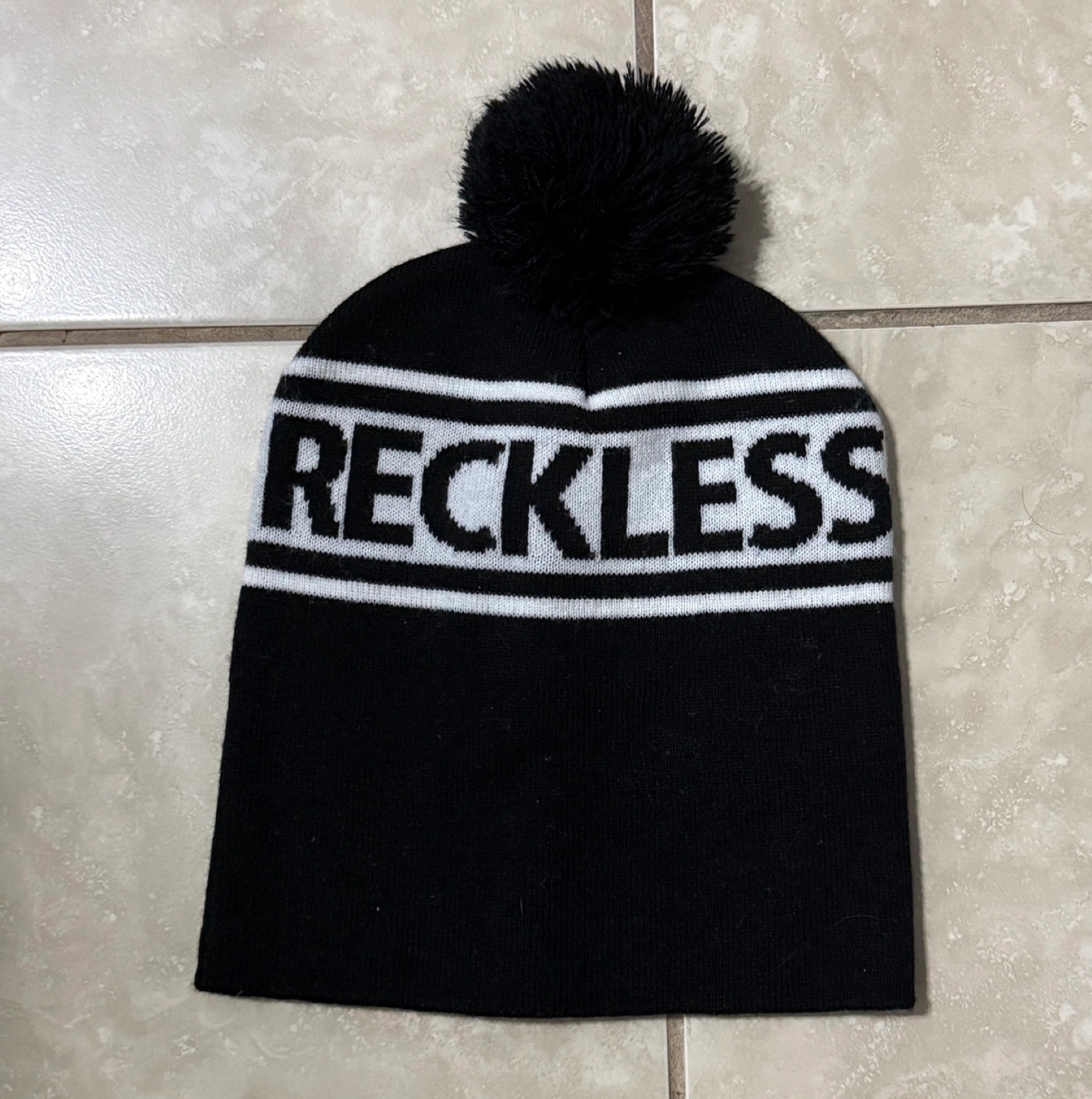 17Black beanie with white stripes and a black pom. Features the word 'Reckless' in white lettering. Made of acrylic.