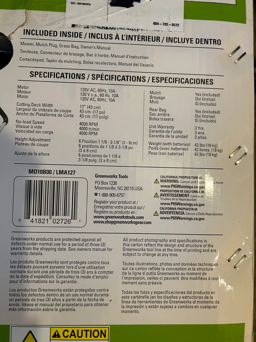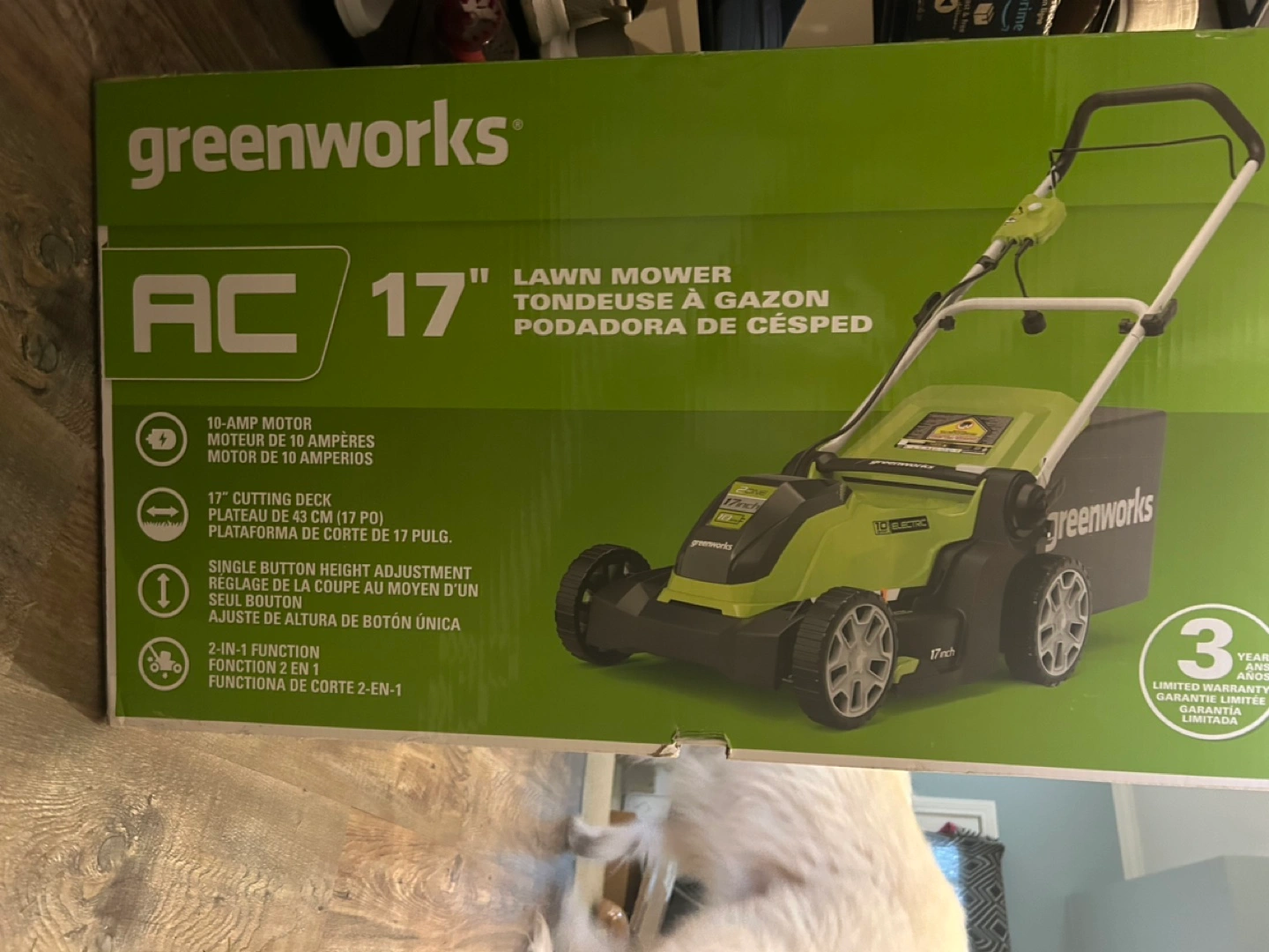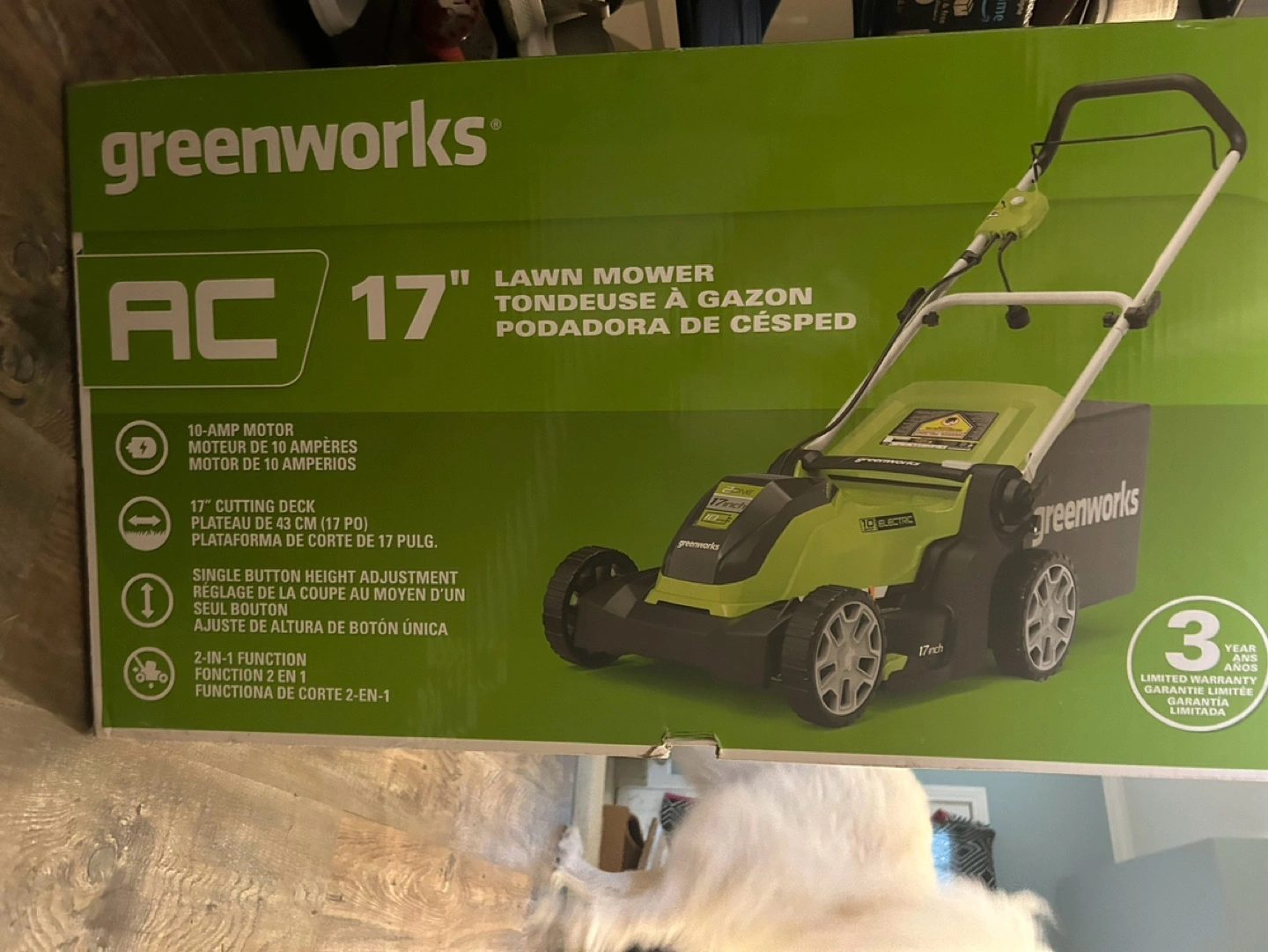 10-amp motor, 17" cutting deck, single button height adjustment, 2-in-1 function. Includes: Mower, Mulch plug, Grass bag, Owner's manual. New in box.