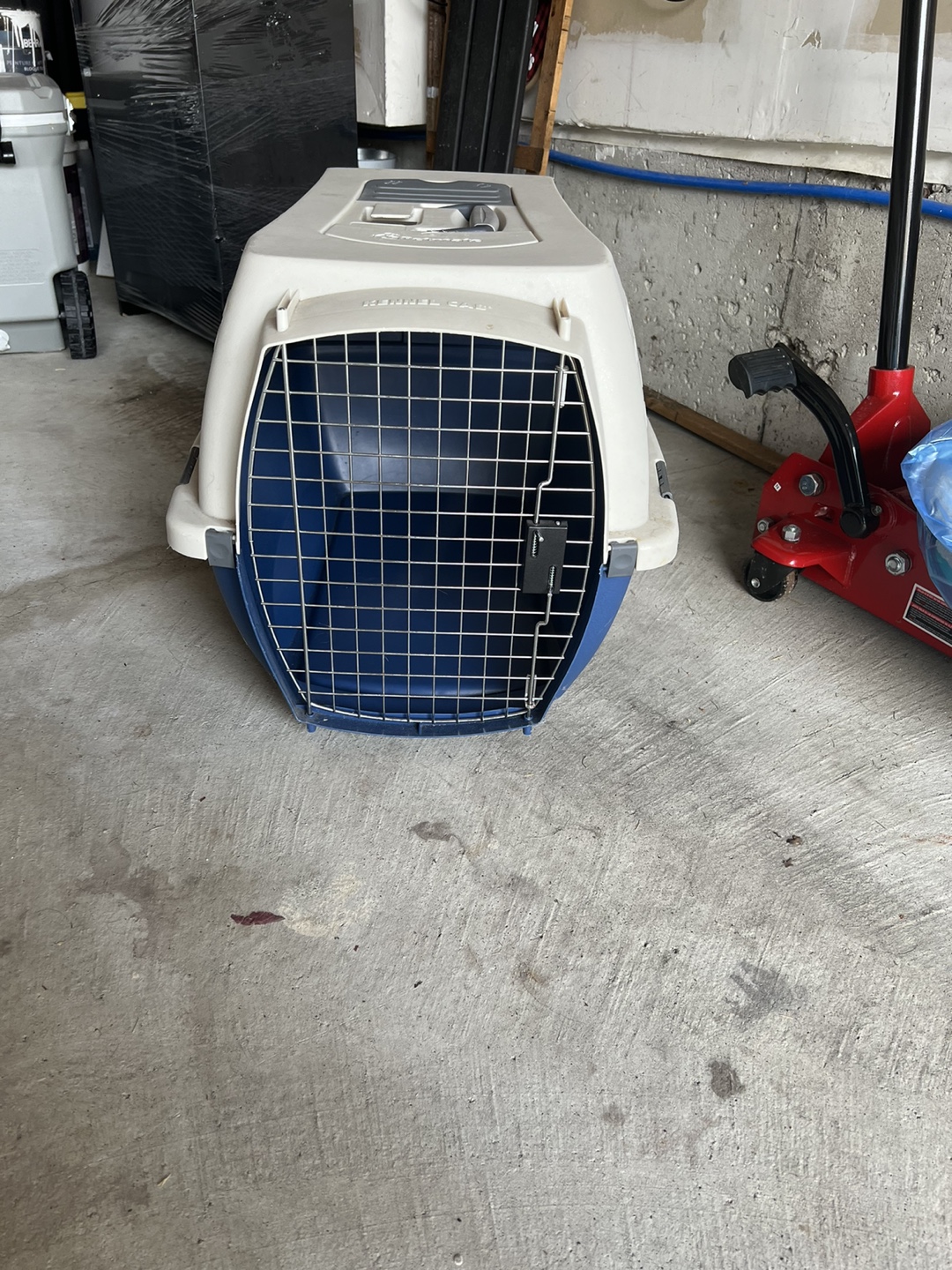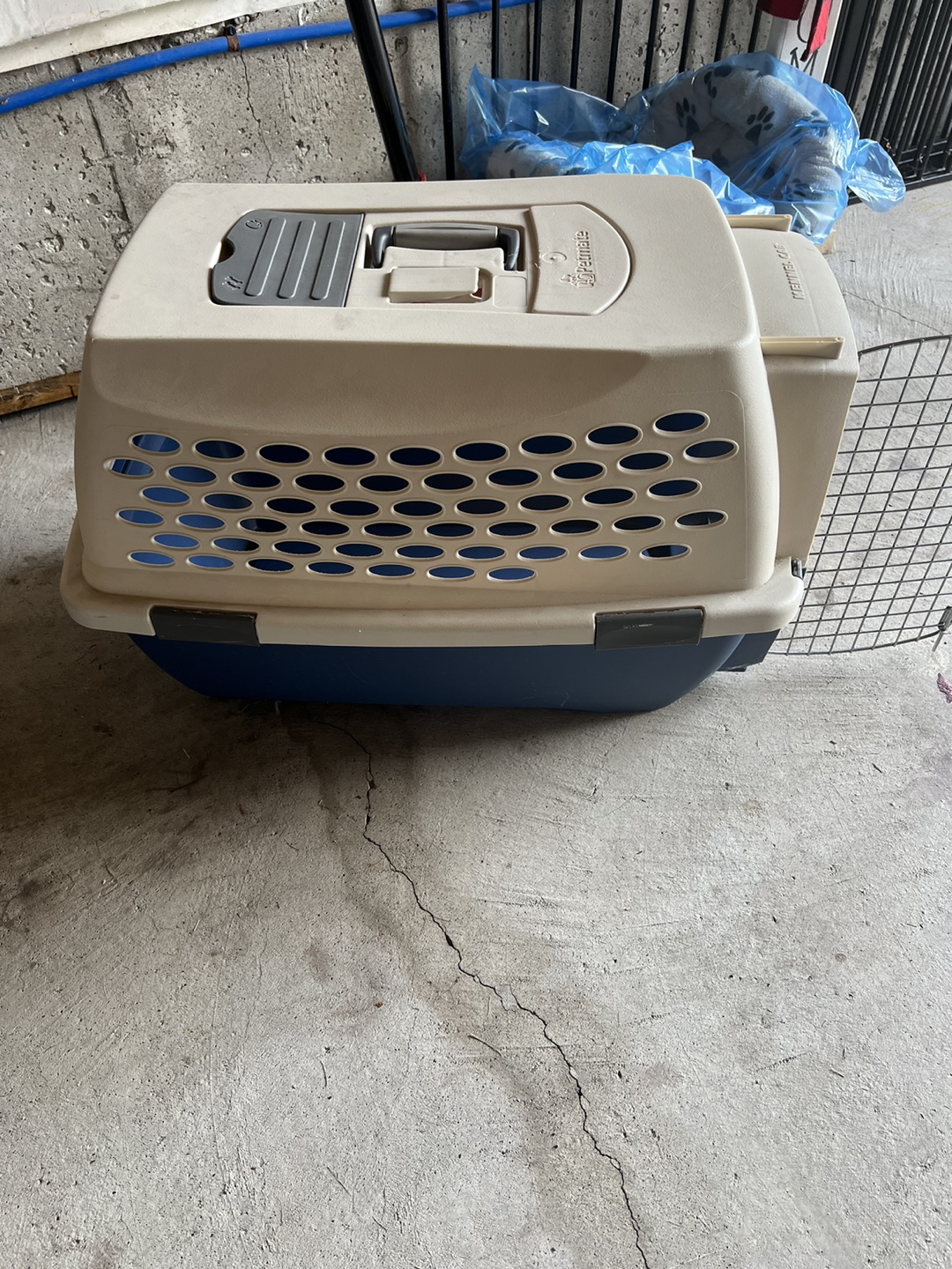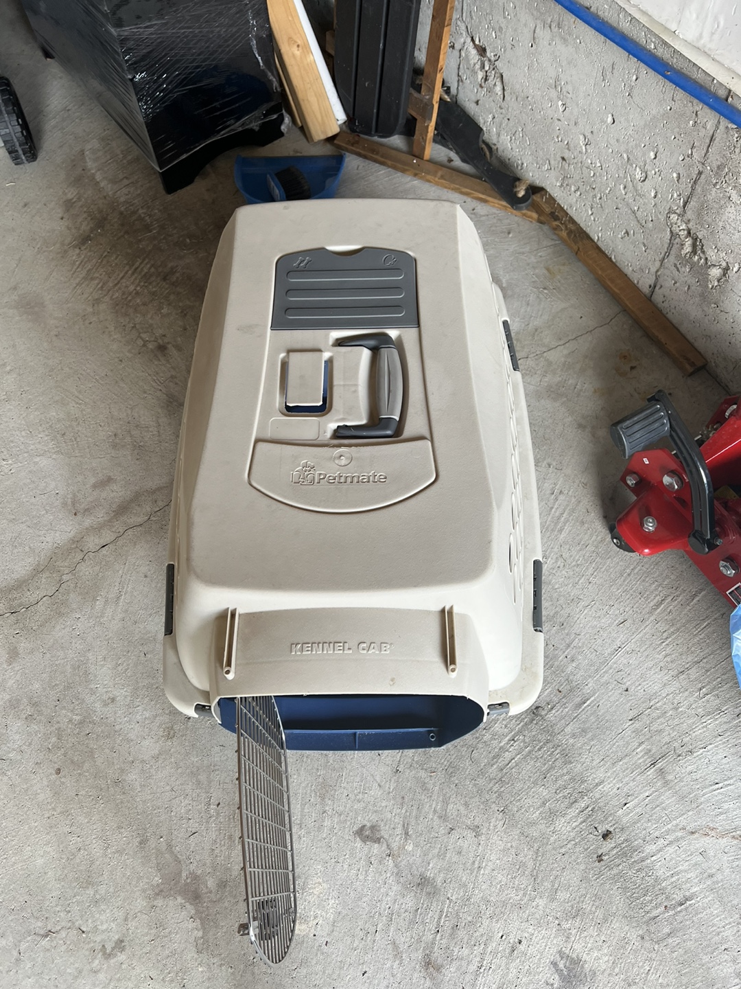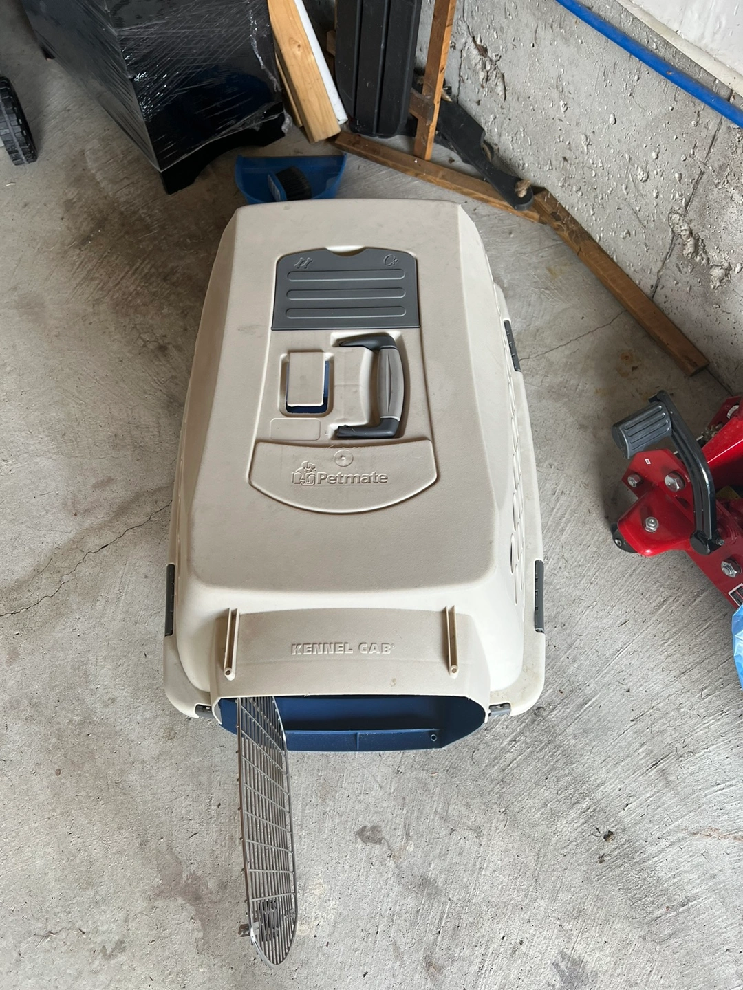 Petmate kennel carrier. Has a door on the front., a convenient treat, poo bag holder compartment and a handle. Cream and blue colour. Will include a blush mat. Great condition!