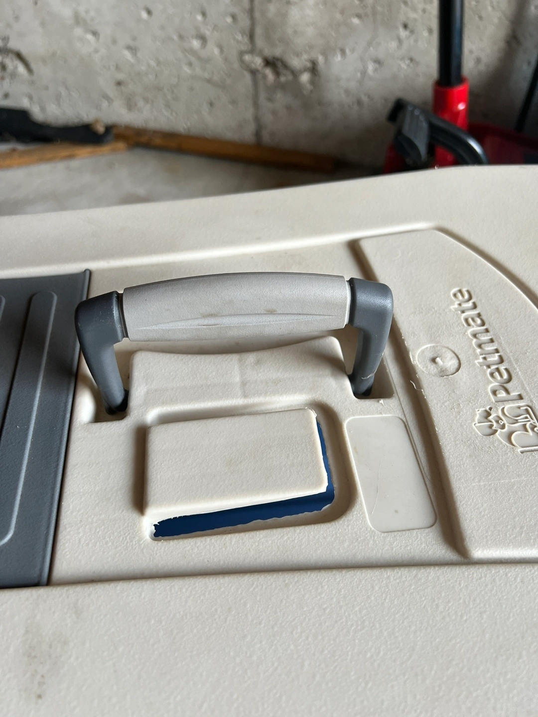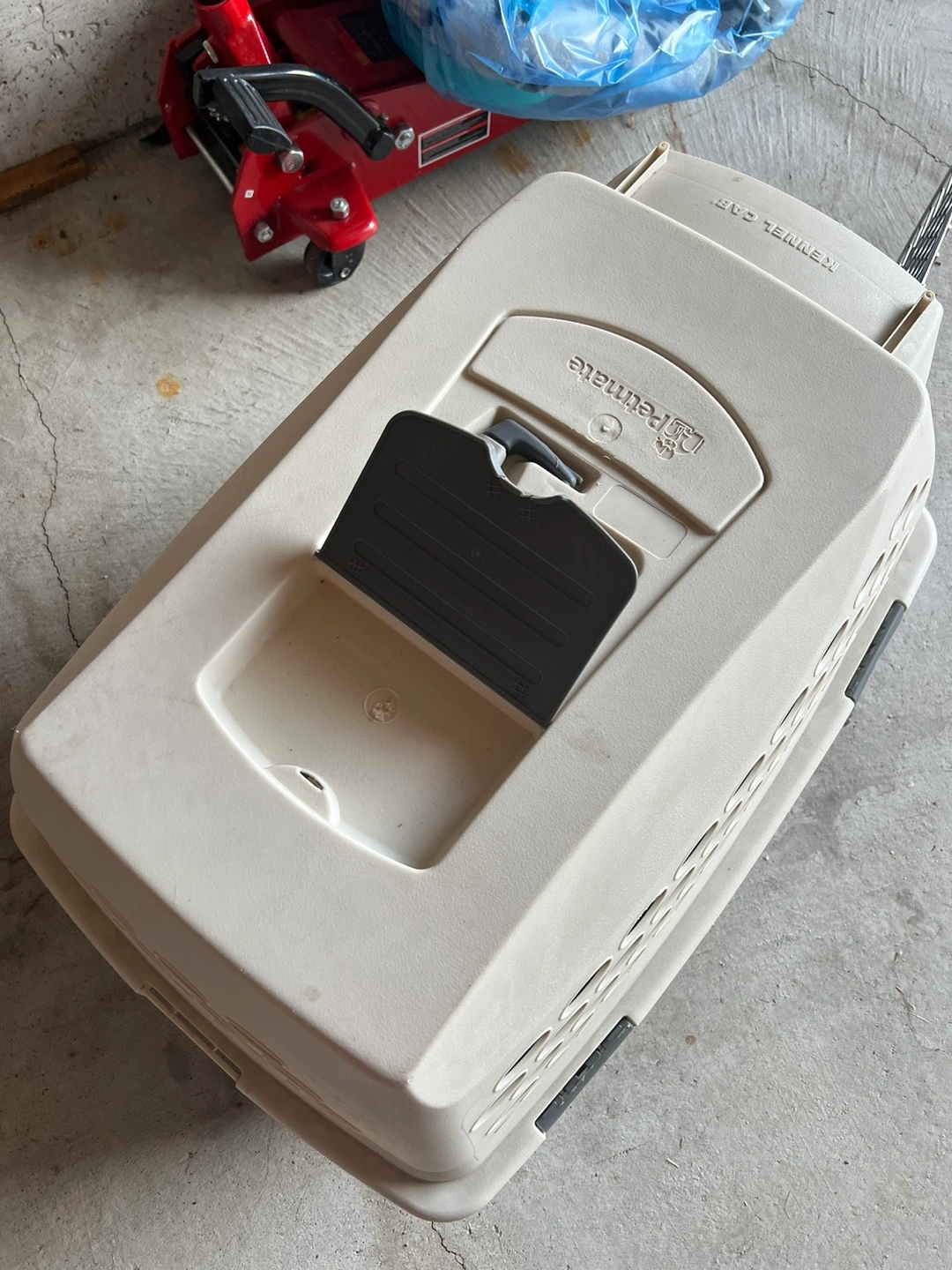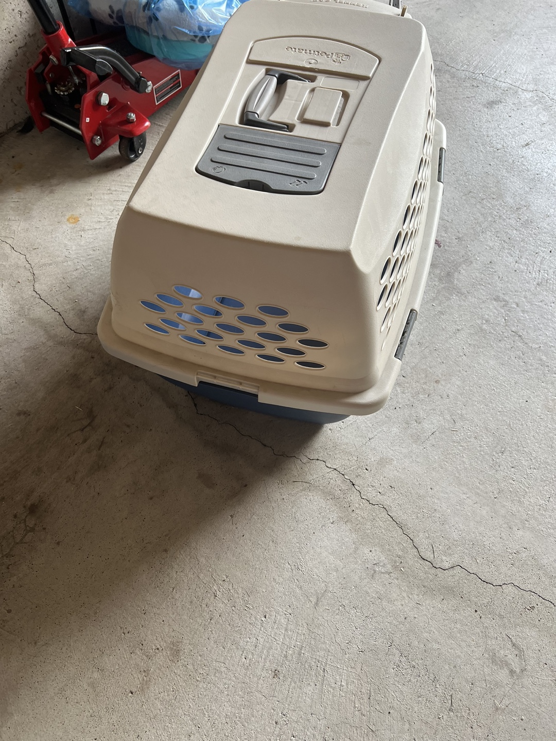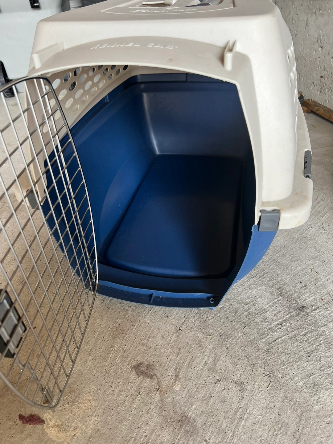 Petmate kennel carrier. Has a door on the front., a convenient treat, poo bag holder compartment and a handle. Cream and blue colour. Will include a blush mat. Great condition!