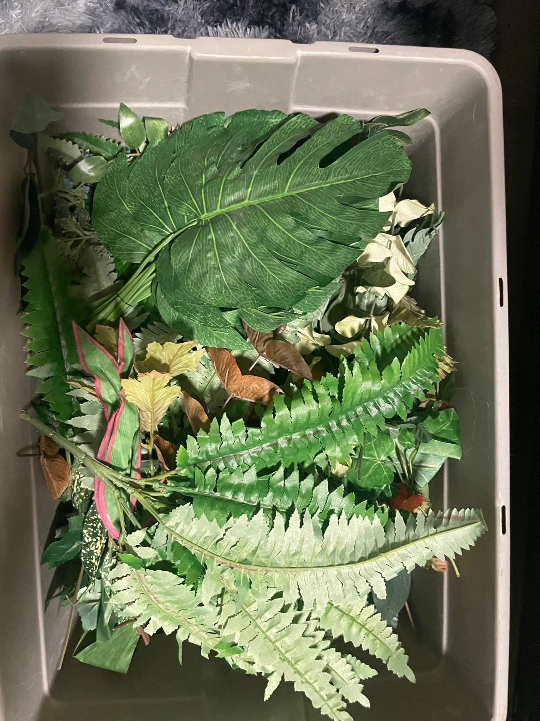 - Dimensions23”x17” bin full of artificial plants and grasses