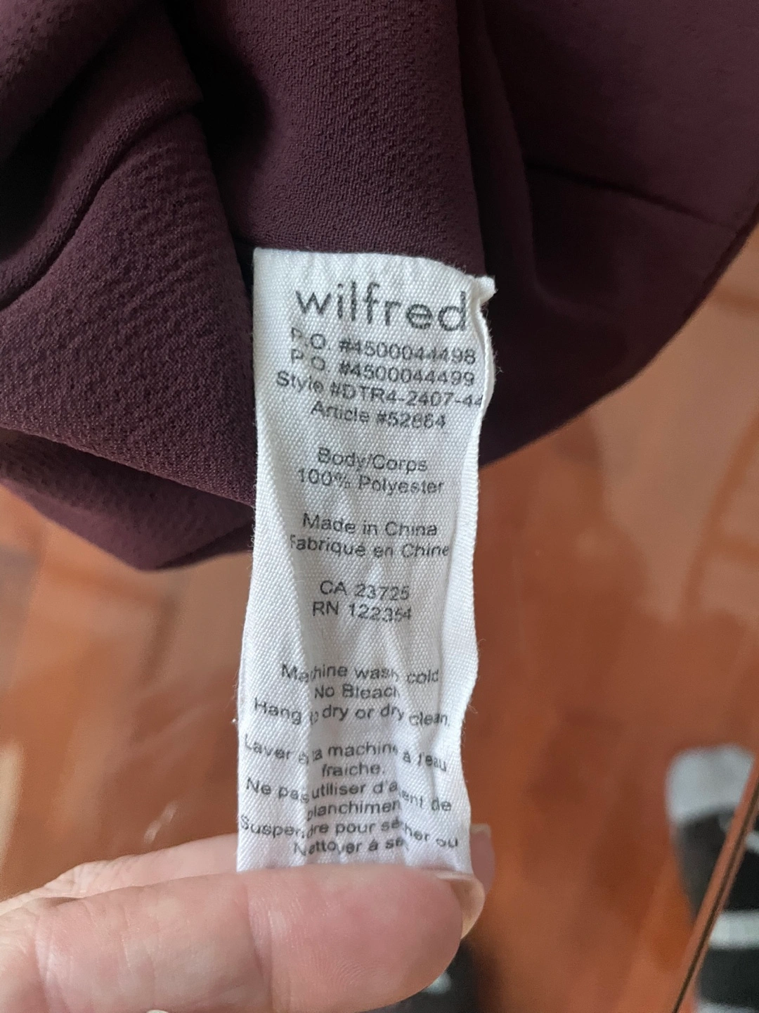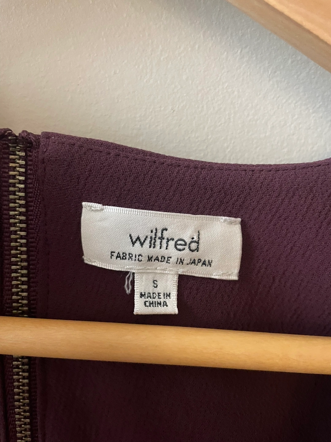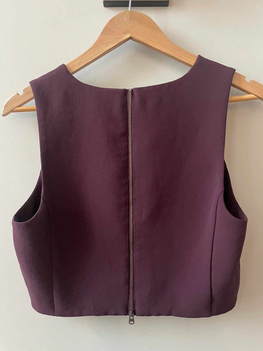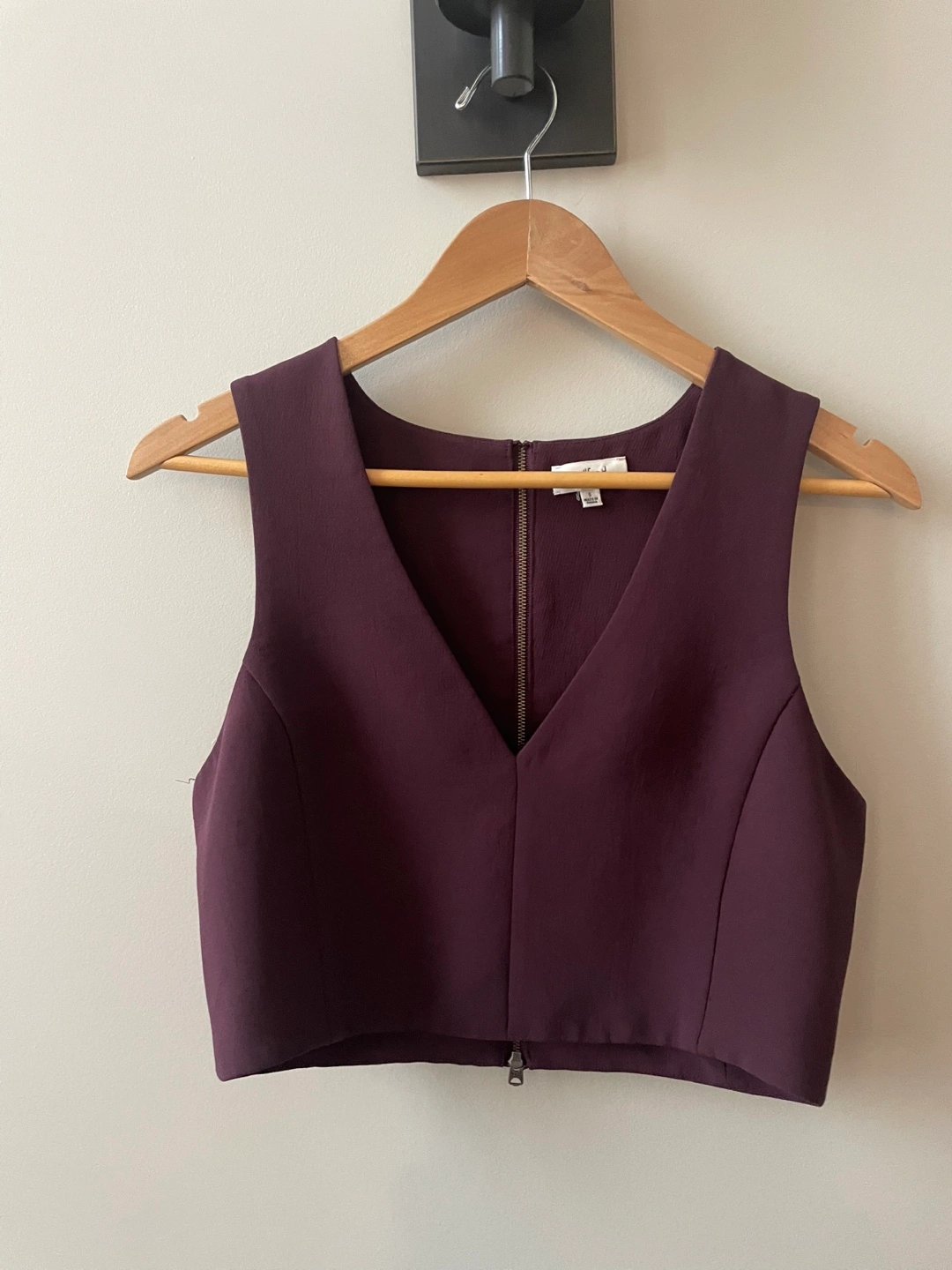 Wilfred (Aritzia) Sleeveless, v-neck crop top in a wine colour with full zipper back in brass. Style is Dauphine.
