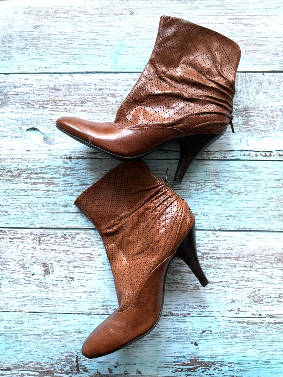 94Brown leather boots with a back zipper and a high heel. Perforated design. Never been worn