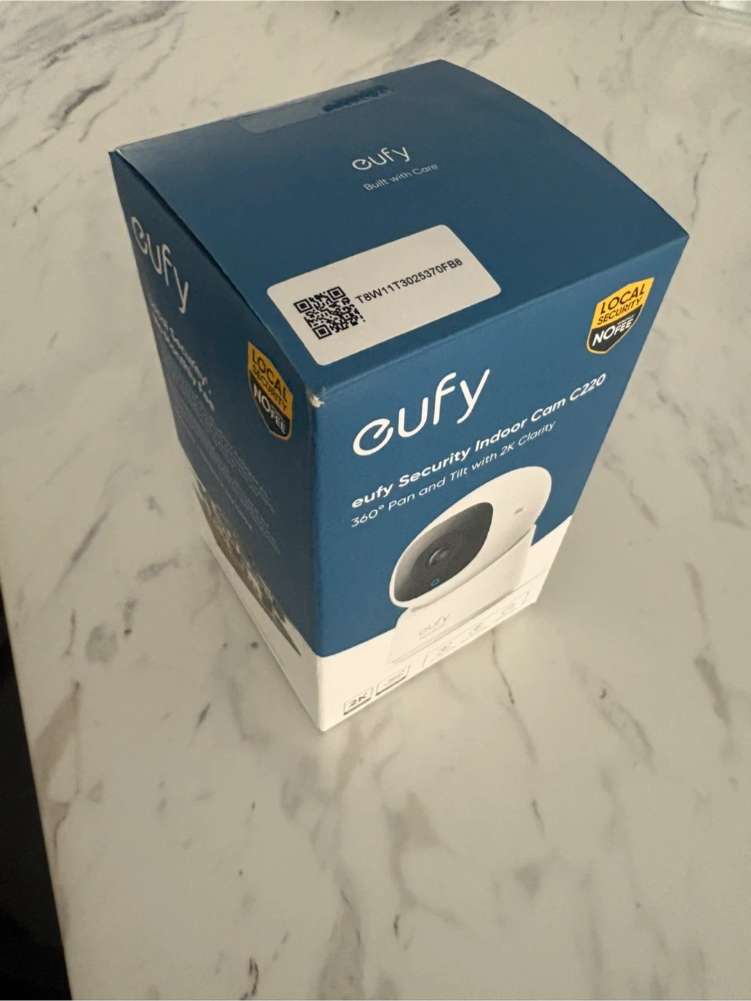 This is a new eufy Security Indoor Cam C220. It offers 360° pan and tilt with 2K clarity. It's designed for local security with no monthly fees. Includes original box.
