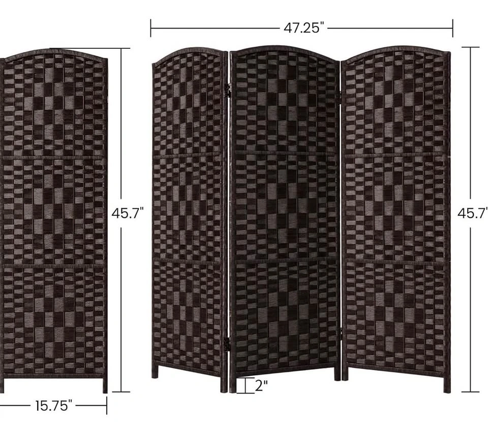 Stylish dark mocha room divider with a unique woven rattan design and 3 panels. Two-way hinged for easy configuration. Hand crafted, no assembly needed. Super easy to move and space-saving when folded. Measures approx 47.25in wide and 45.7in tall. Each panel is 15.75in wide. Great for privacy or dividing spaces. Condition: Brand New. Only opened to take photos, repackaged after photos. MRSP: $170.99. $45 OBO. Pickup is Oshawa or Scarborough. If ad is up, item is available.