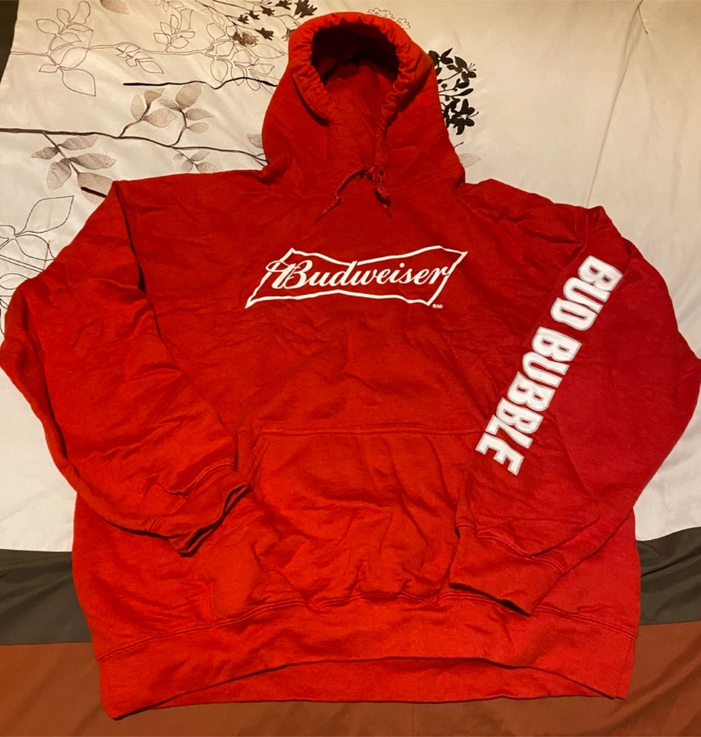 This is a red Budweiser hoodie with "Bud Bubble" printed on the sleeve. It's a pullover style with a front pouch pocket and a drawstring hood. It's made from a comfortable fabric, perfect for casual wear.