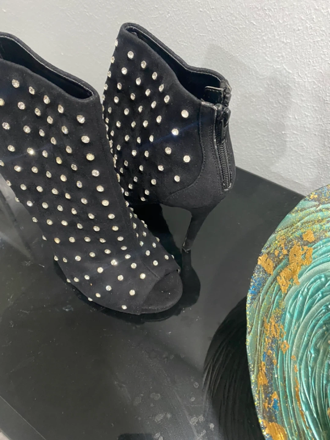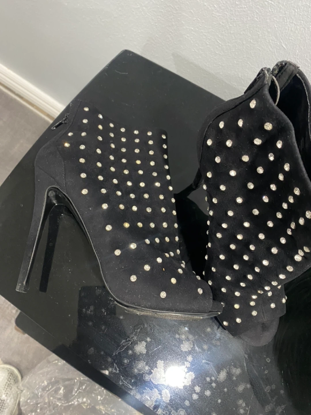 Black Suede Rhinestone Studded Peep-Toe Ankle Boots
