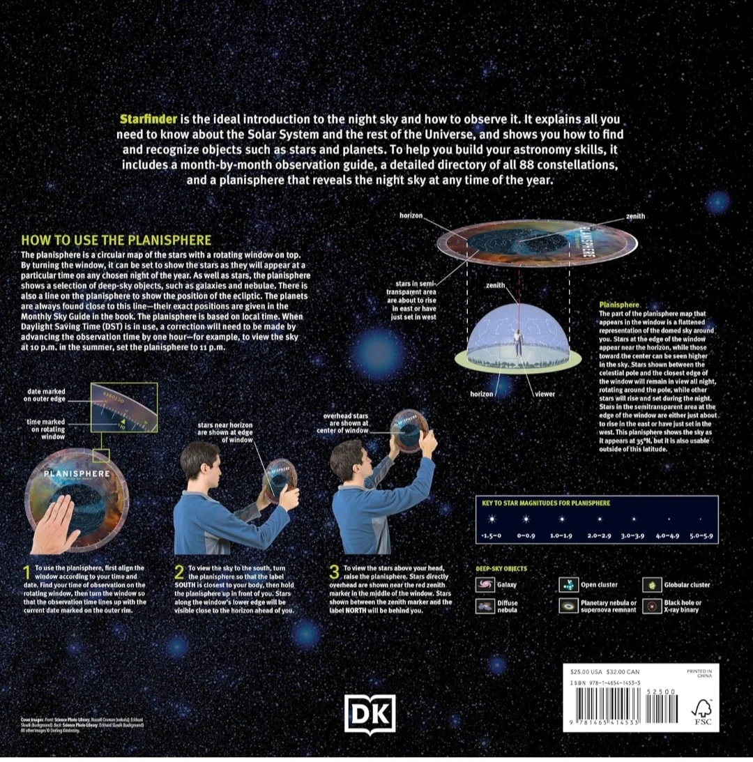 A complete beginner's guide to exploring the night sky. It explains how to find and recognize objects such as stars and planets. Includes a month-by-month observation guide, a detailed directory of all 88 constellations, and a planisphere that reveals the night sky at any time of the year. Great for stargazing beginners!