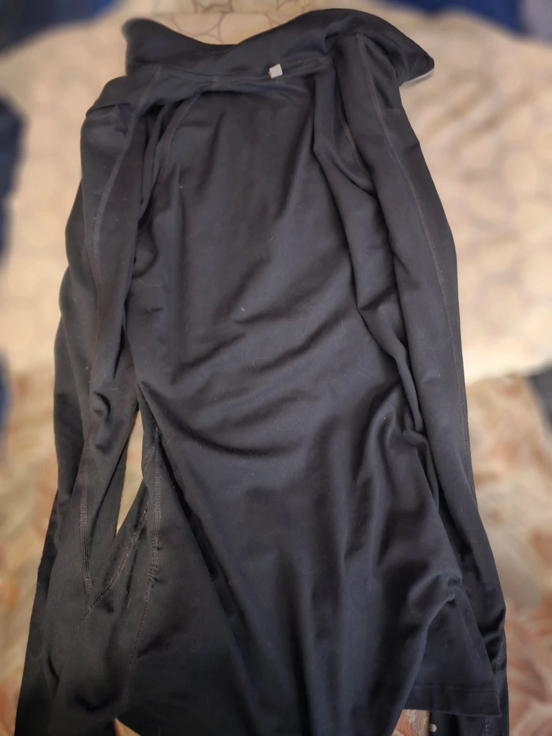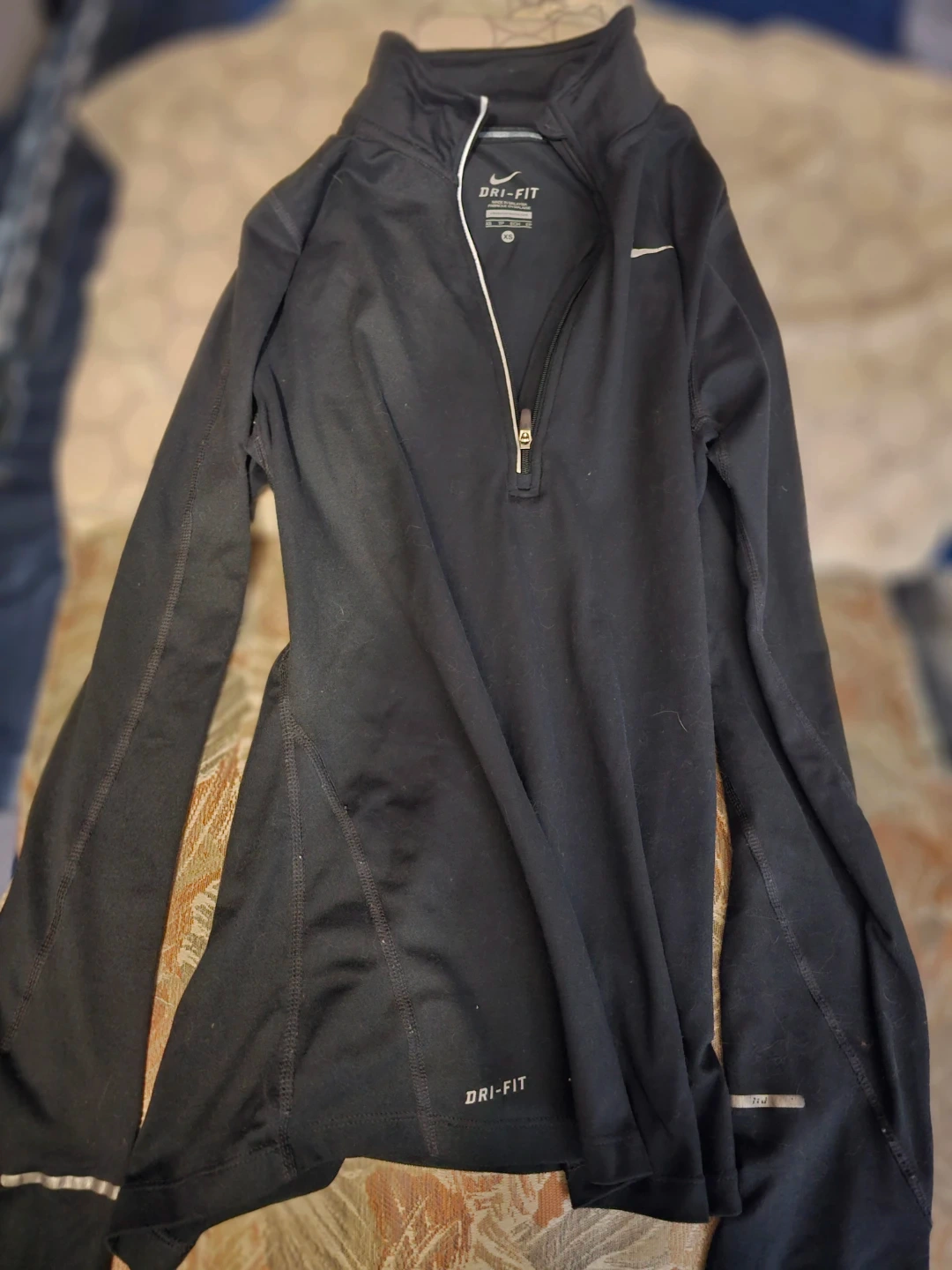 This is a Nike Dri-FIT long-sleeve shirt. It's a size XS and made in Malaysia. The material wicks moisture for comfort during activity.