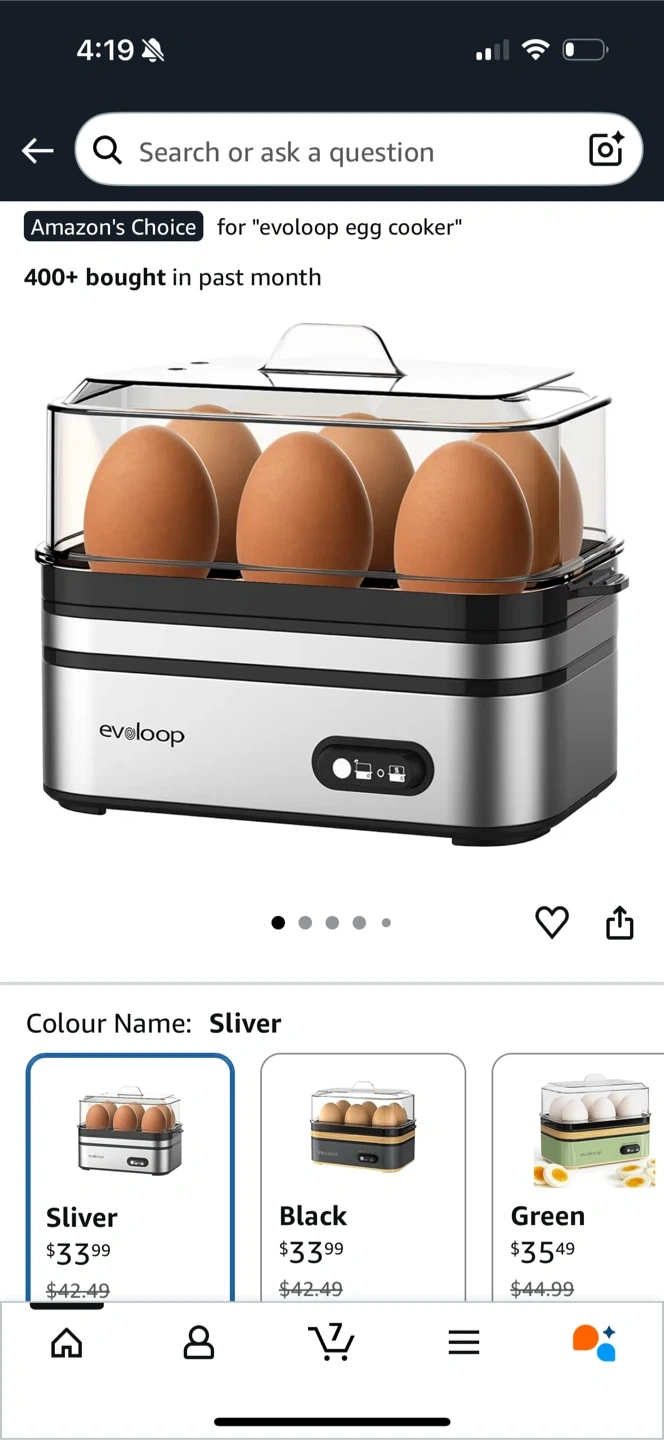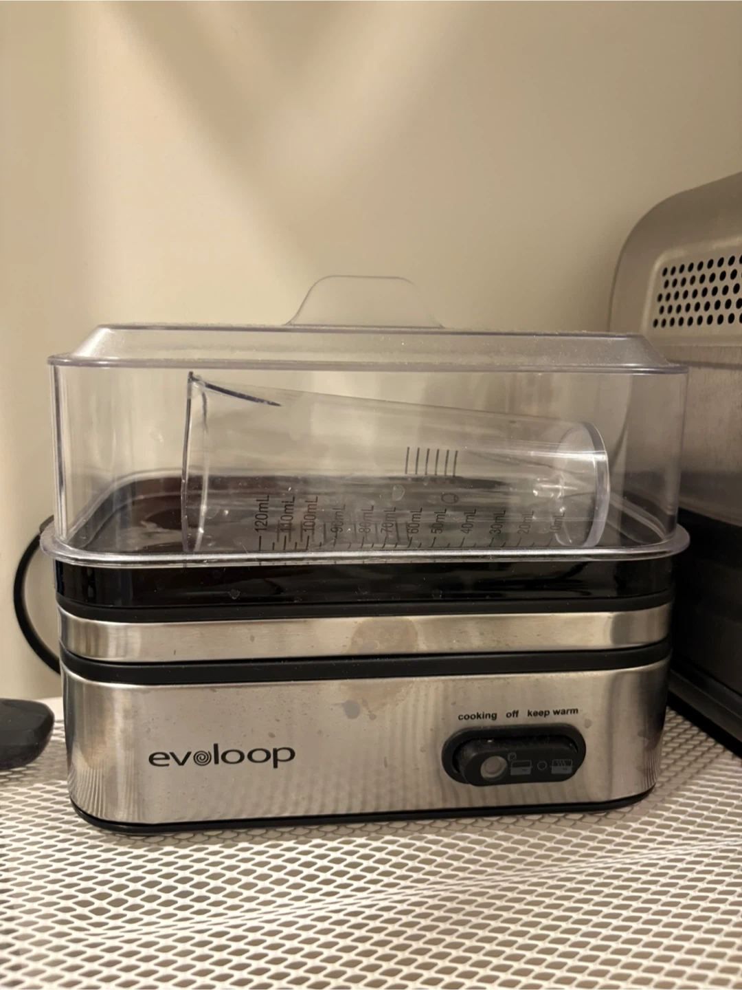 This is an Eveloop egg cooker in silver. It comes with a measuring cup for water. It has settings for cooking and keeping warm.