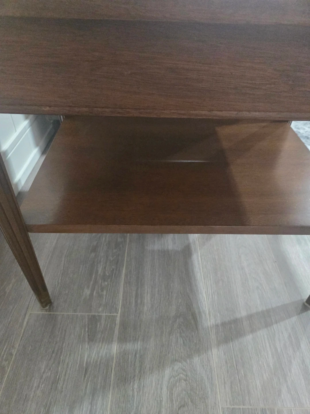 This is a vintage wood end table with a single drawer. It features a lower shelf for extra storage. The wood has a classic finish and decorative carvings on the legs.
