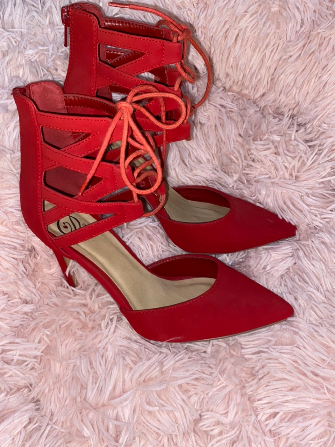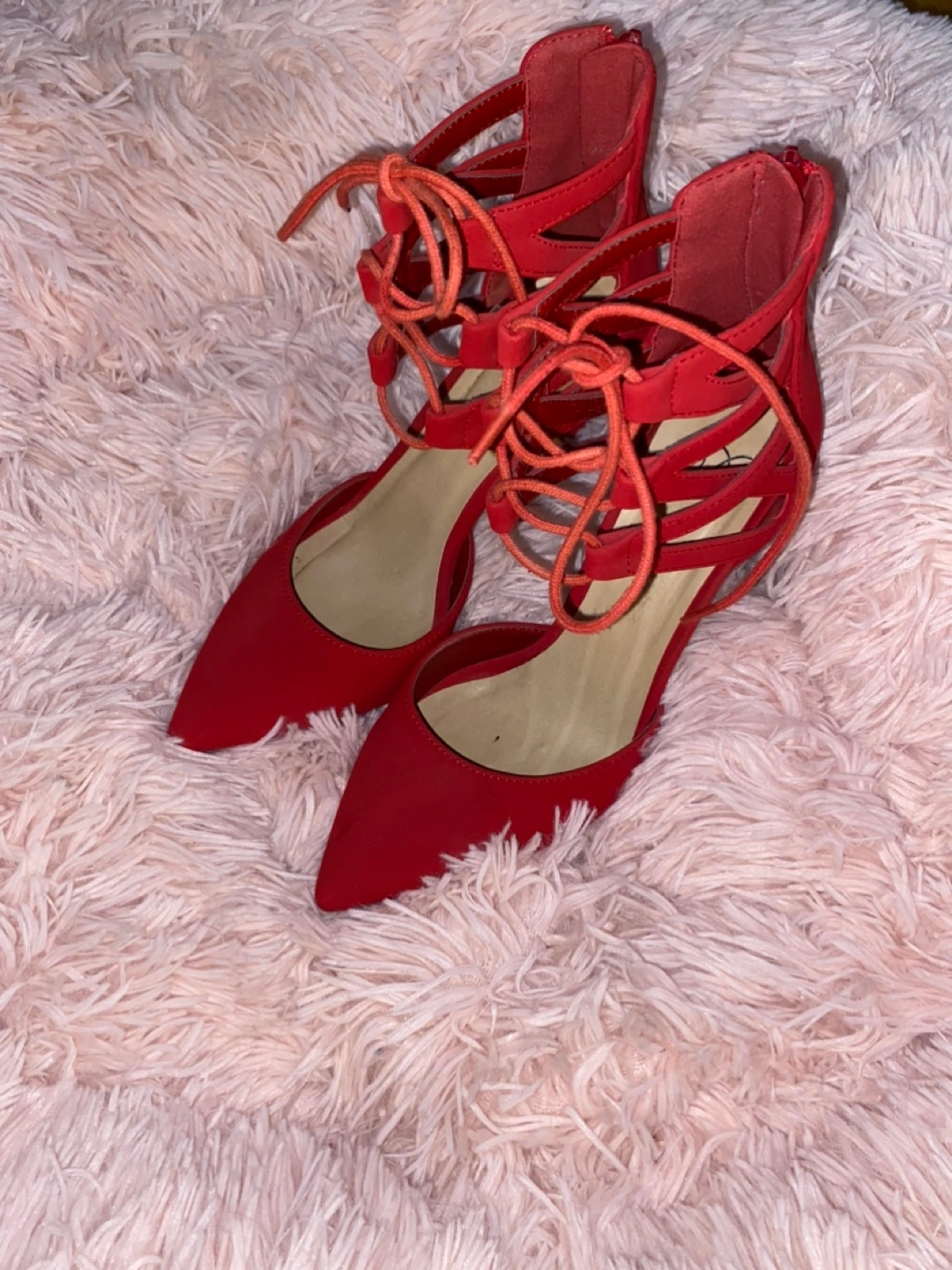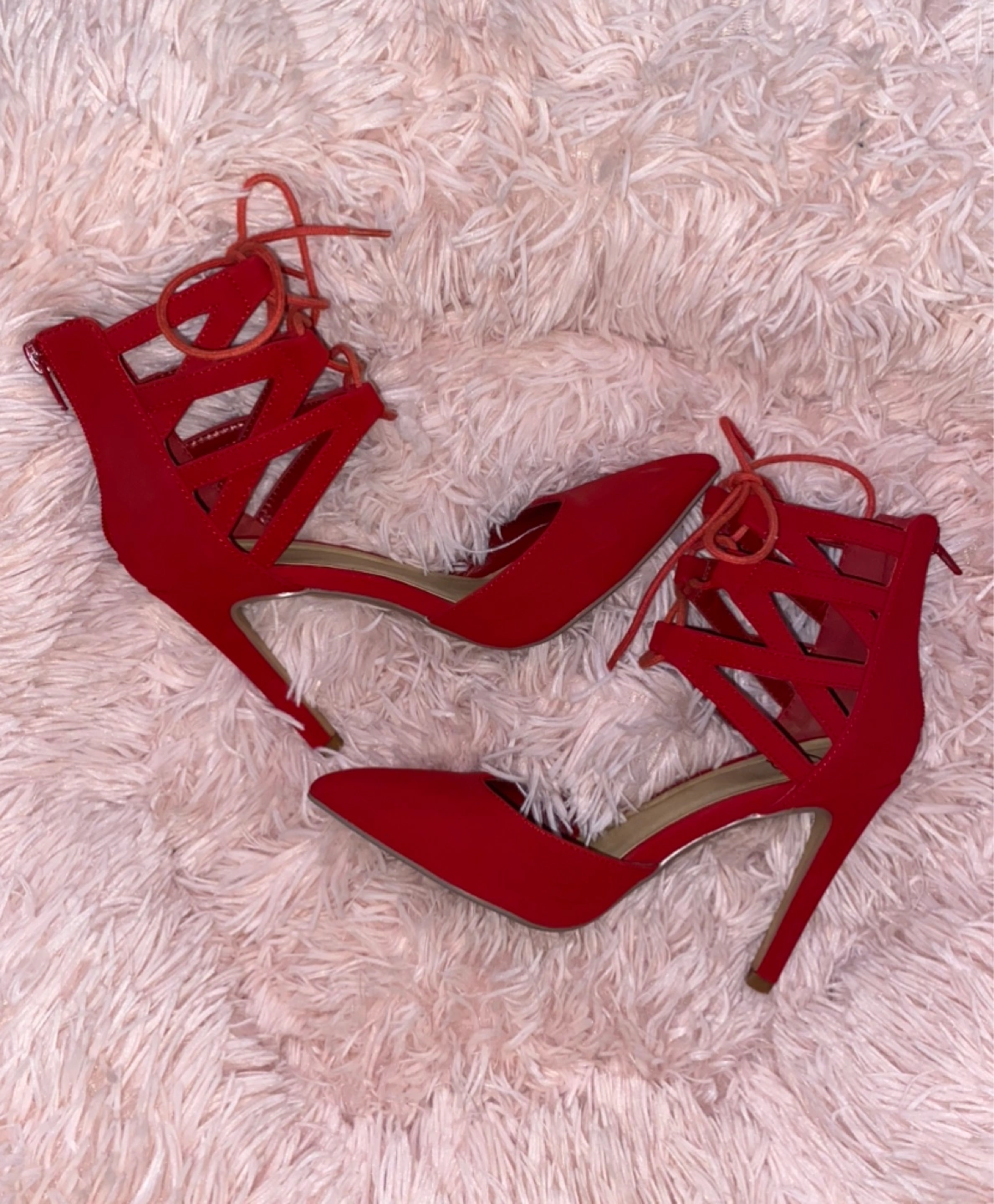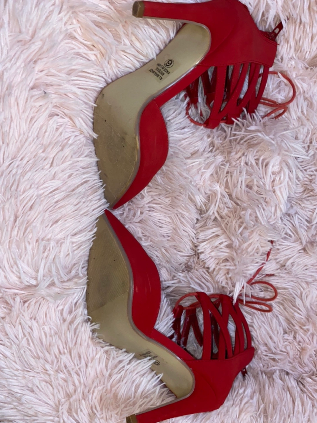 Stunning 4 inch red heels. They feature straps and a zip at the back.