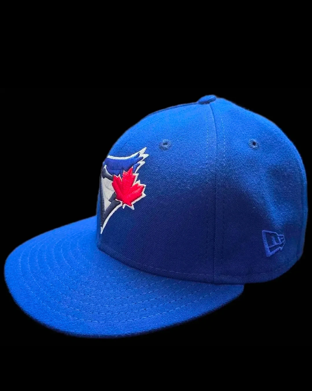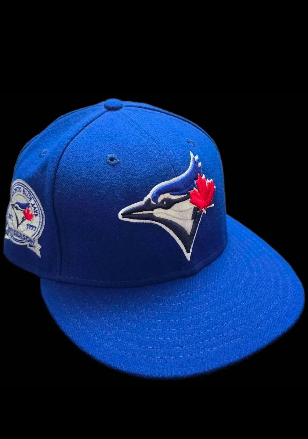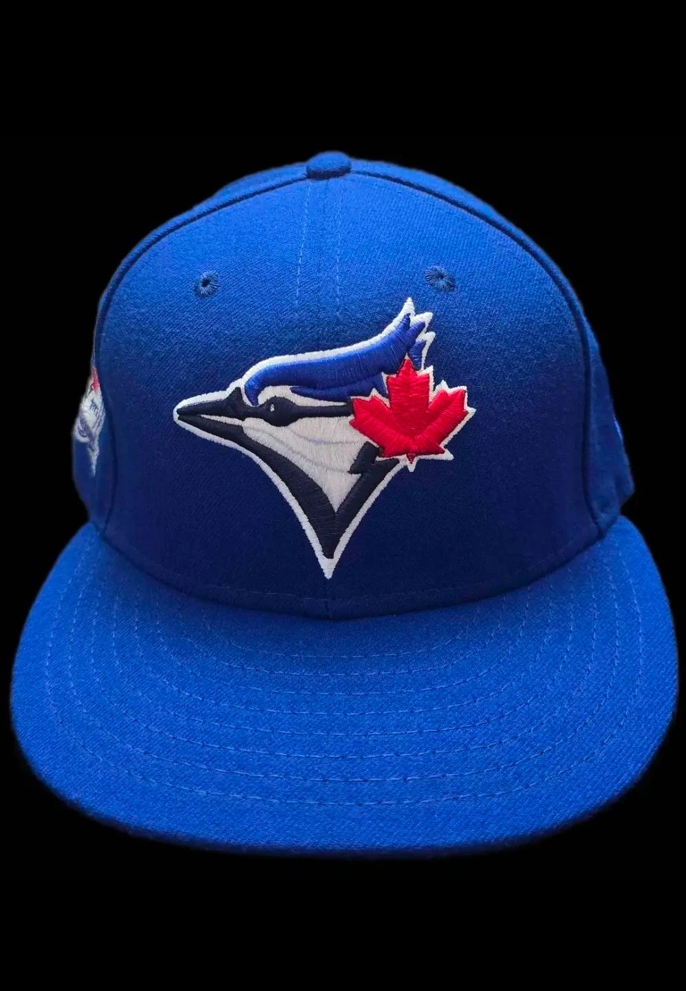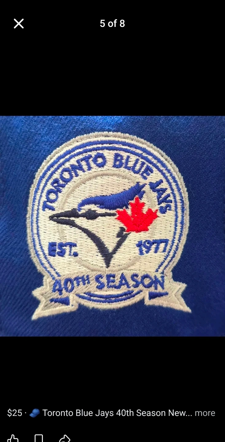 This is a Toronto Blue Jays 40th season baseball cap. It features the team's logo embroidered on the front. It's made of fabric and has an adjustable strap for a comfortable fit. This cap is great for any fan!