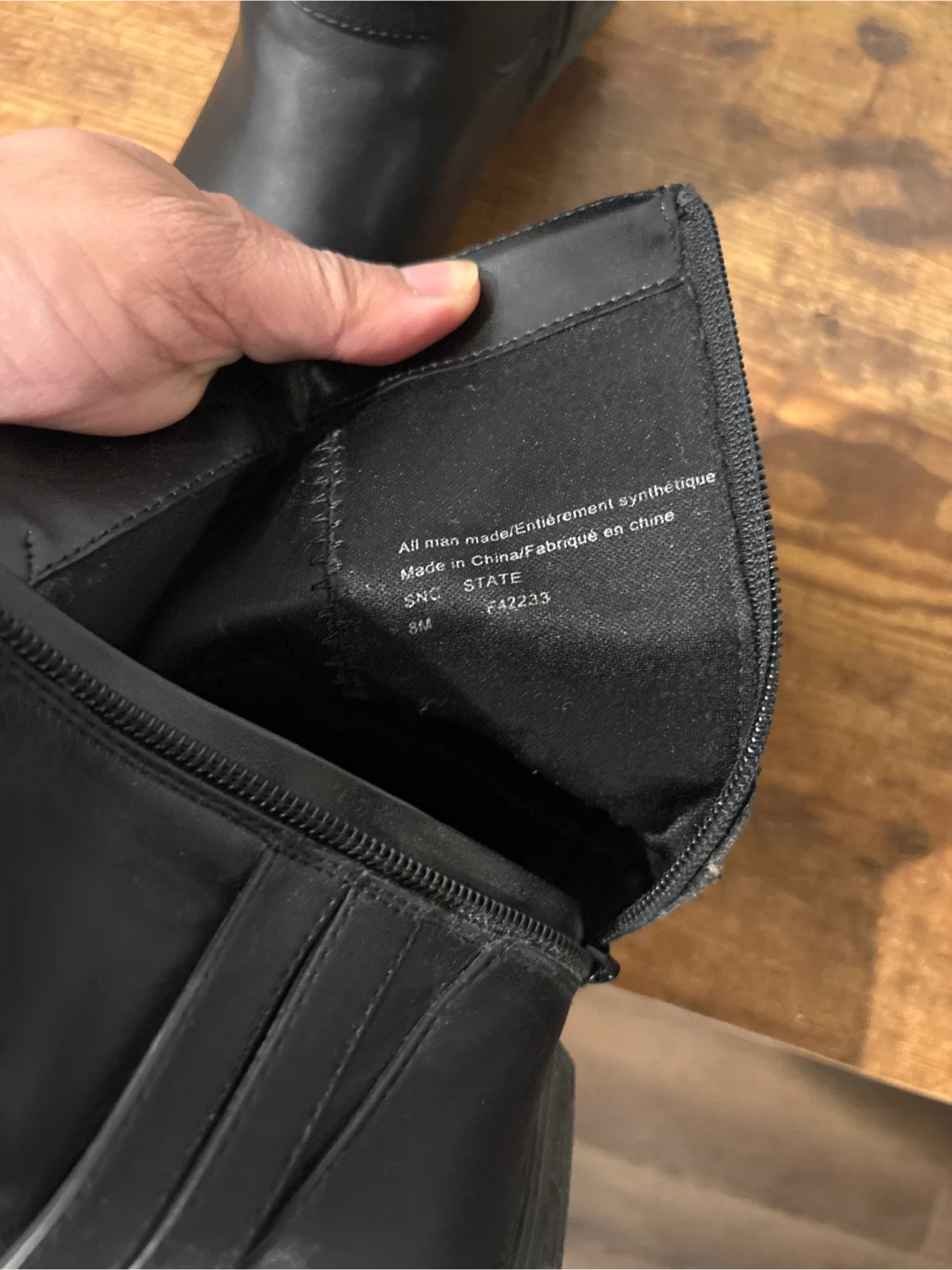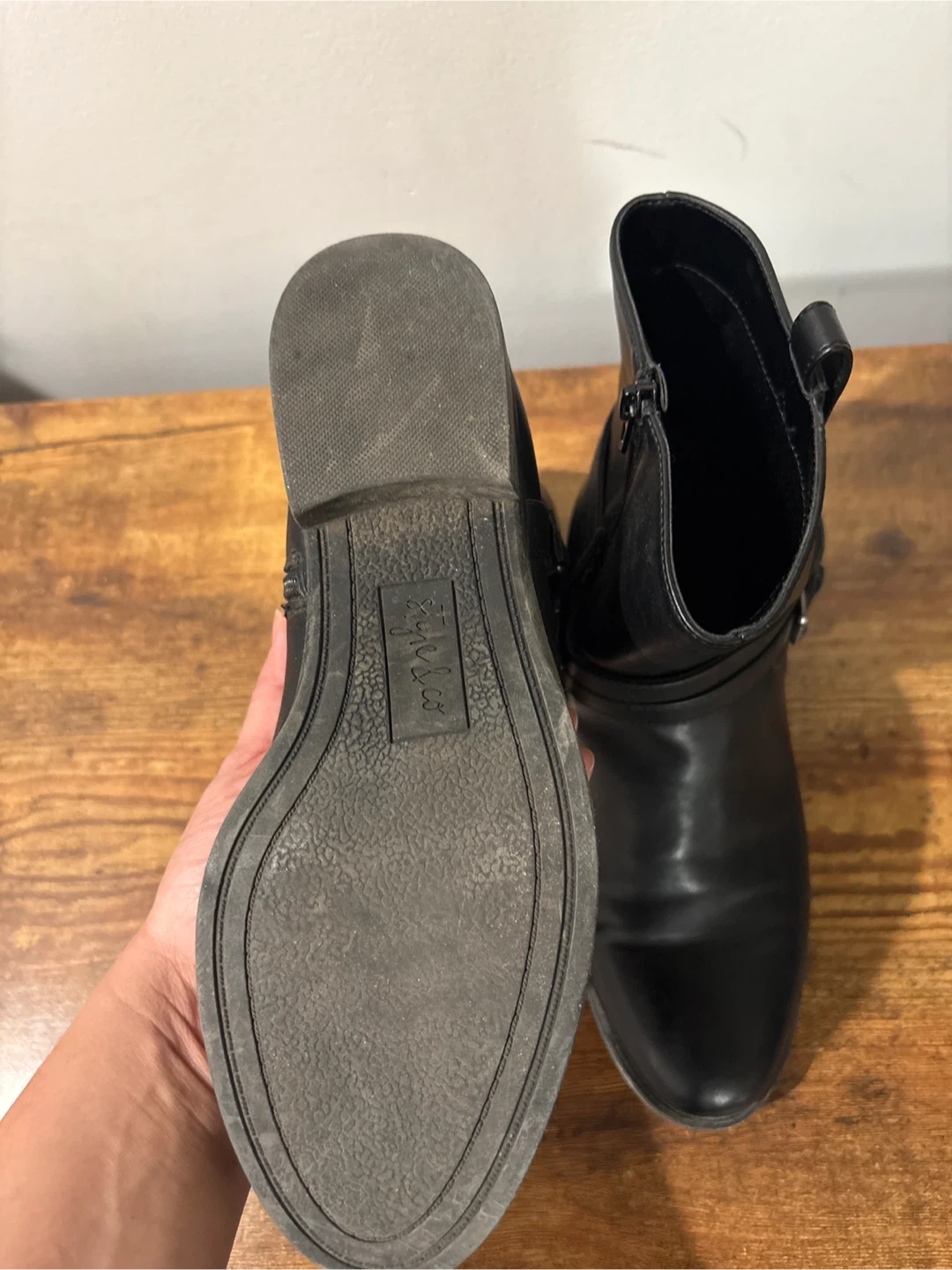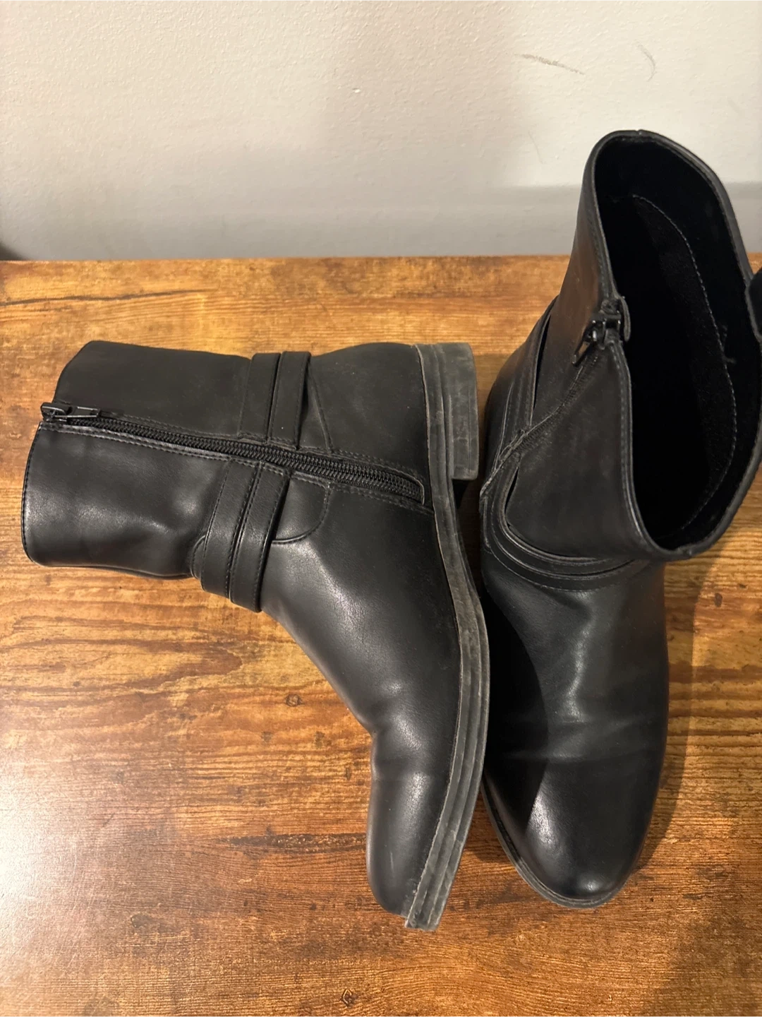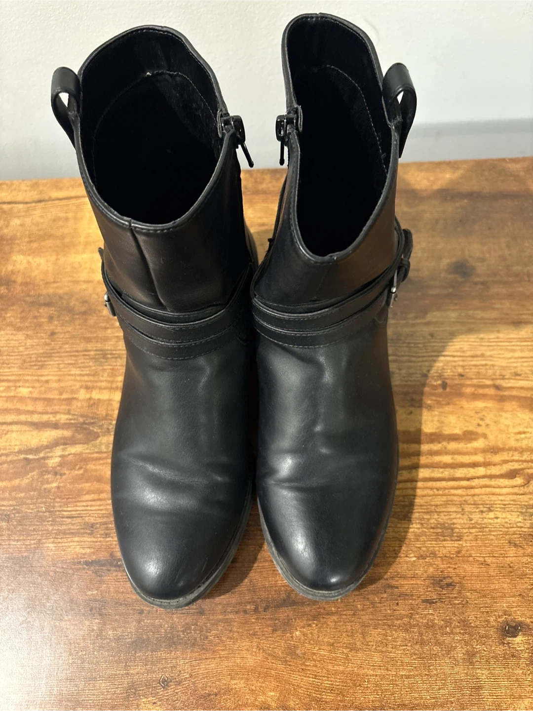Black faux leather ankle boots from Style & Co. They feature a side zipper and buckle accent. Size is 8M. These boots are great for everyday wear!